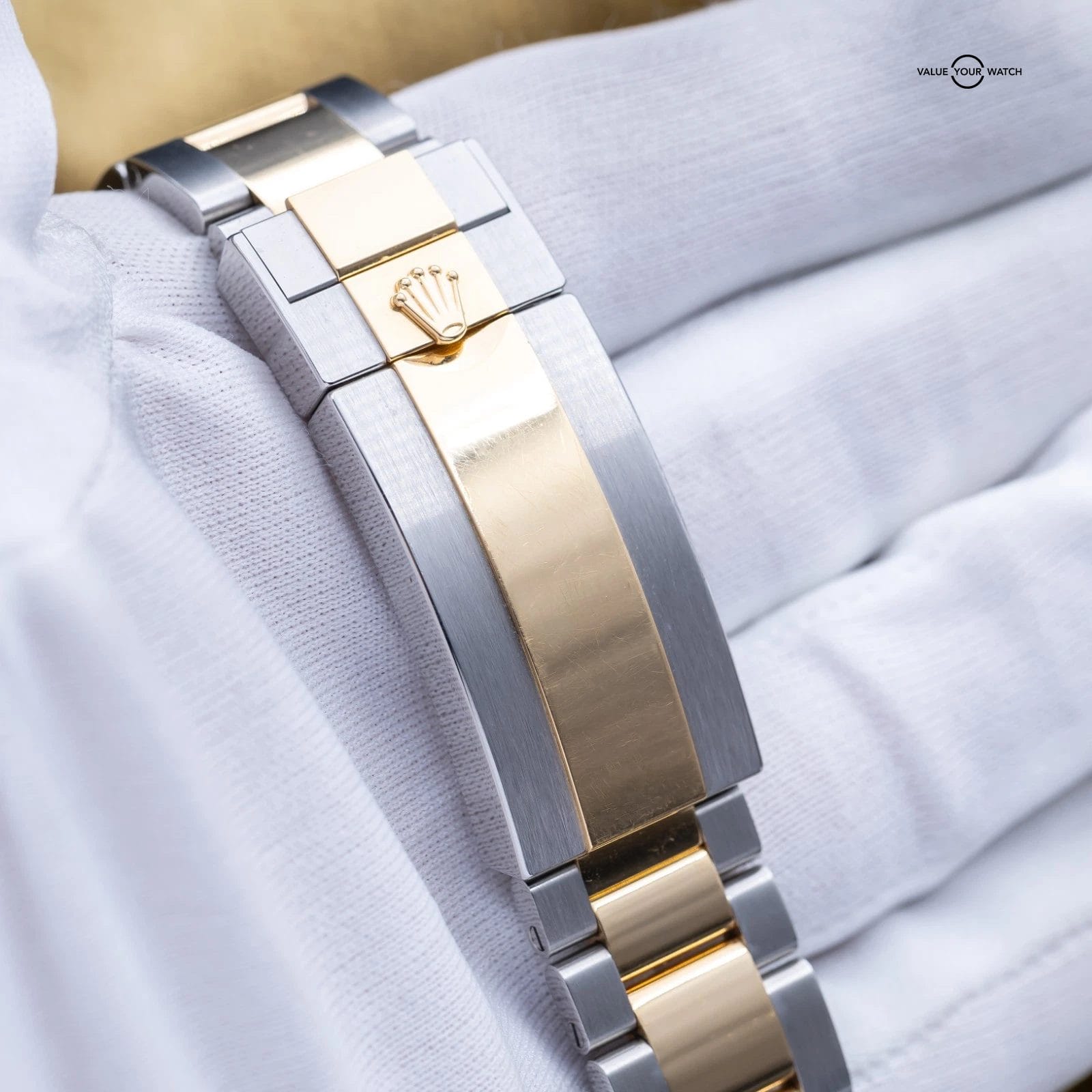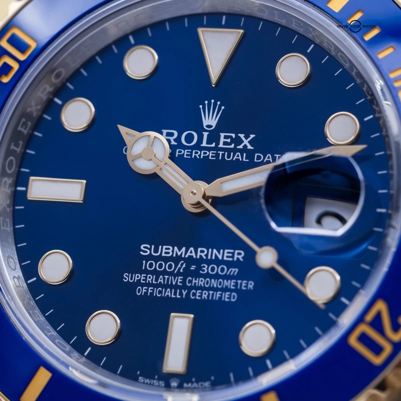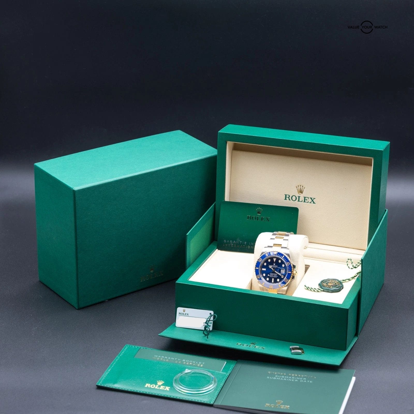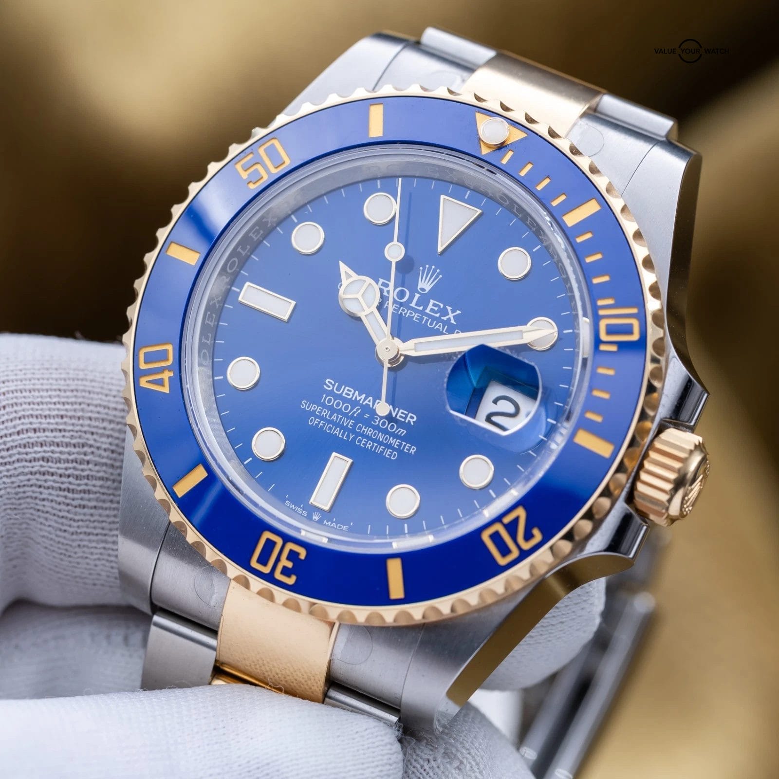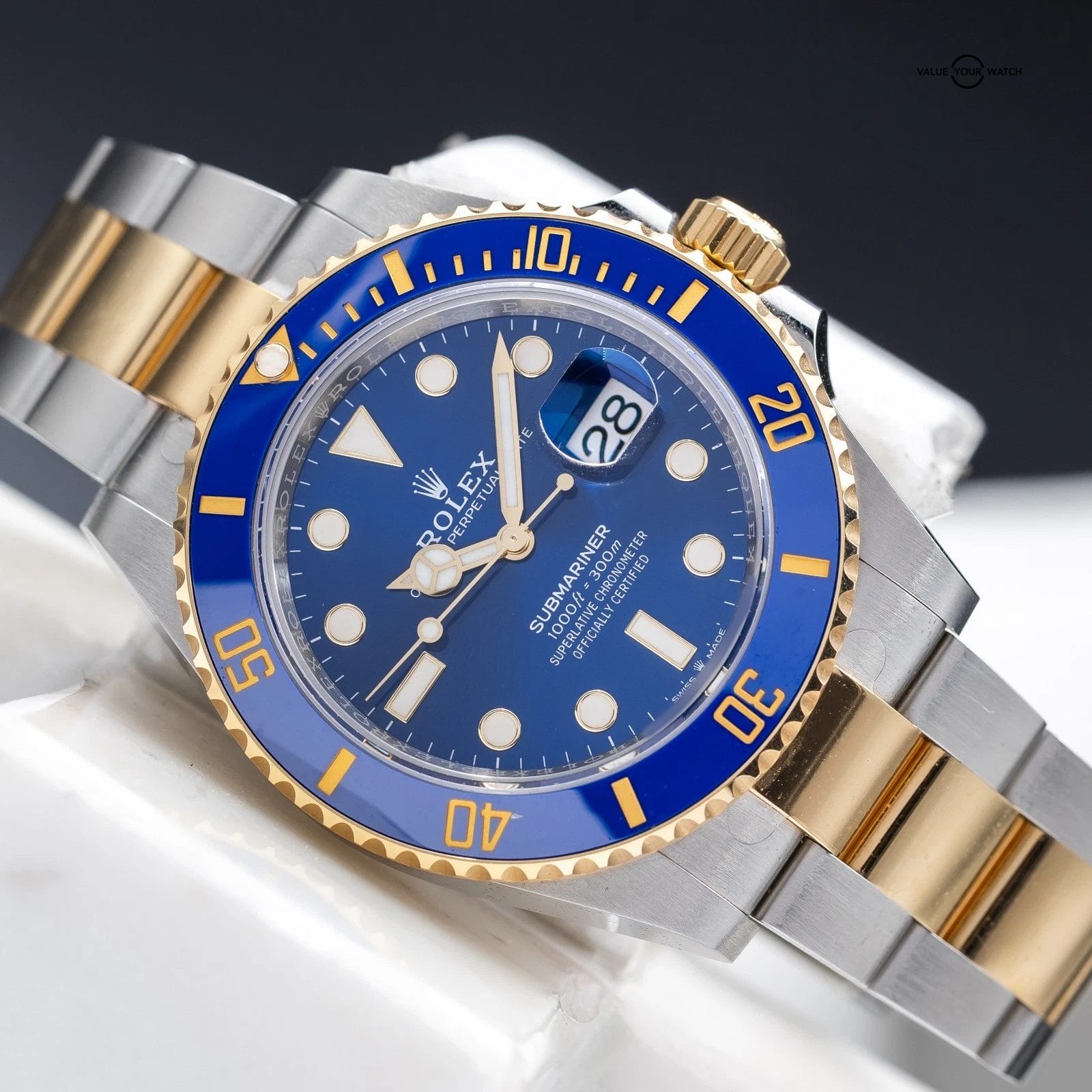 The Rolex fan favorite blue dial and bezel two-tone Submariner date, or better known as the “Bluesy”. One of the best color combos Rolex has ever come out with. These things just pop off the wrist and stand out. This is the newer 41mm model you’ve been looking at, so come grab it while you can!