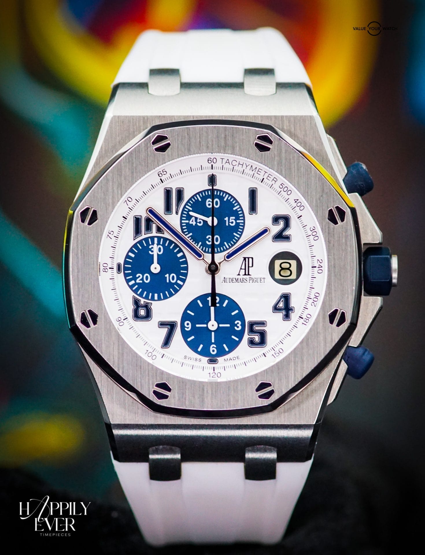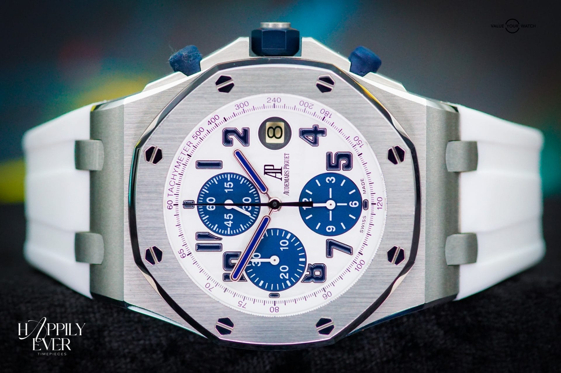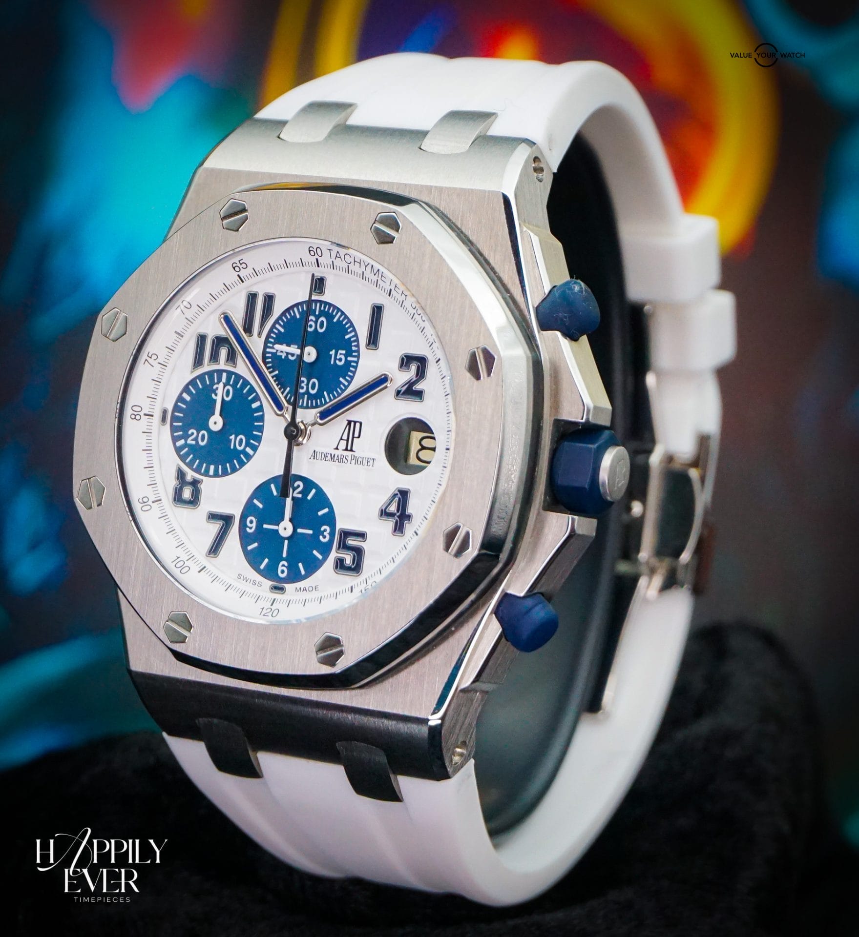 The contrasting white “panda” dial offers superb legibility, paired with a silver bezel and blue rubber strap that enhances its athletic aesthetic. An additional Horus strap is included, allowing for versatile styling and comfort. The Royal Oak Offshore’s signature octagonal bezel and exposed screws highlight AP’s distinctive design language, while the robust case ensures reliability during active wear.