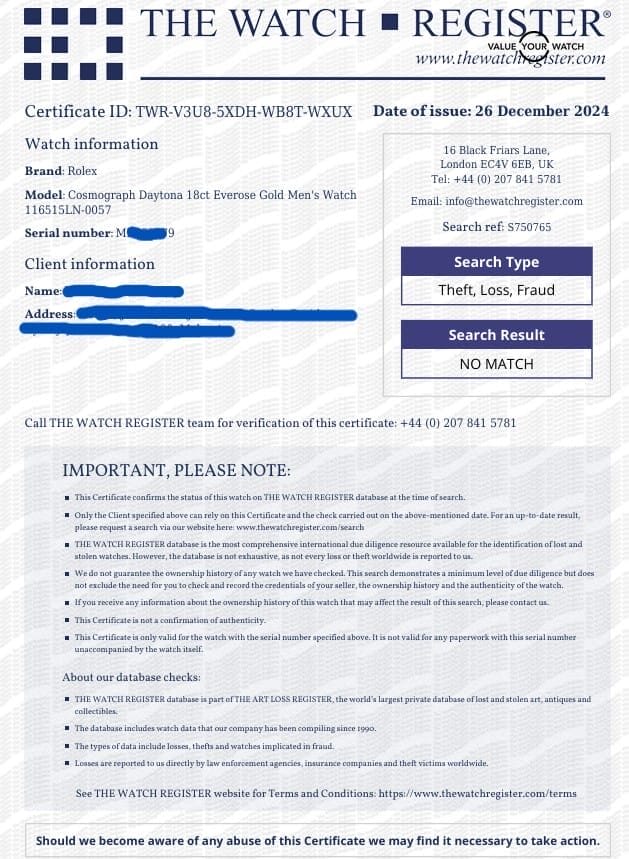 • With Papers: Yes, Watch Certificate from The Watch Register