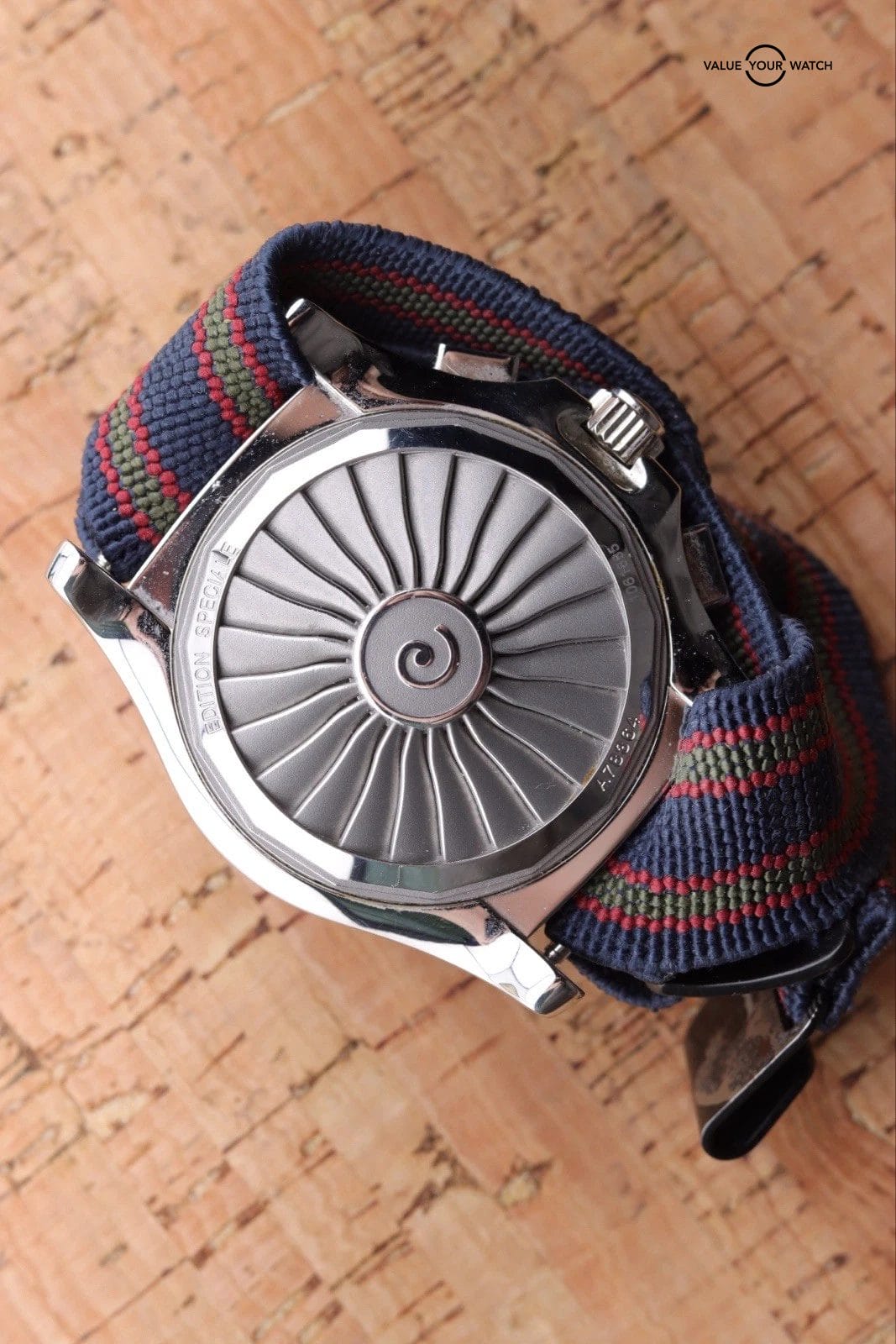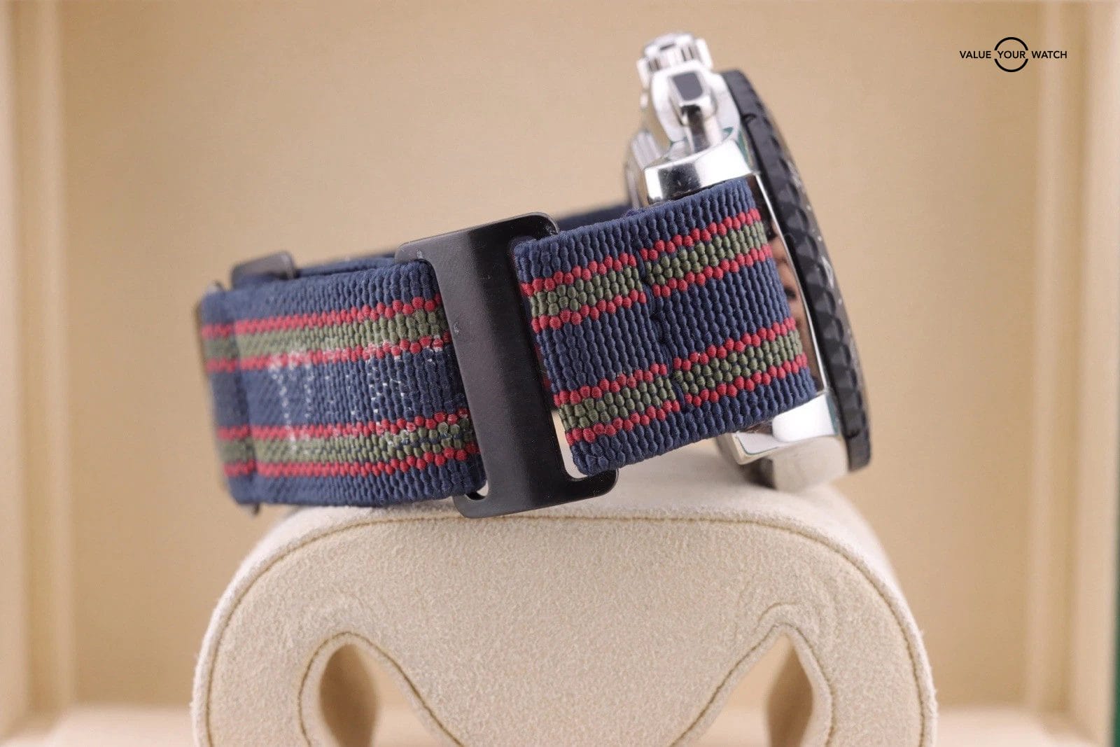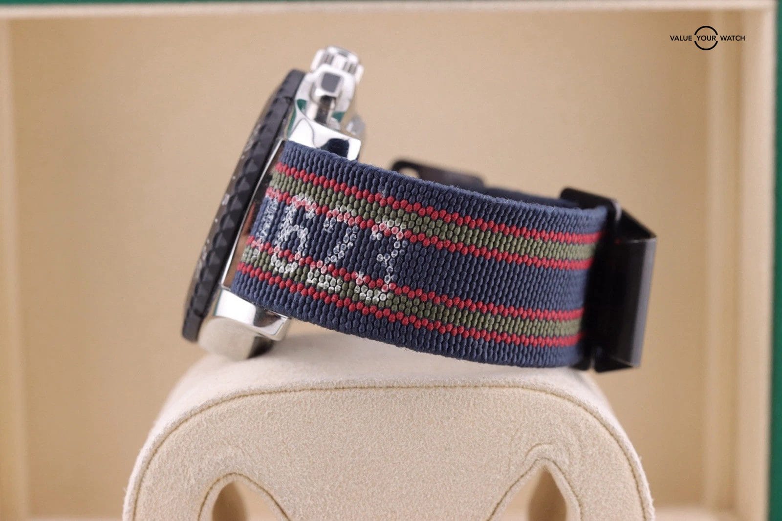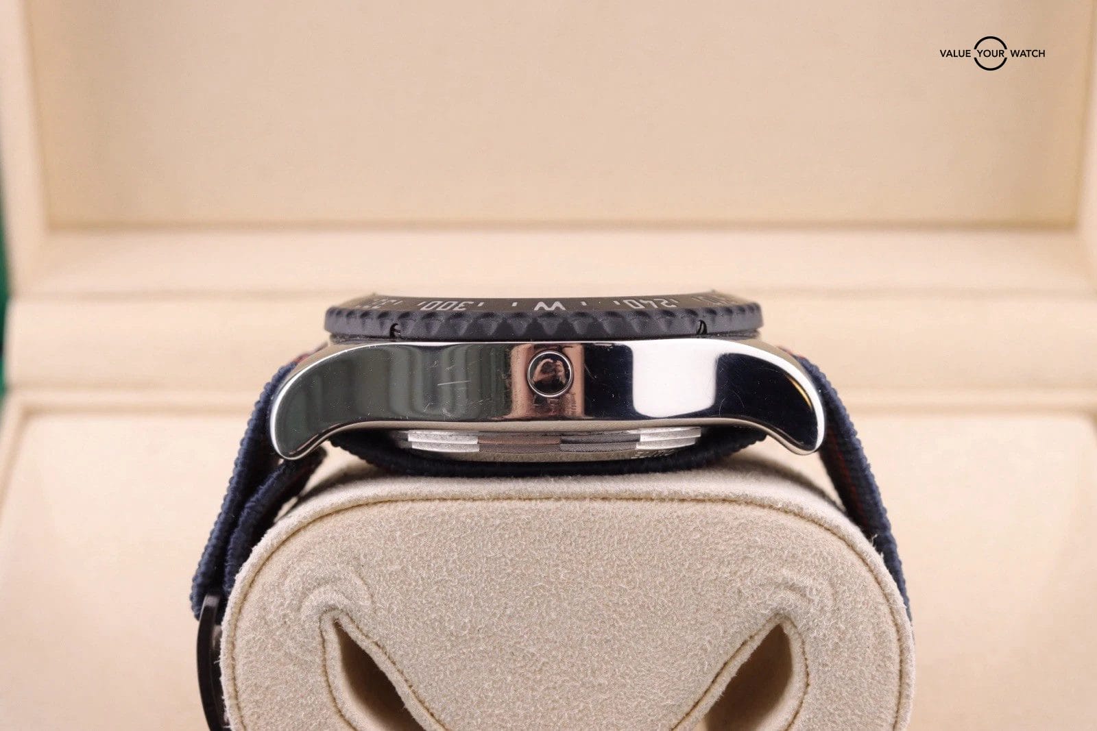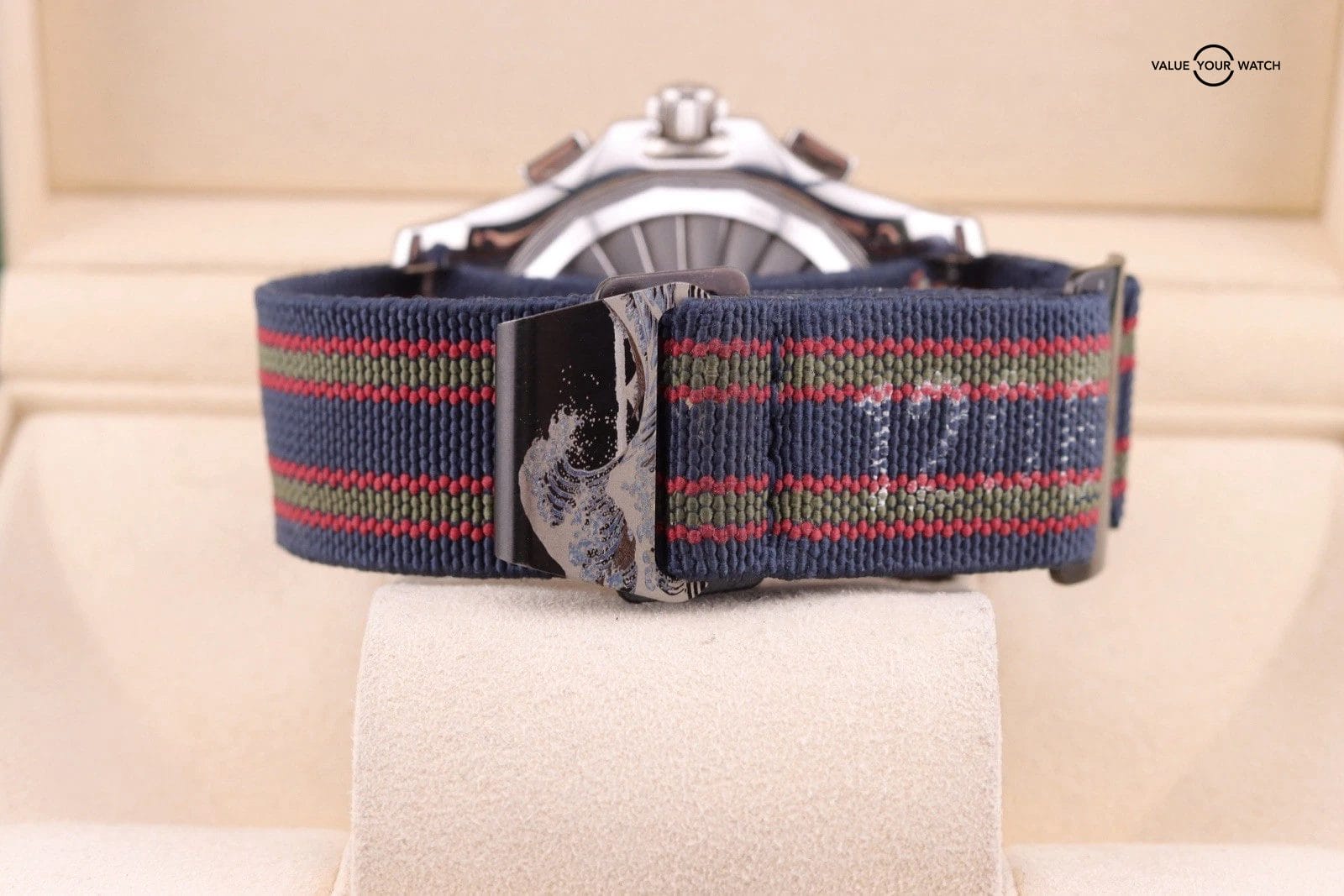 – Watch shows normal wear throughout. The crystal is clean. The dial is clean. There are light scratches in the case but nothing to deep. Movement runs and functions as it should. The aftermarket strap is in good condition and wears great with this watch.