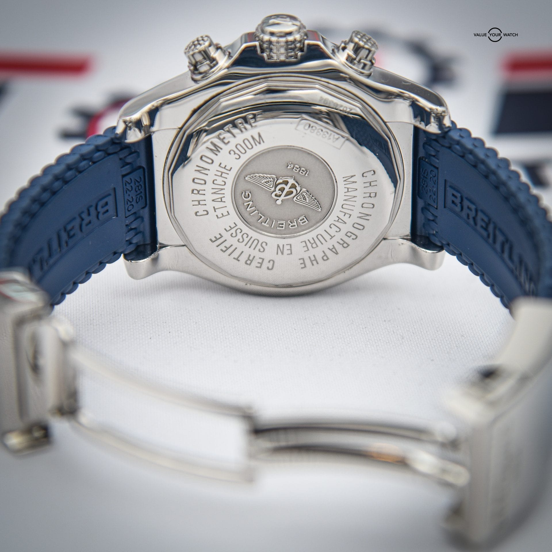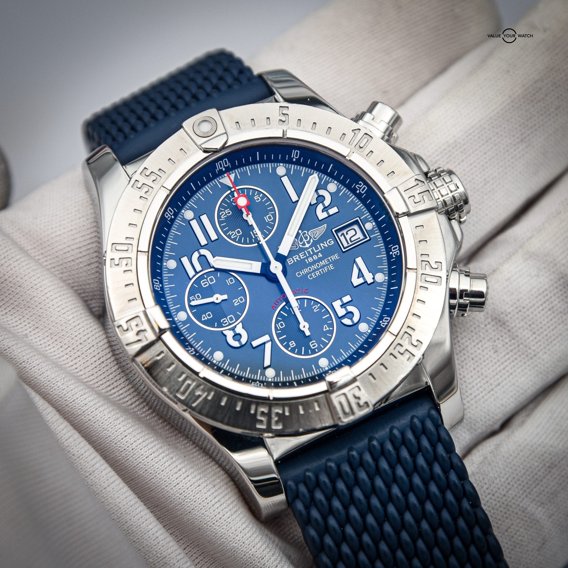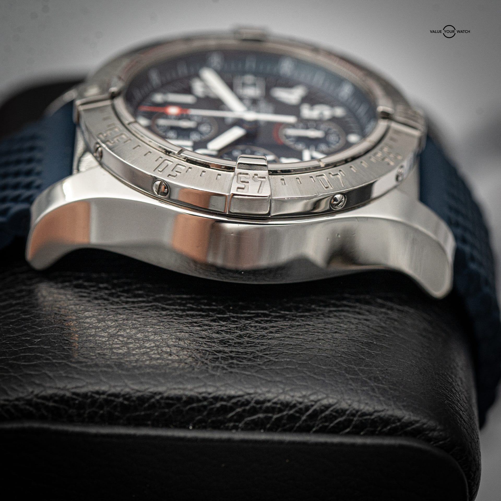 This example is in Excellent Condition (freshly polished) and comes as a Full Set, providing collectors a complete and well-presented Breitling Avenger experience. The blue dial and strap combination make this reference distinctive, offering both performance and style.