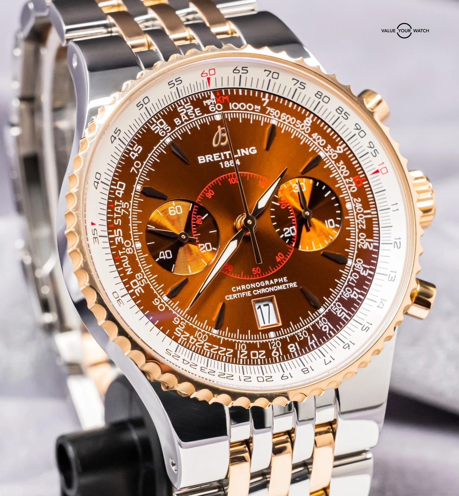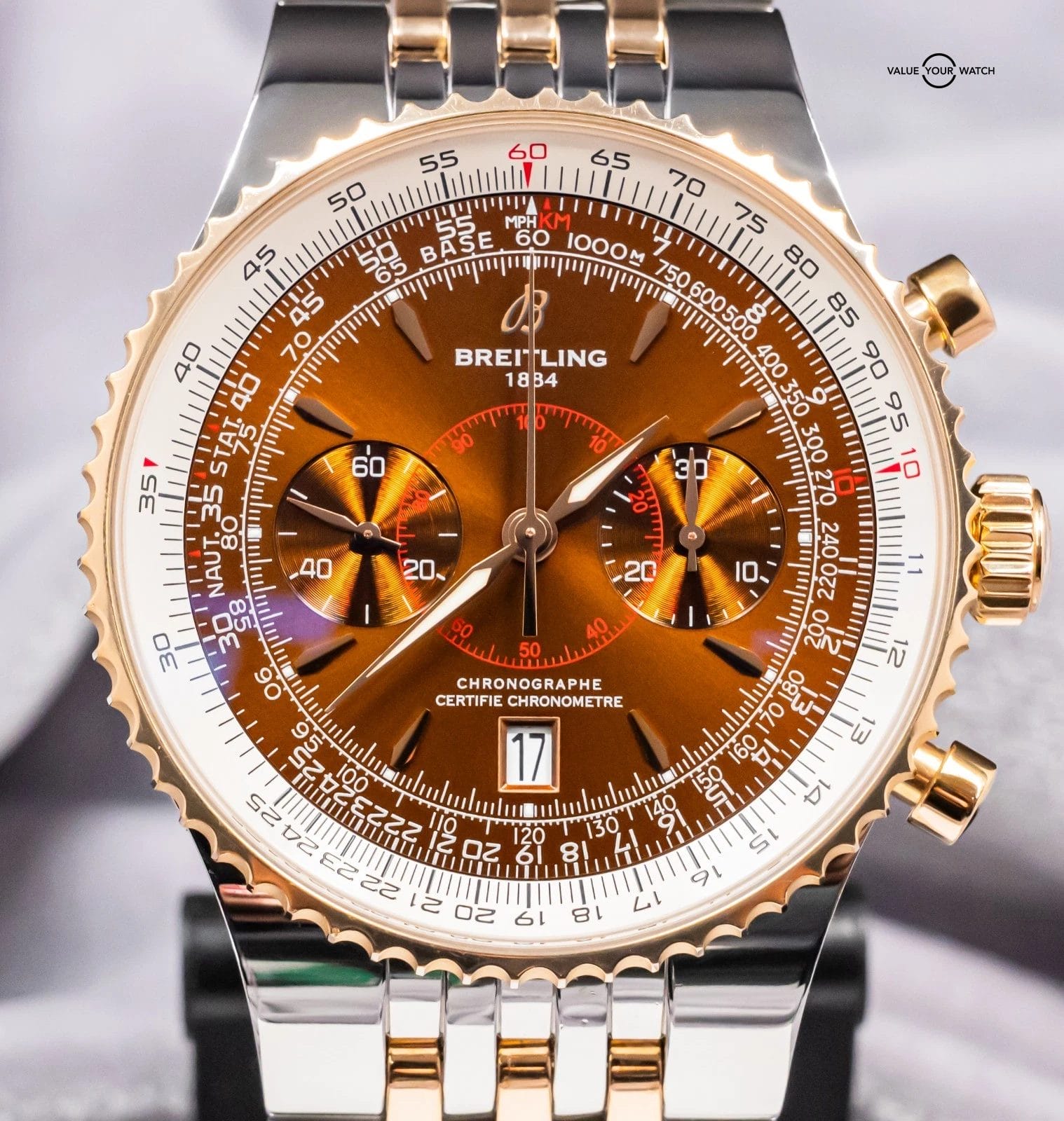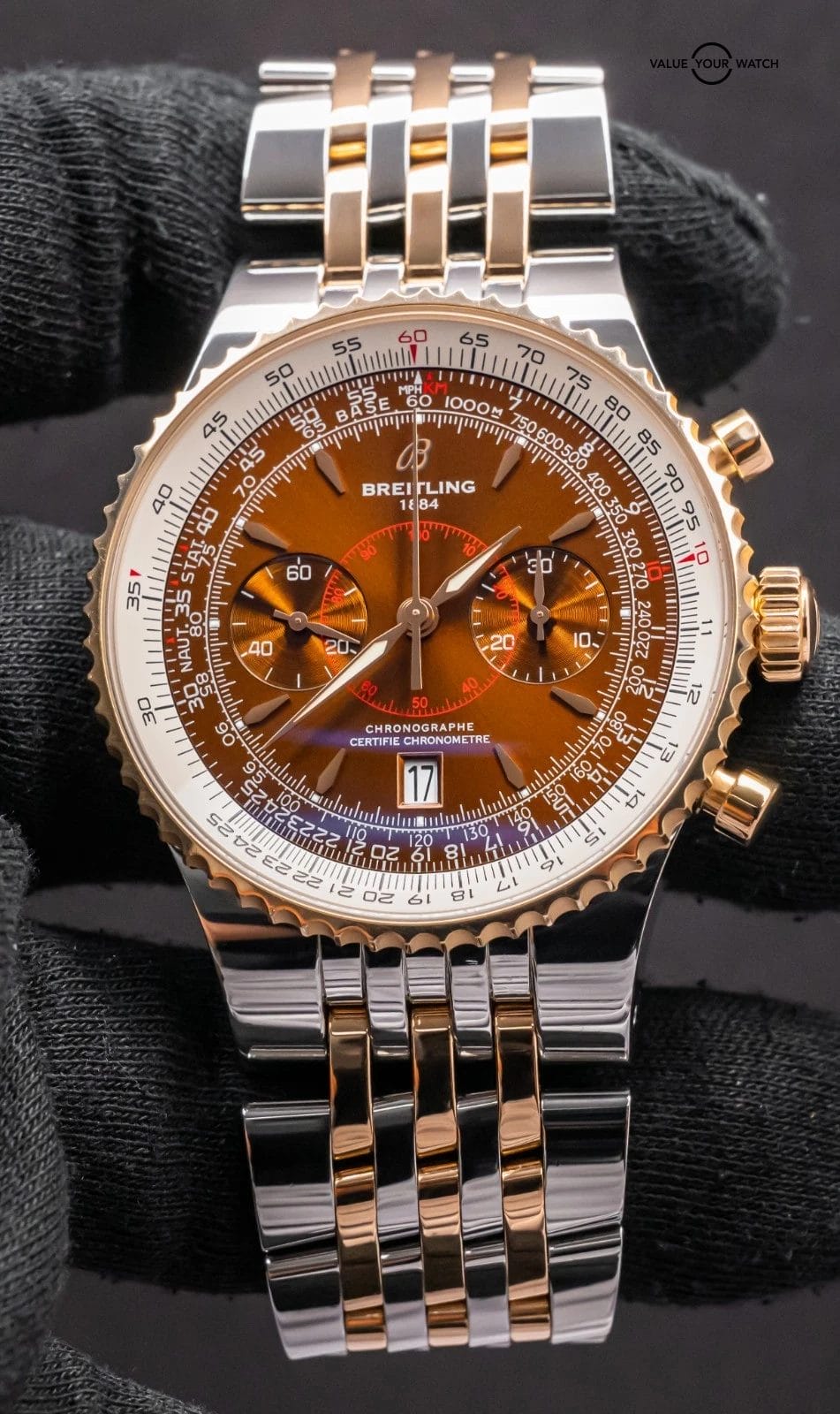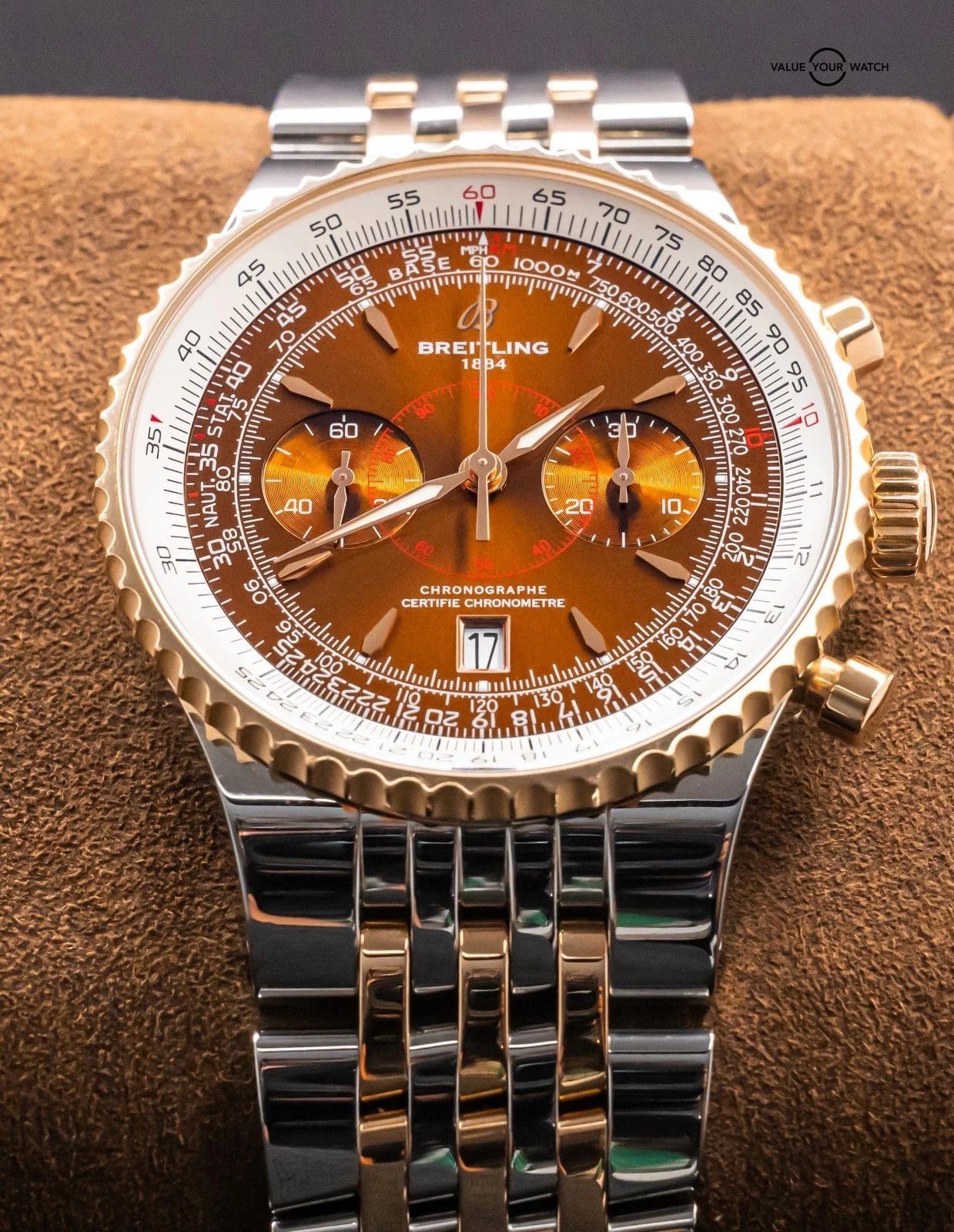 STRIKING Breitling Montbrillant Legende 47mm in Two-Tone 18K Rose Gold with Bronze Dial on Integrated Two-Tone Bracelet! Arrives as a complete set with the original Breitling boxes and papers including the international warranty booklet, serialized COSC certificate, maintenance booklet, and manual. Originally purchased from a Breitling Authorized Dealer in February 2011. This is an incredibly rare find, I have only owned three other Two-Tone Montbrillant Legende in the past nine years, and one was a complete set, never another Bronze Dial! Currently the only one for sale nationally with the black dial. This Montbrillant is similar to the Navitimer, it’s essentially a larger Navitimer at 47mm with the Integrated Bracelet and Classic Montbrillant Dial. Pretty incredible watch on wrist!