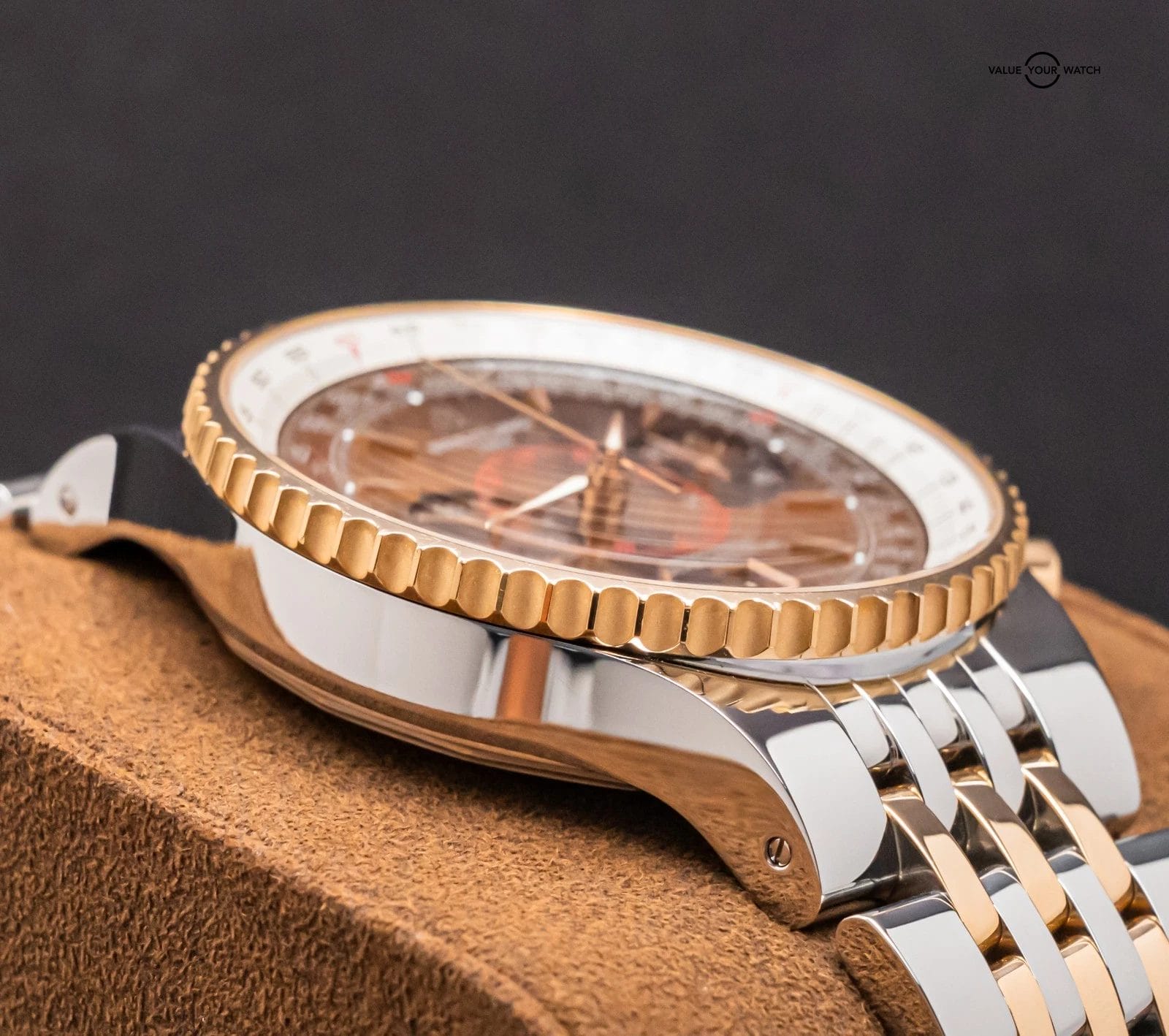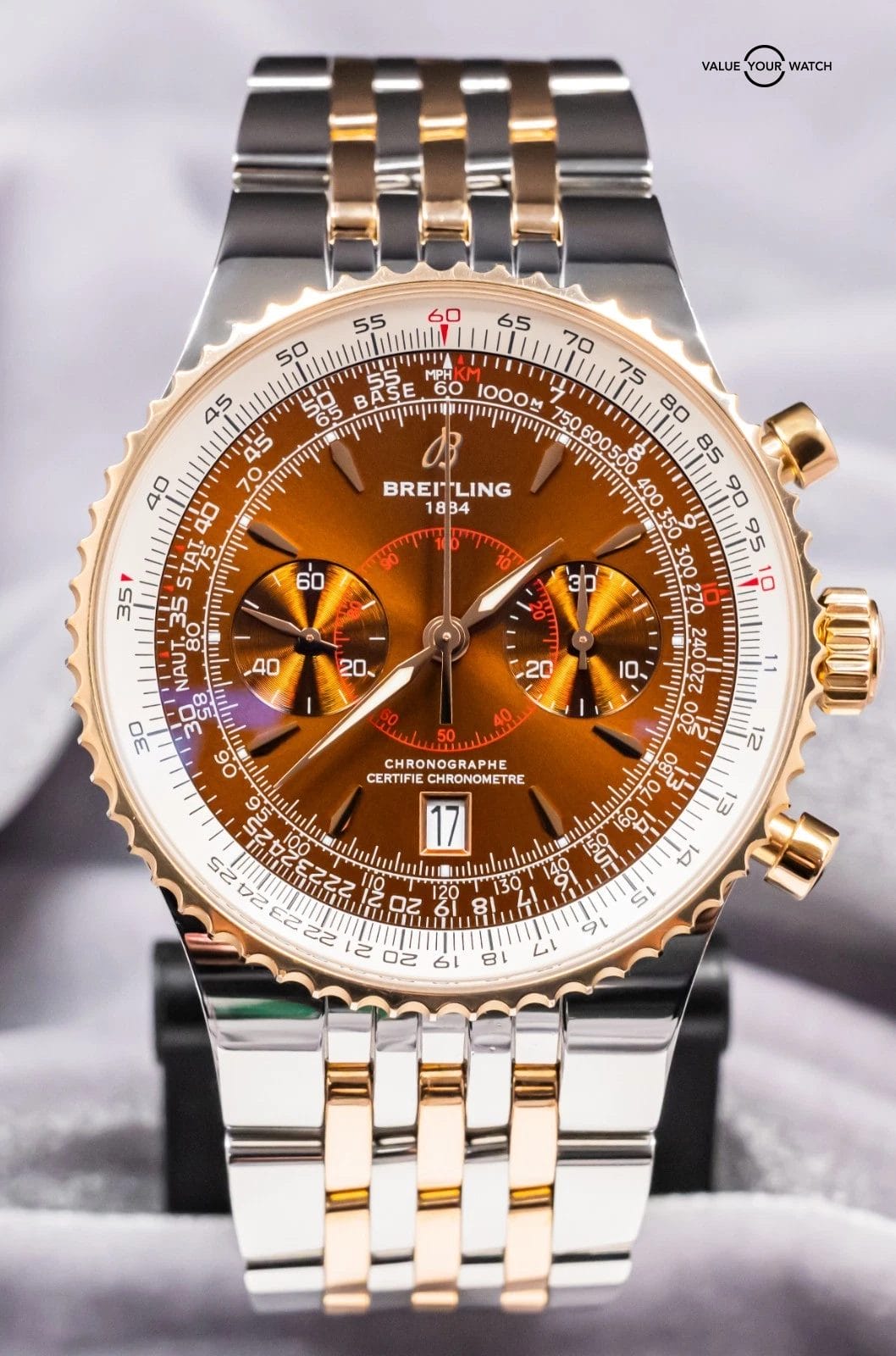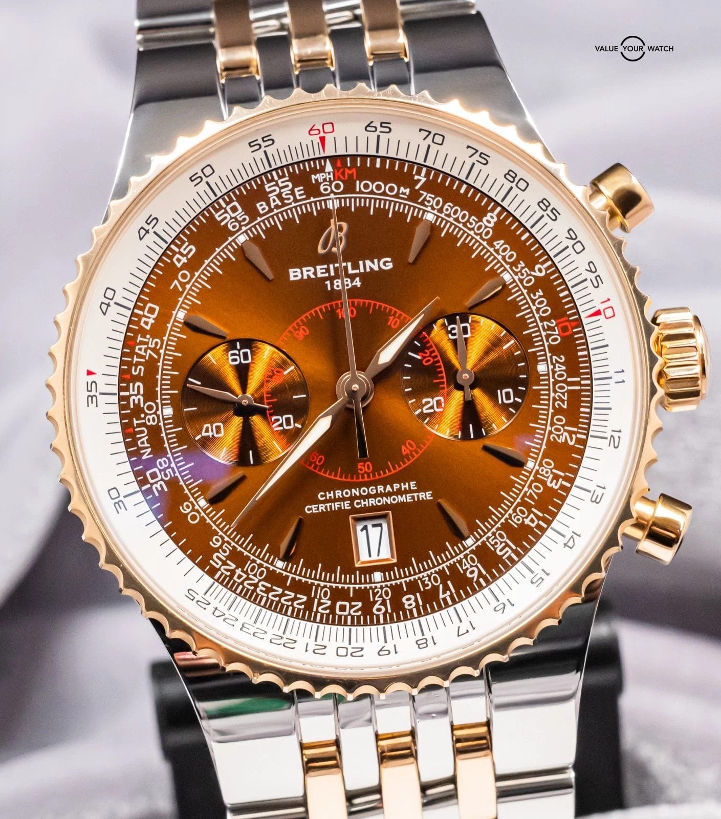 STRIKING Breitling Montbrillant Legende 47mm in Two-Tone 18K Rose Gold with Bronze Dial on Integrated Two-Tone Bracelet! Arrives as a complete set with the original Breitling boxes and papers including the international warranty booklet, serialized COSC certificate, maintenance booklet, and manual. Originally purchased from a Breitling Authorized Dealer in February 2011. This is an incredibly rare find, I have only owned three other Two-Tone Montbrillant Legende in the past nine years, and one was a complete set, never another Bronze Dial! Currently the only one for sale nationally with the black dial. This Montbrillant is similar to the Navitimer, it’s essentially a larger Navitimer at 47mm with the Integrated Bracelet and Classic Montbrillant Dial. Pretty incredible watch on wrist!