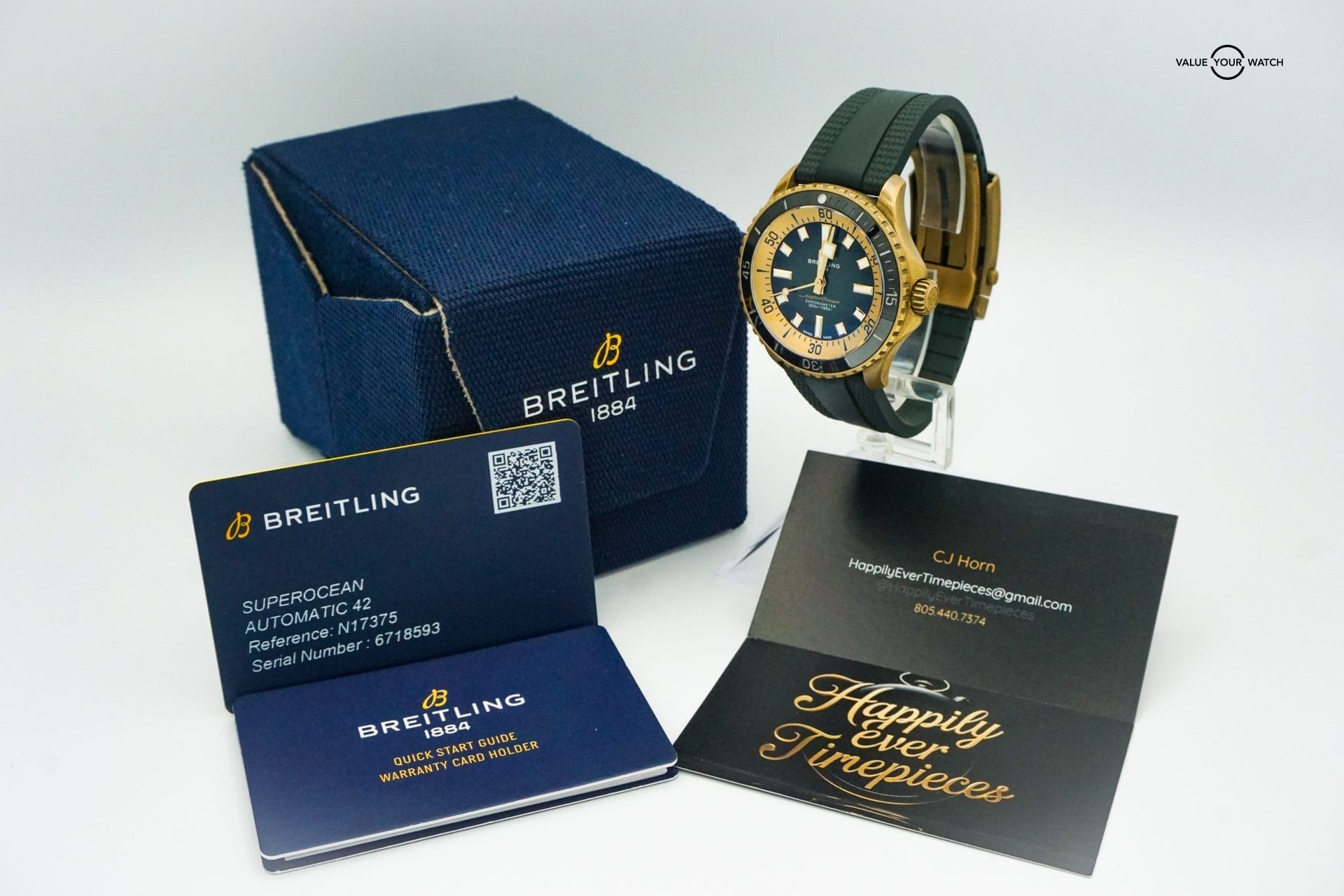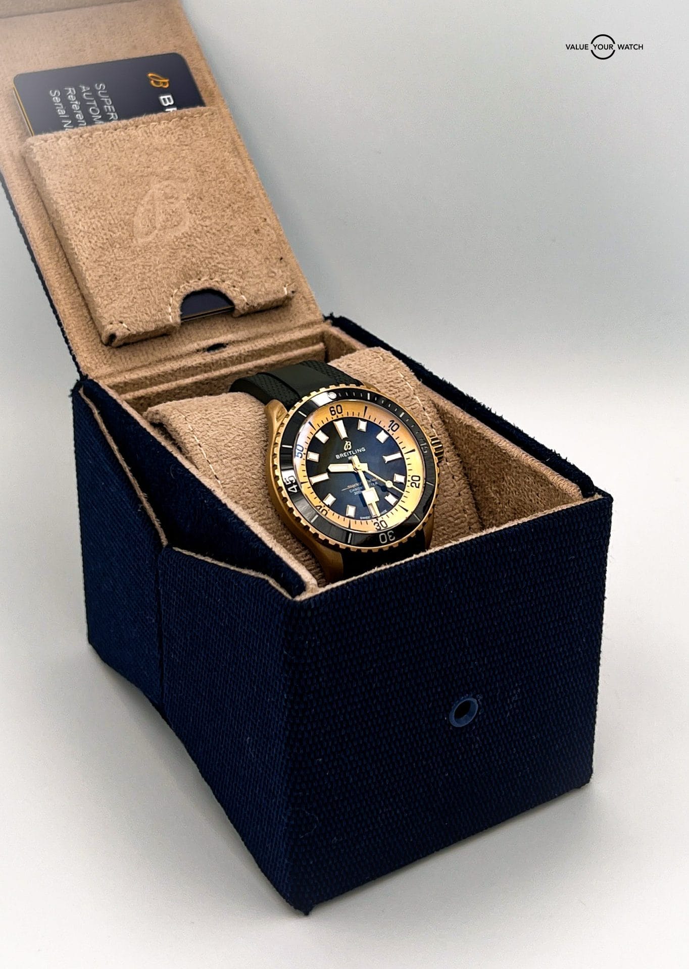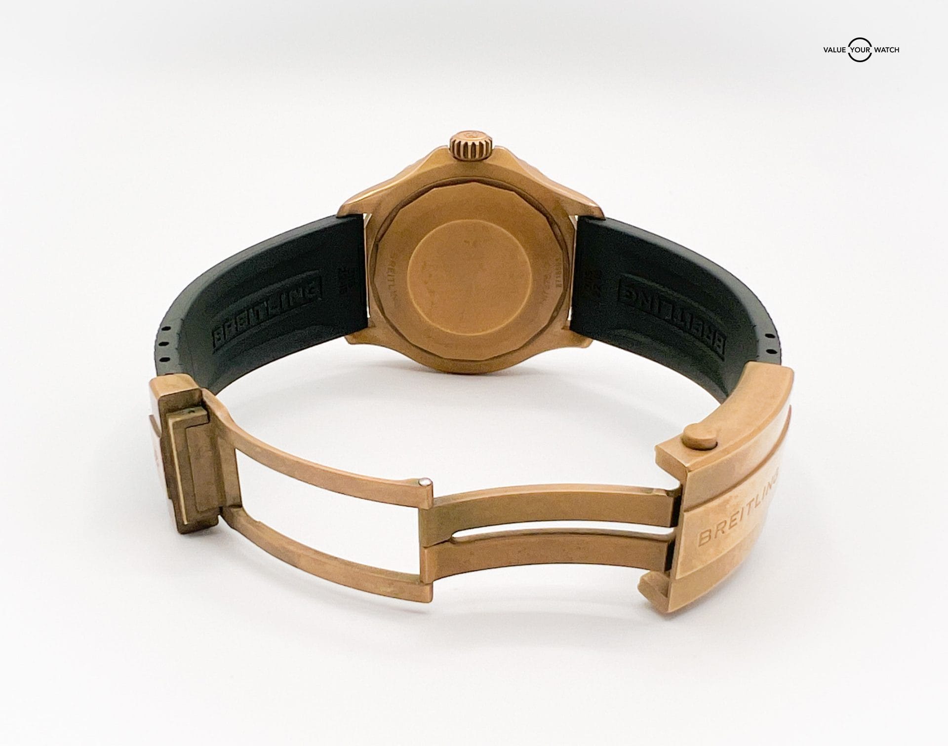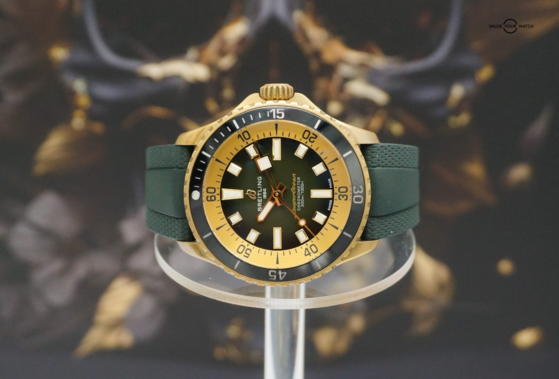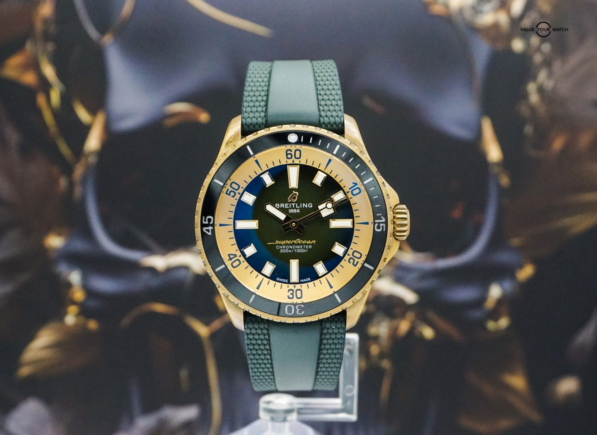 This Boutique Edition Breitling SuperOcean is a limited edition bronze version of the vaunted SuperOcean watch. The SuperOcean boasts a Breitling 17 movement in a 42mm bronze case. It also has a scratch-proof ceramic-inlayed bezel, but the real standout of the watch is the bronze case and bezel. Breitling uses a special alloy that has excellent corrosion resistance, but will still develop that bronze patina that is cherished by watch collectors. With bright and bold luminescent Super LumiNova indices, this watch is visible at all hours of the day and night.