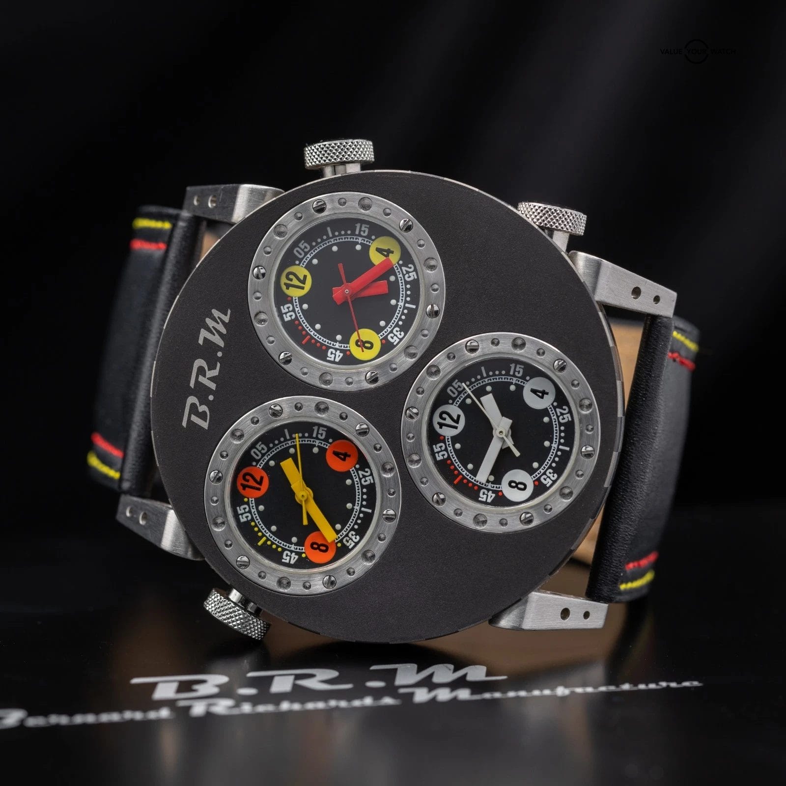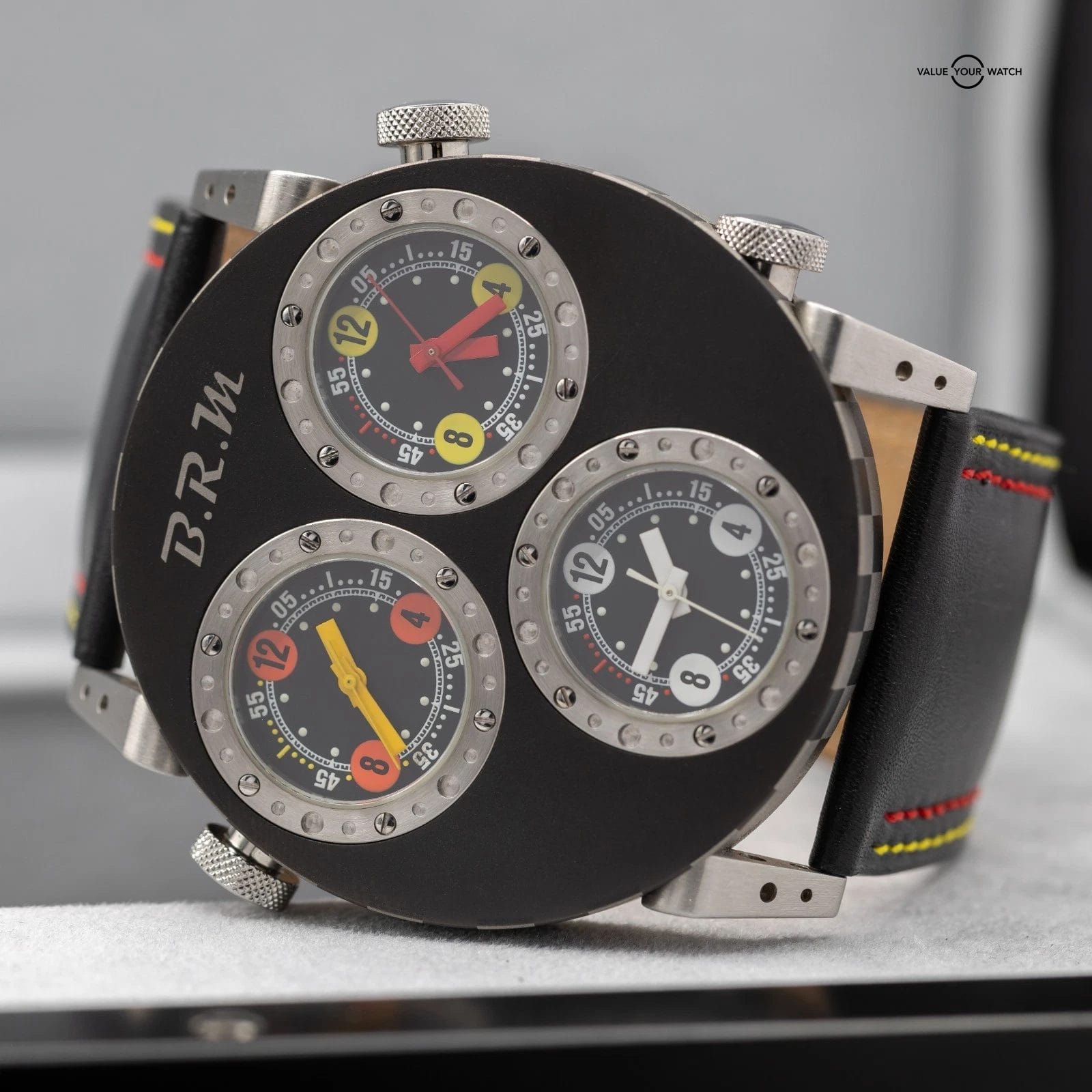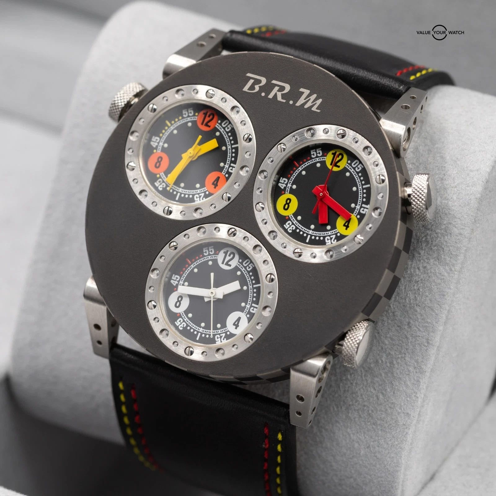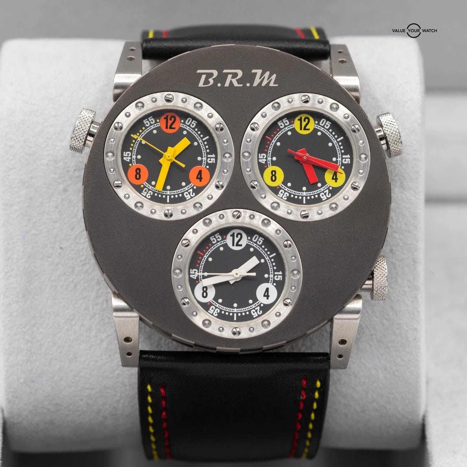 Up for sale here is a very cool timepiece by BRM- an onversized 3 Time Zone piece cased in titanium, with 3 crowns to adjust the times individually! Ref. 3MVT