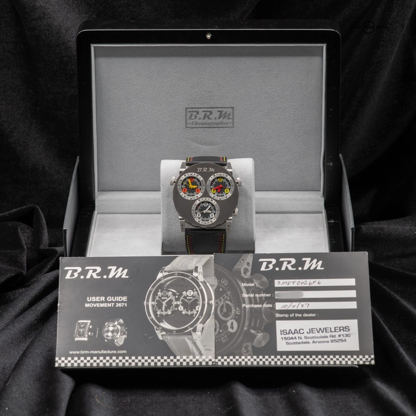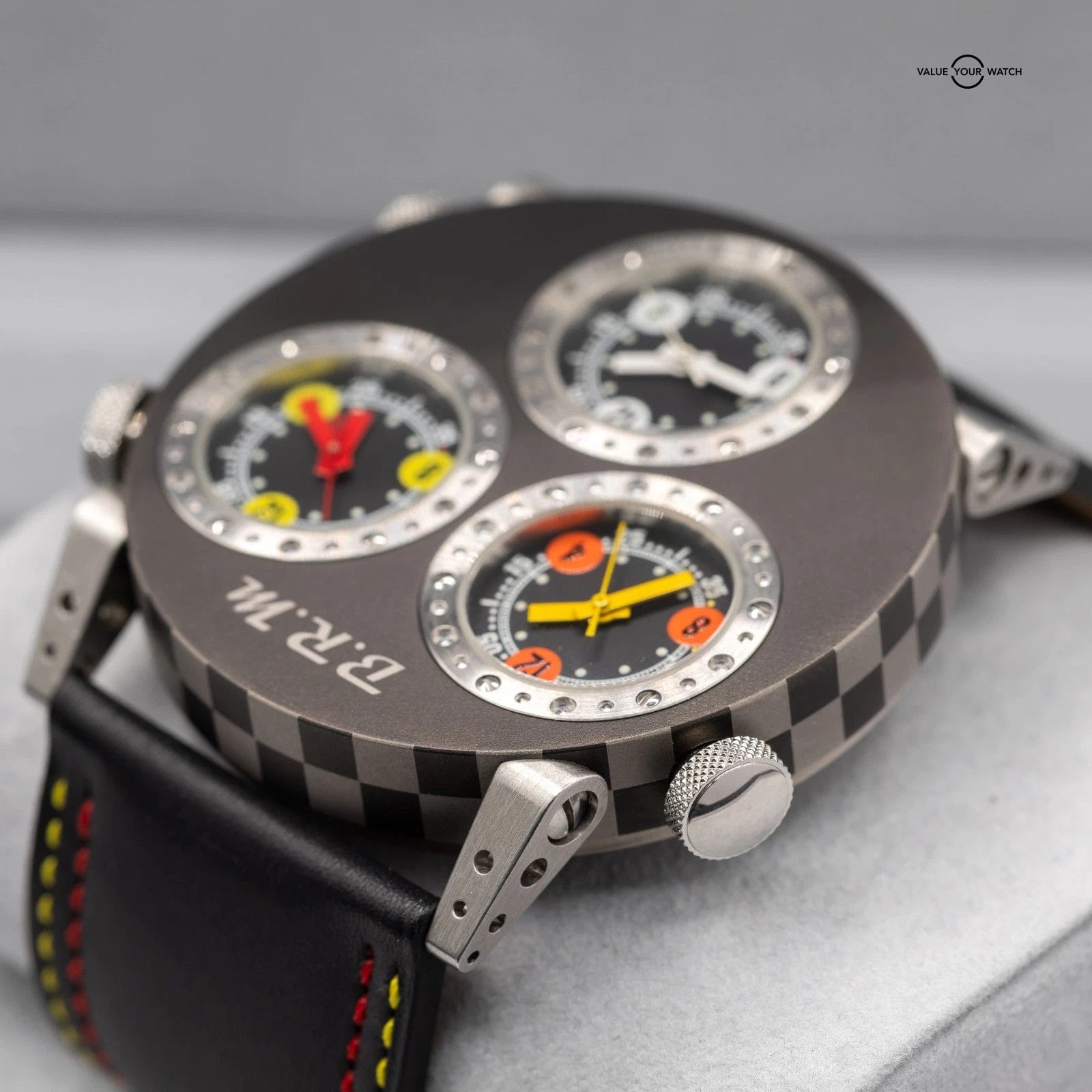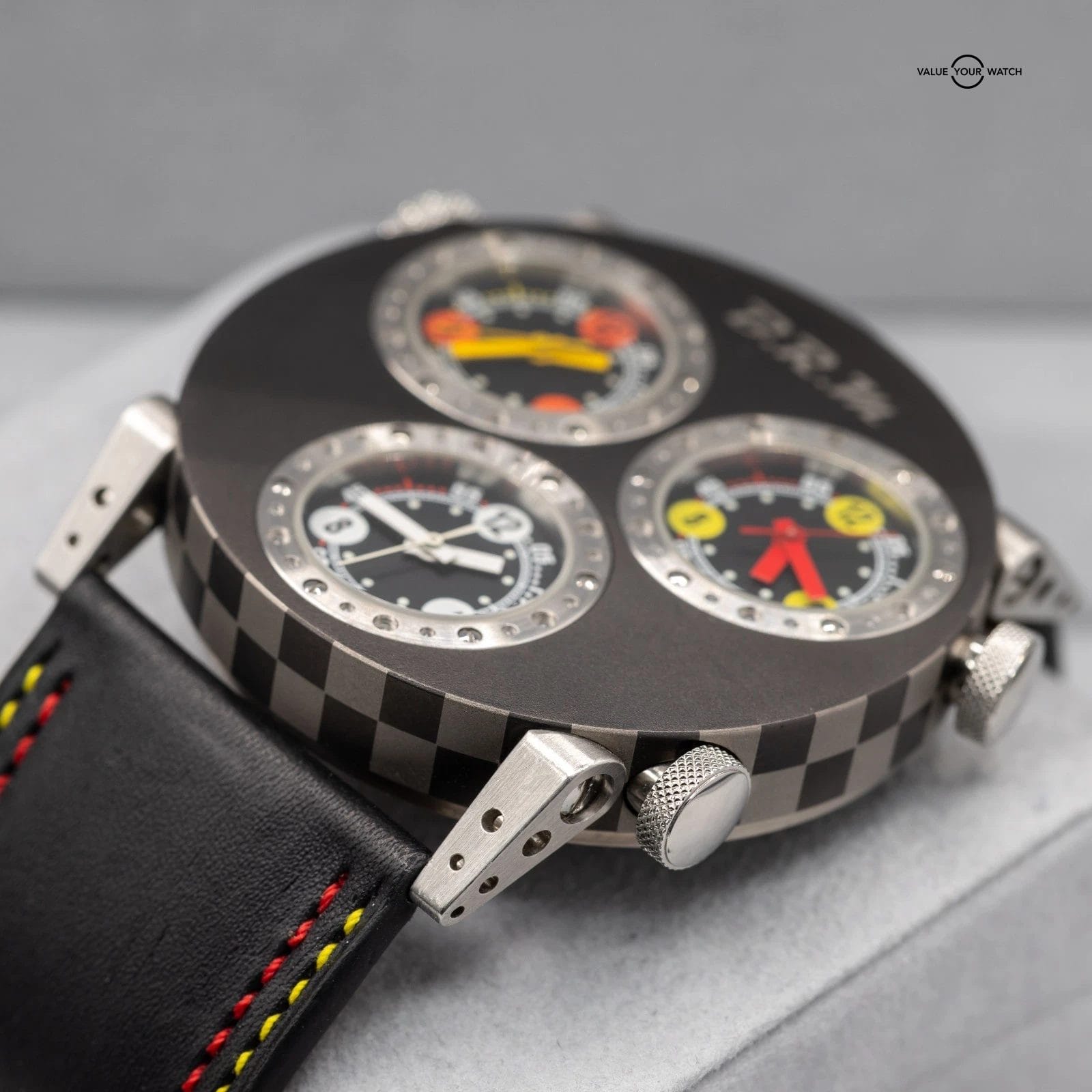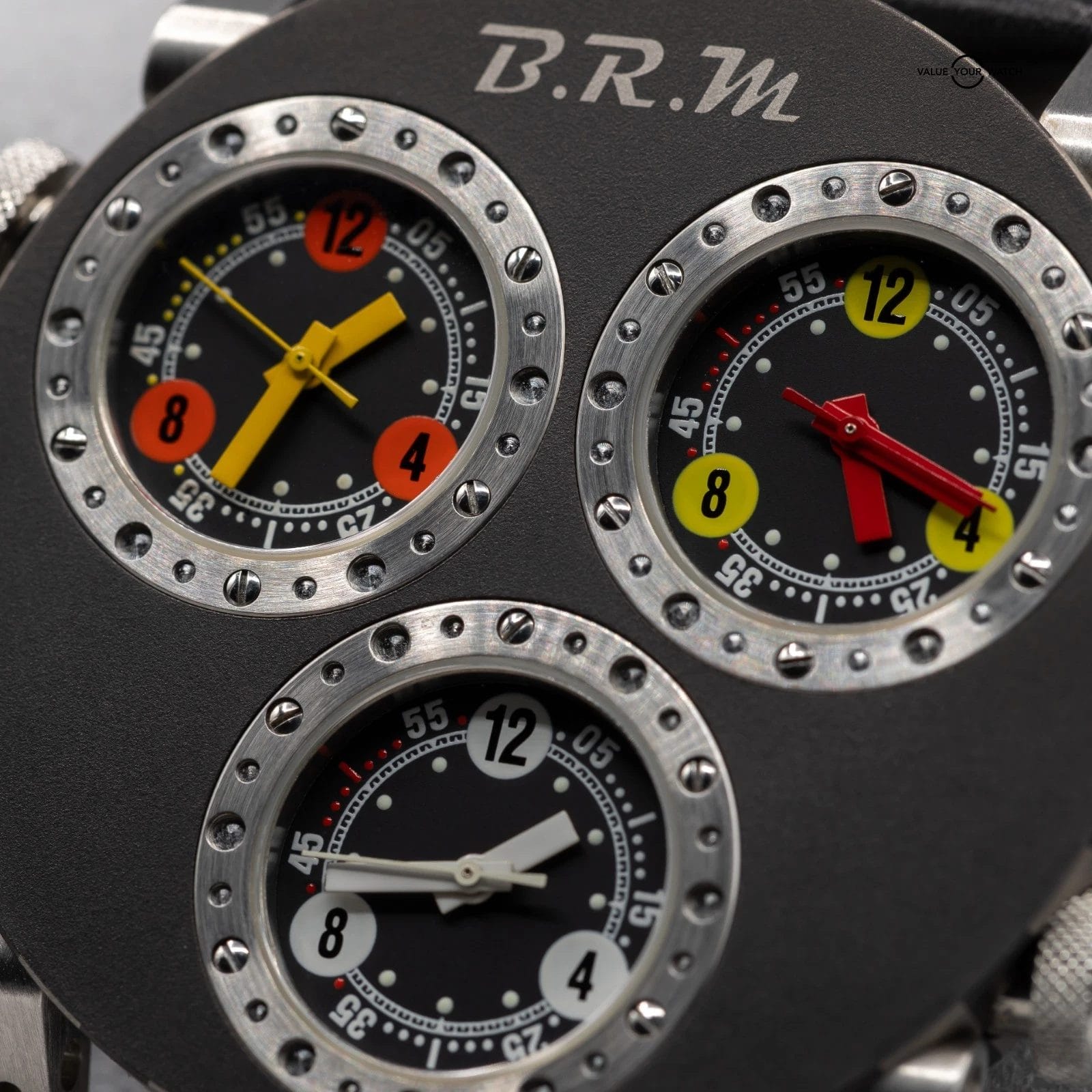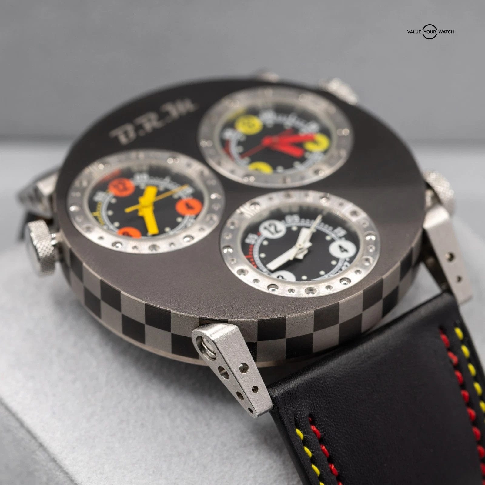 Up for sale here is a very cool timepiece by BRM- an onversized 3 Time Zone piece cased in titanium, with 3 crowns to adjust the times individually! Ref. 3MVT
