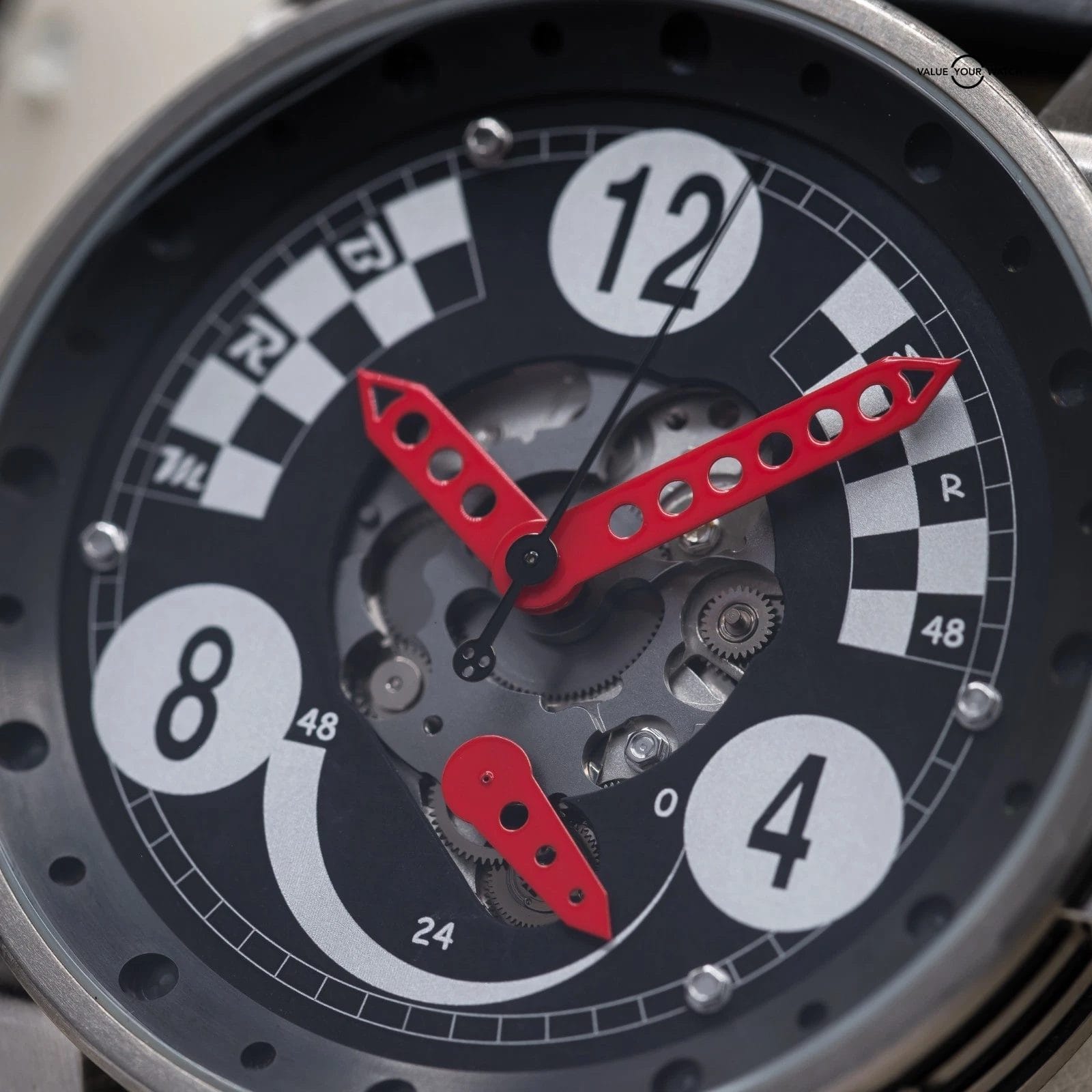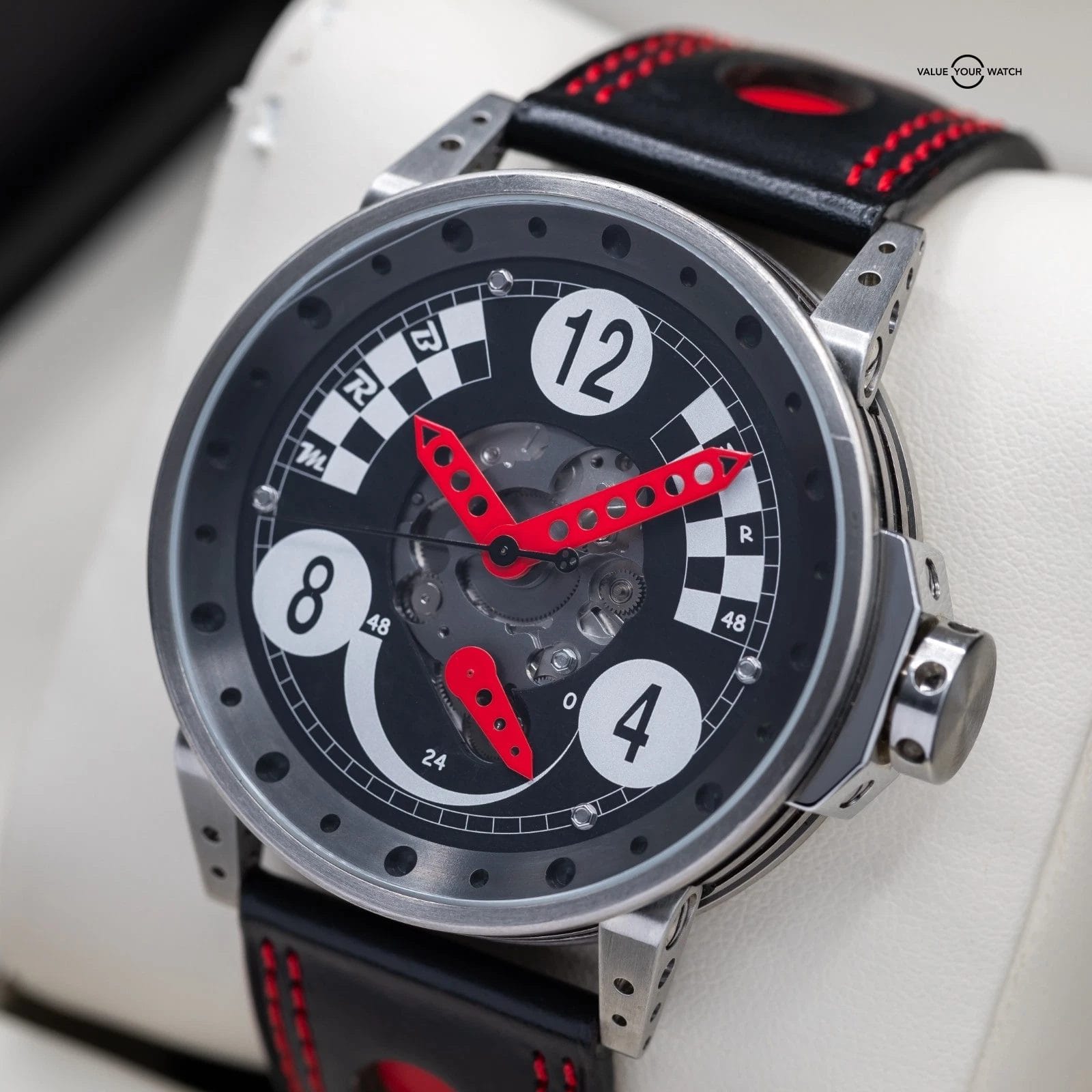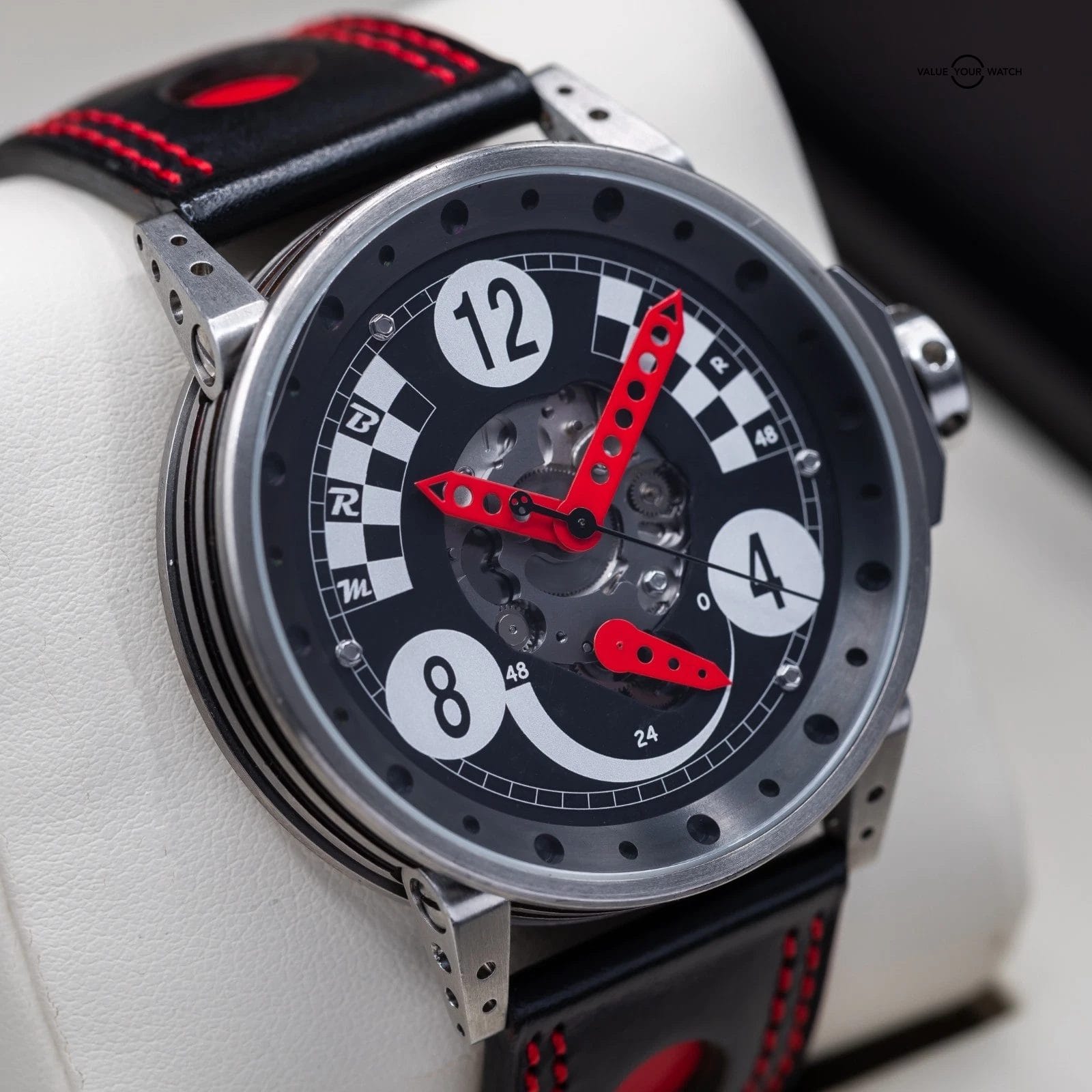 Up for sale here is a very cool variant of the BRM Chronometer, cased in titanium and sporting a half skeleton, half checkered flag dial. Ref. MR48