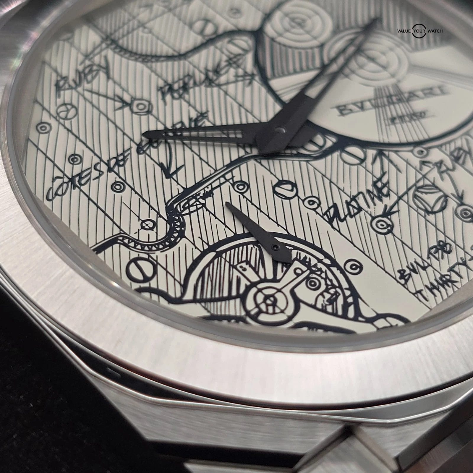 As can be clearly seen, this one is the special limited edition with the Sketch dial! The original artist’s sketch of the movement is laid out on the face of the watch, along with notes, directional arrows, etc. Limited to only 280 pieces, and they don’t come up for sale too often!