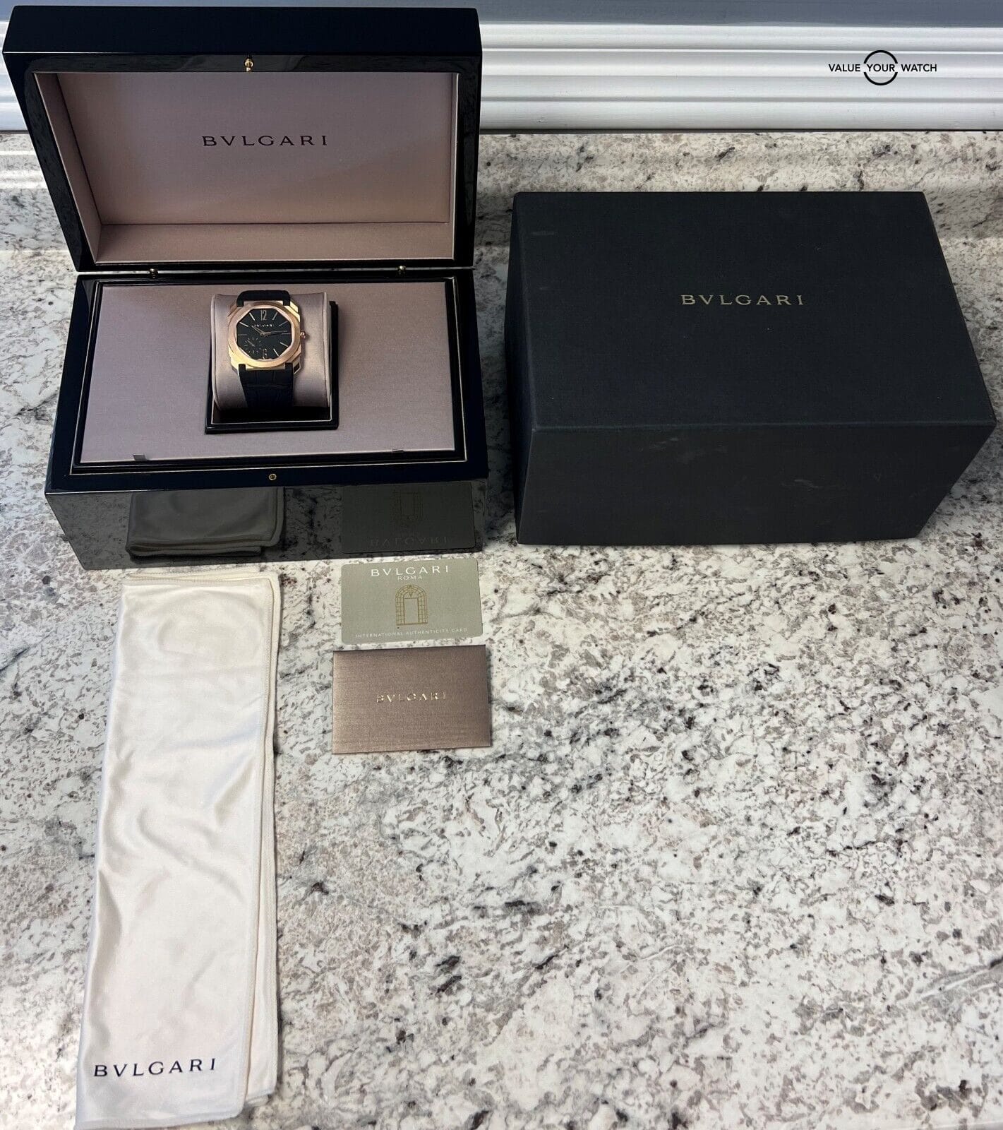 The BVLGARI Octo Finissimo 103286 18K Rose Gold Extra Thin 40mm comes with the original boxes and papers, adding value and authenticity to the timepiece. The presence of these documents provides assurance to buyers regarding its origin, condition, and provenance.
