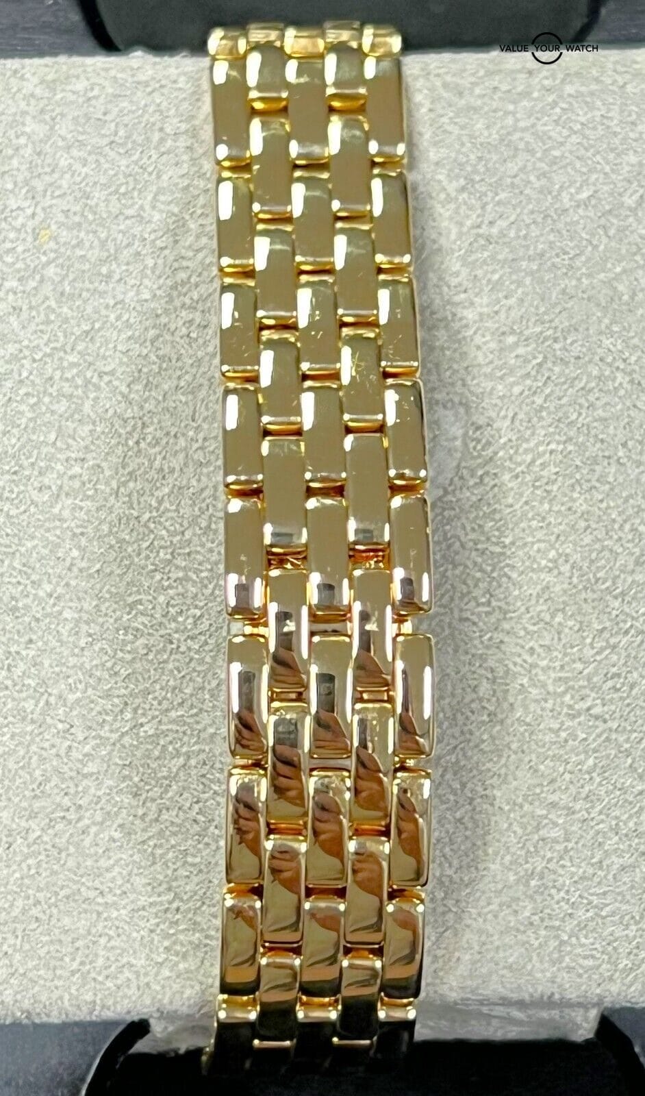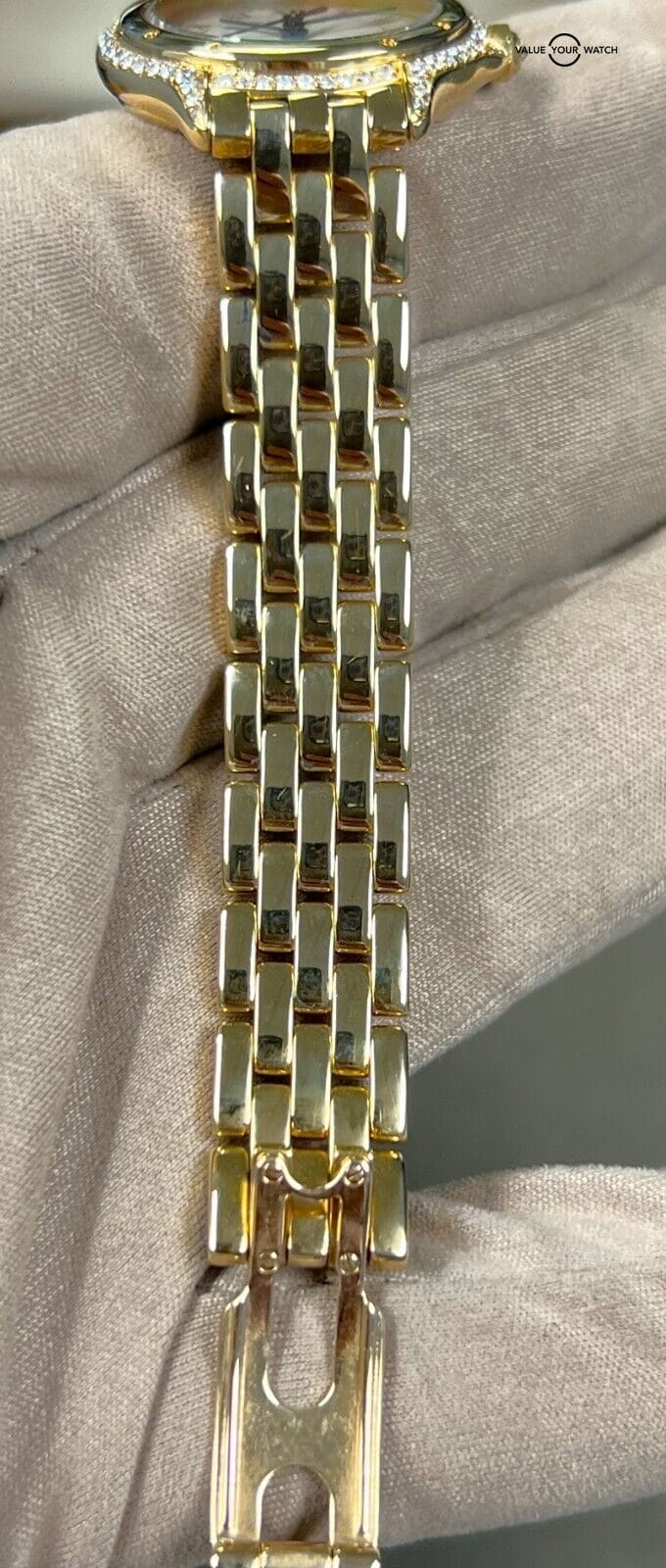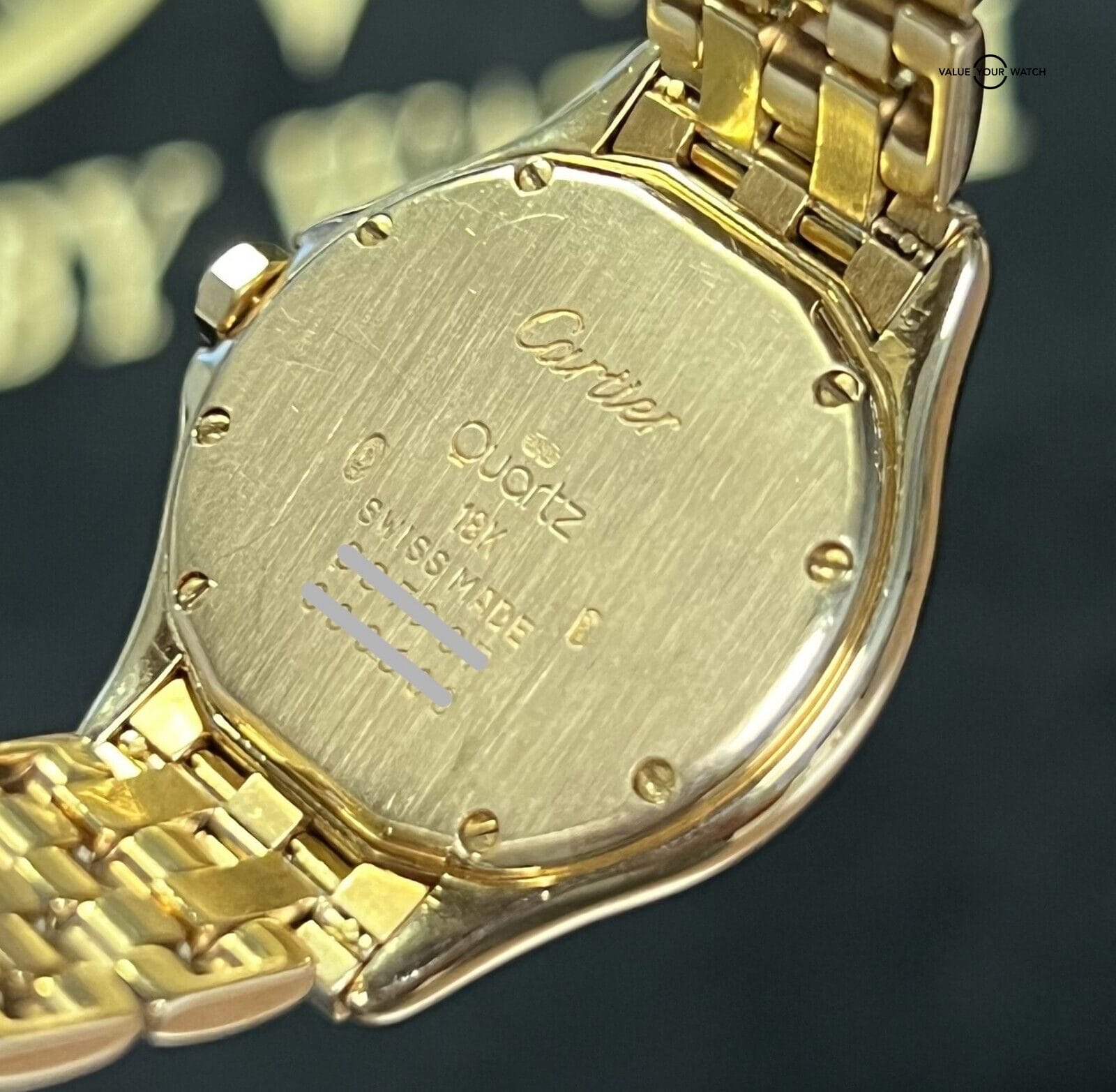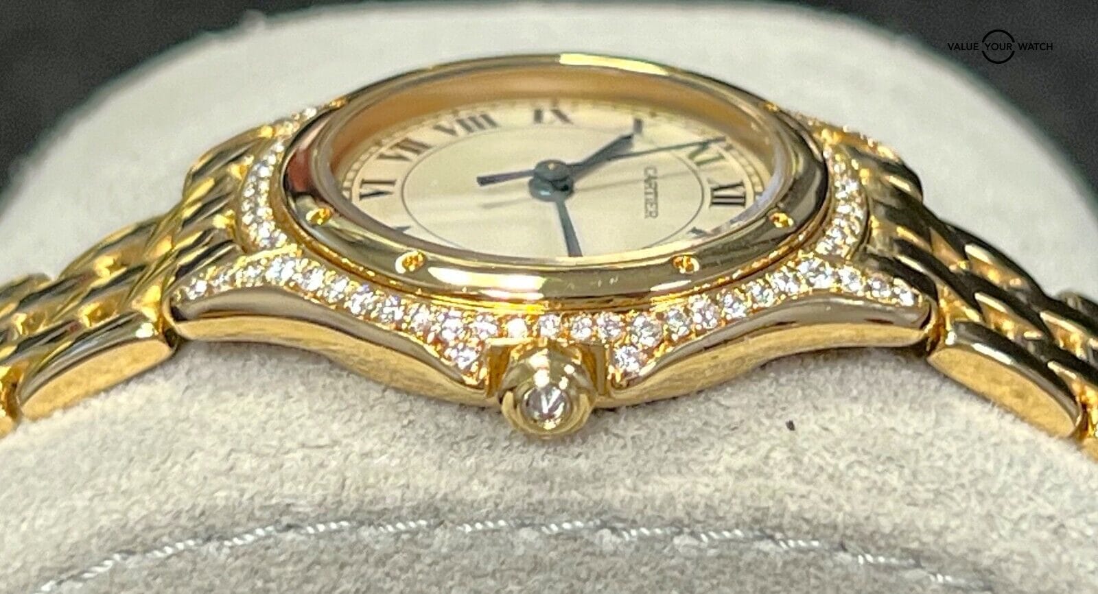 This incredible timepiece is a watch only sale. The diamonds are factory set by cartier. The watch is in excellent pre-owned condition with typical light cosmetic wear on the case and bracelet. The movement just had a full overhaul and is running flawless. The sapphire crystal is clean with no nicks or scratches. The dial shows a little wear. The bracelet will accommodate up to a 7” wrist. Do not miss your chance to own this illustrious timepiece! Mechanically the watch is functioning well. Serial numbers & names are blurred in photos only for privacy reasons.