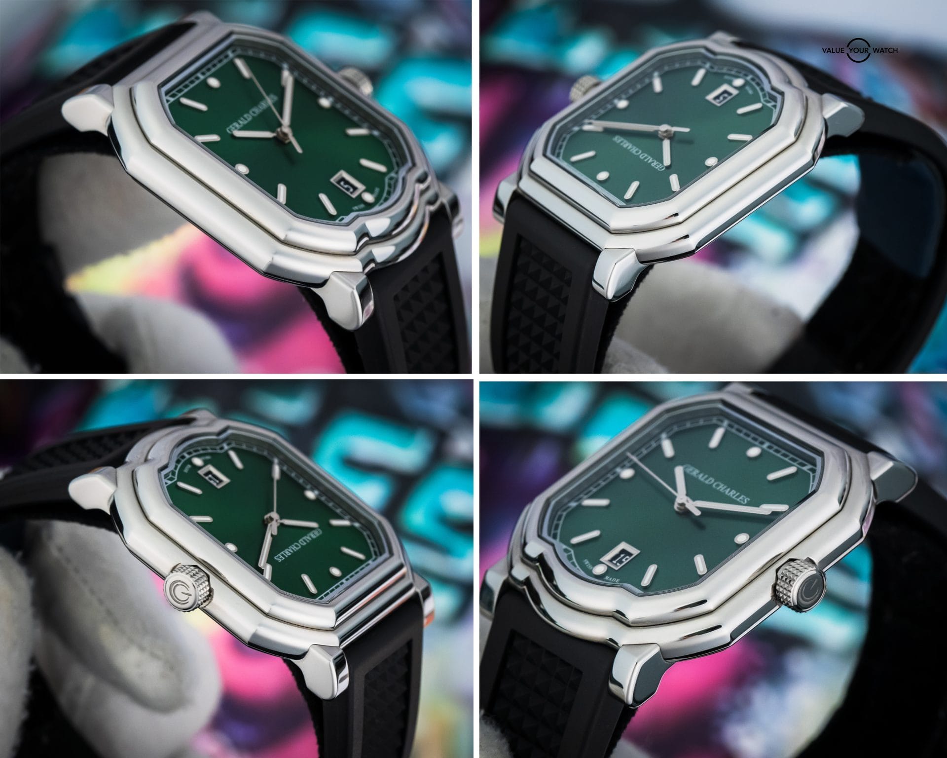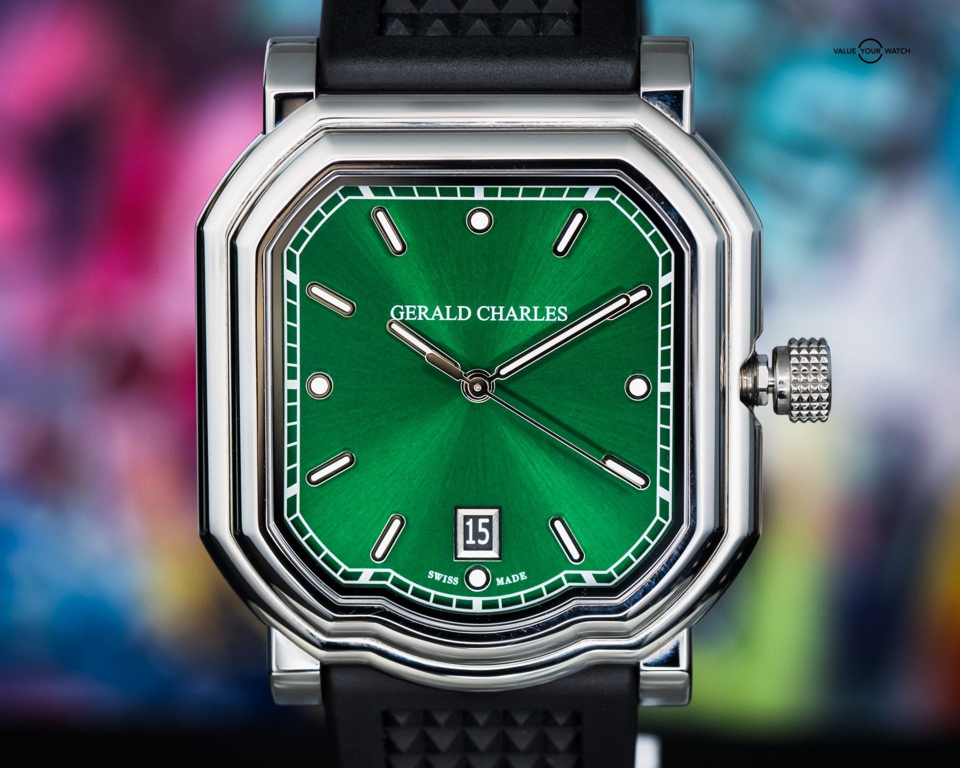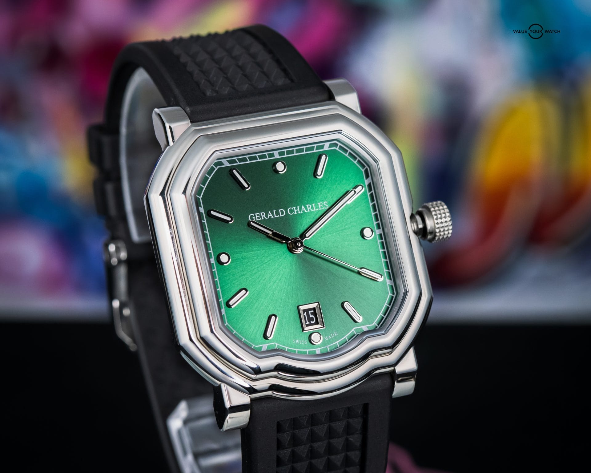 • Contrasting Green Aesthetic –Green sunburst dial and black rubber strap for a contrasting yet cohesive look.