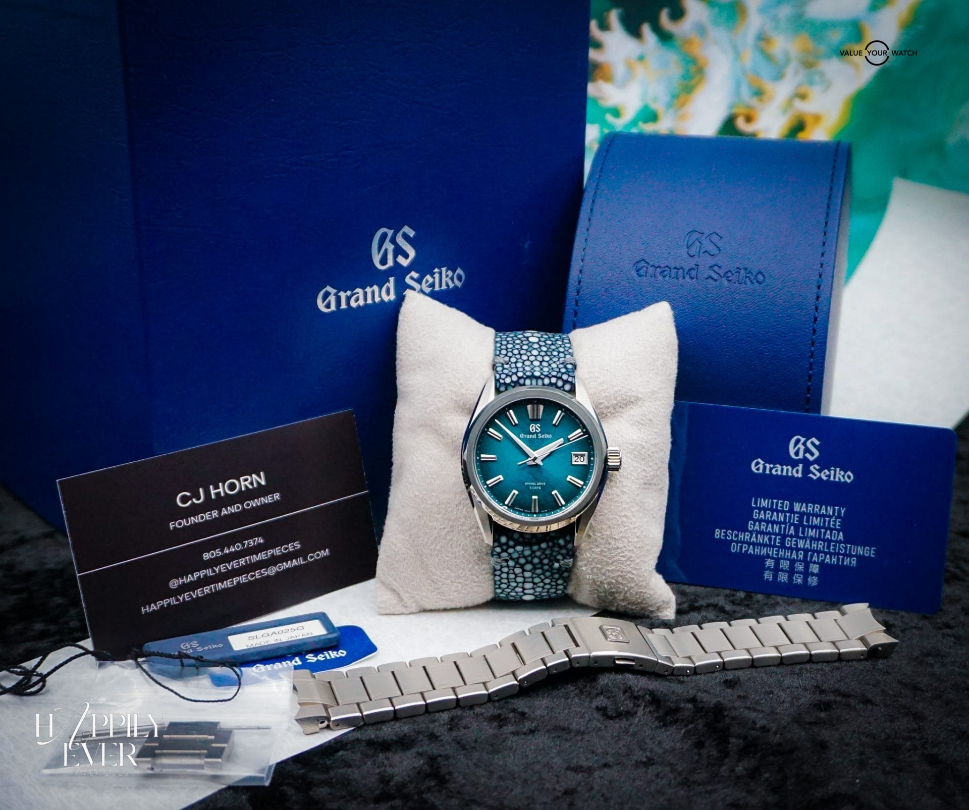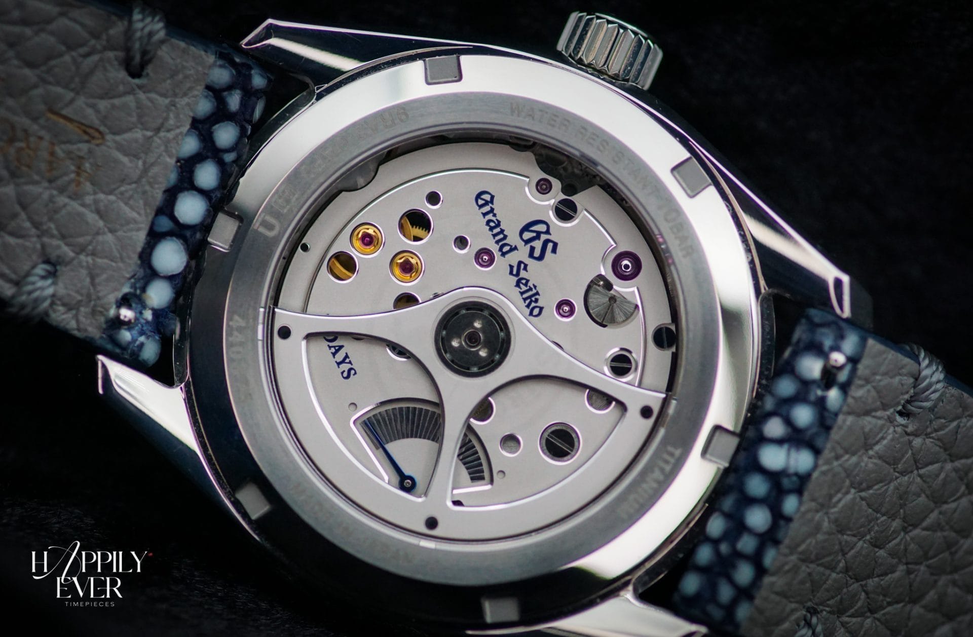 Crafted from lightweight yet highly durable titanium, the 40mm case ensures exceptional comfort on the wrist while maintaining Grand Seiko’s signature Zaratsu-polished finishing. The matching titanium bracelet enhances both wearability and durability, making it ideal for daily use or long-term collecting. This watch has been paired with a custom black Stingray strap on deployant clasp from Aaron Bespoke. It truly is one of a kind.