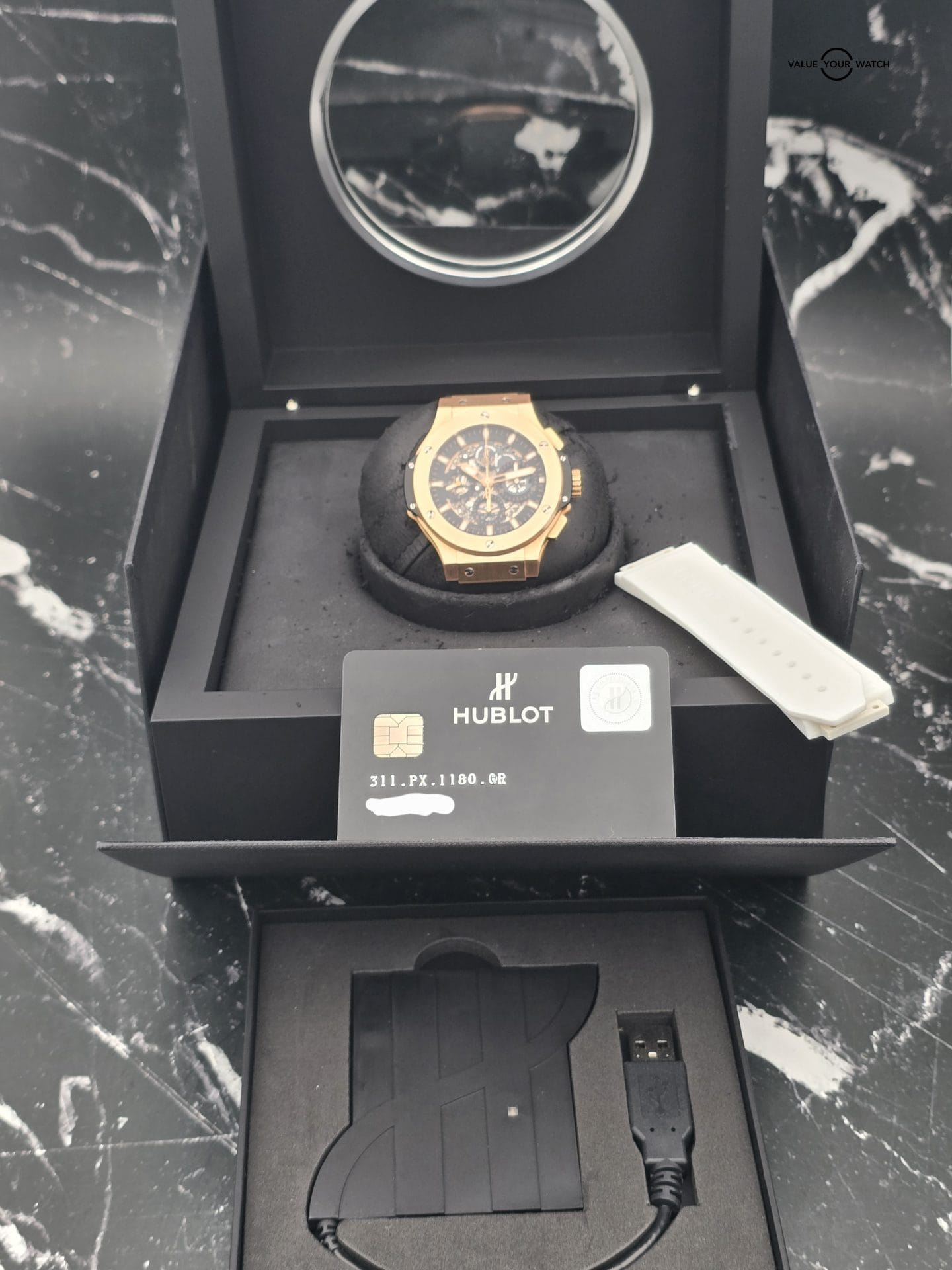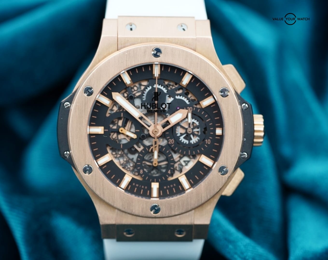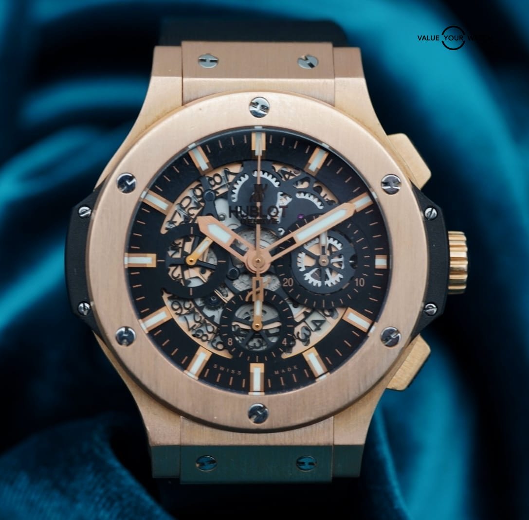 Selling the HB Big Bang Aerobang in solid rose gold! The skeleton dial, white strap and rose gold case make this a winner! Ton of wrist presence.