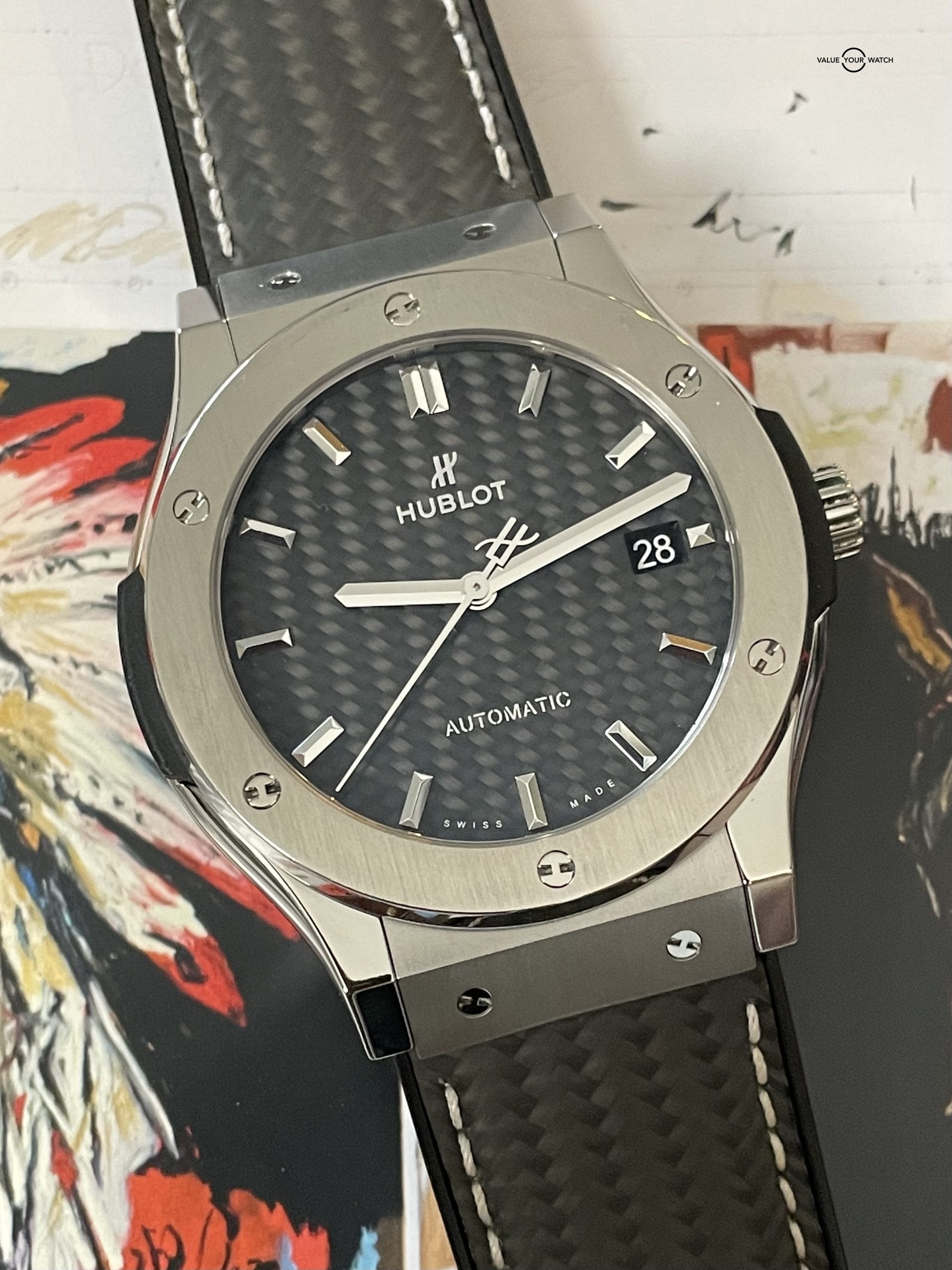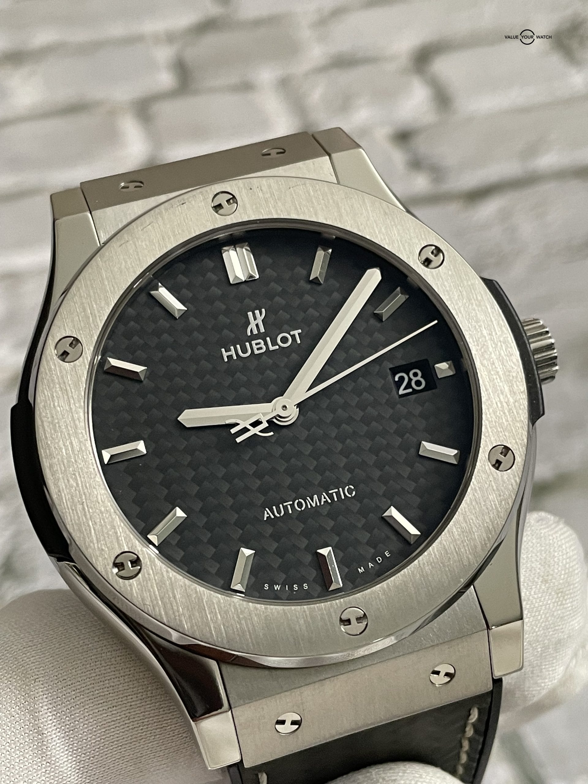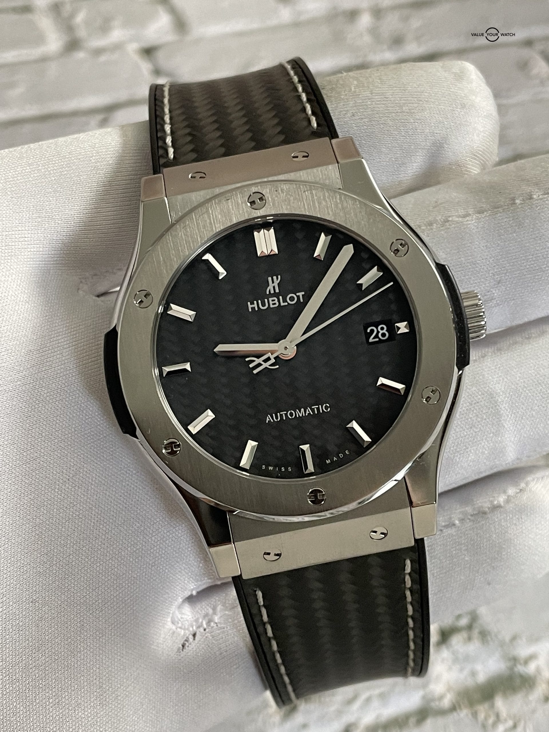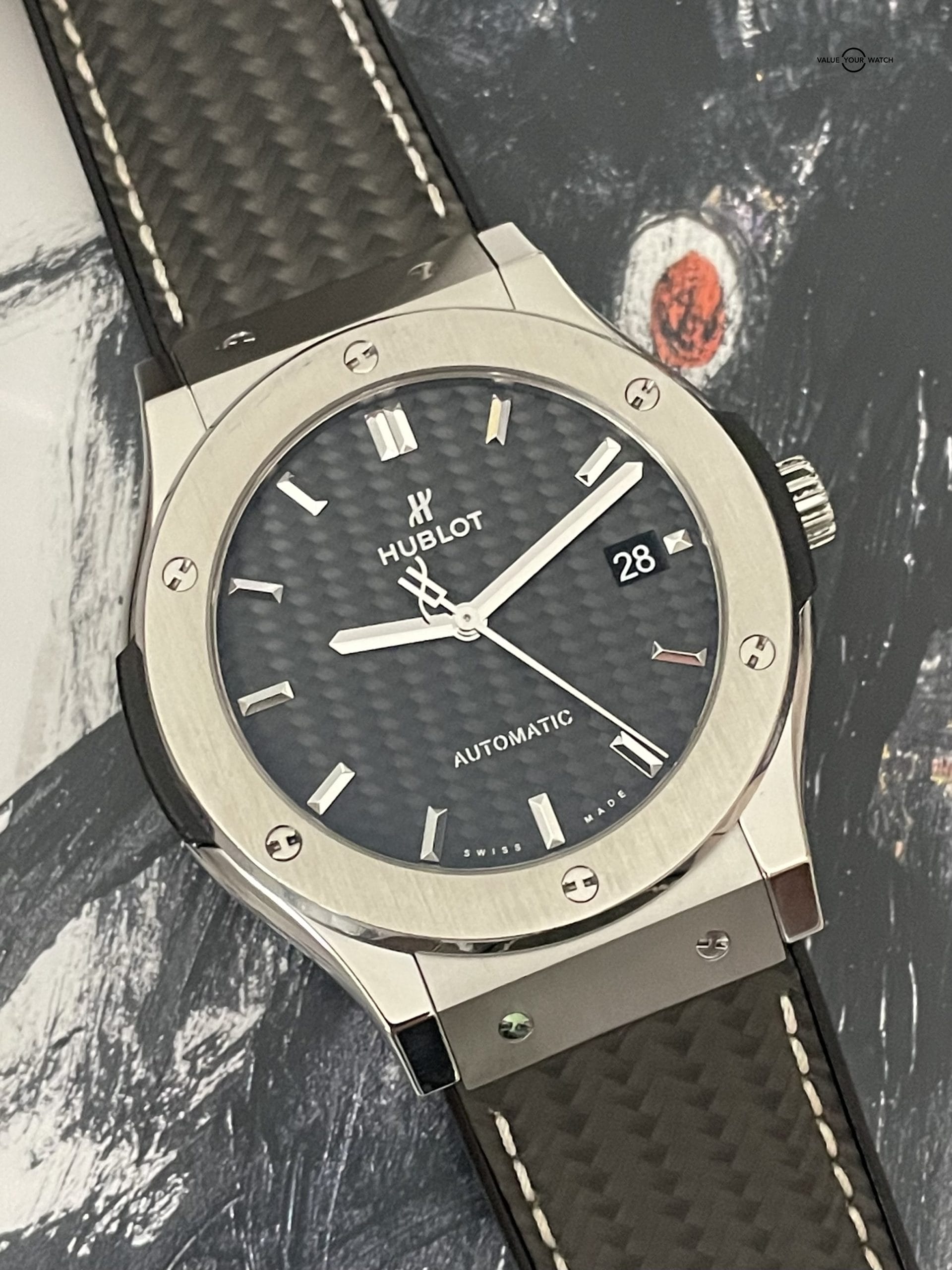 If you are looking for a Hublot with carbon fiber that won’t break the bank, we’ve got you covered. This Classic Fusion is a titanium case with a carbon fiber dial and carbon strap. You won’t see the carbon strap on these often, and it is quickly becoming one of our favorite from Hublot! Case fits under a cuff perfectly and is light and super comfortable. This is the best way to get into a carbon Hublot and you certainly won’t see this particular one listed anywhere else right now. Get it while you can!
