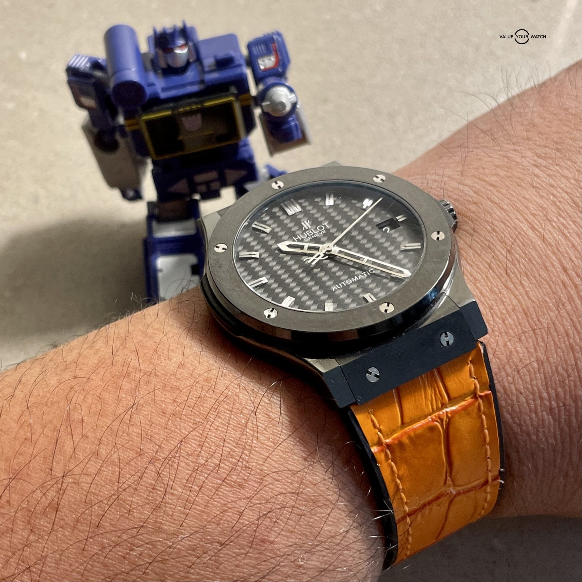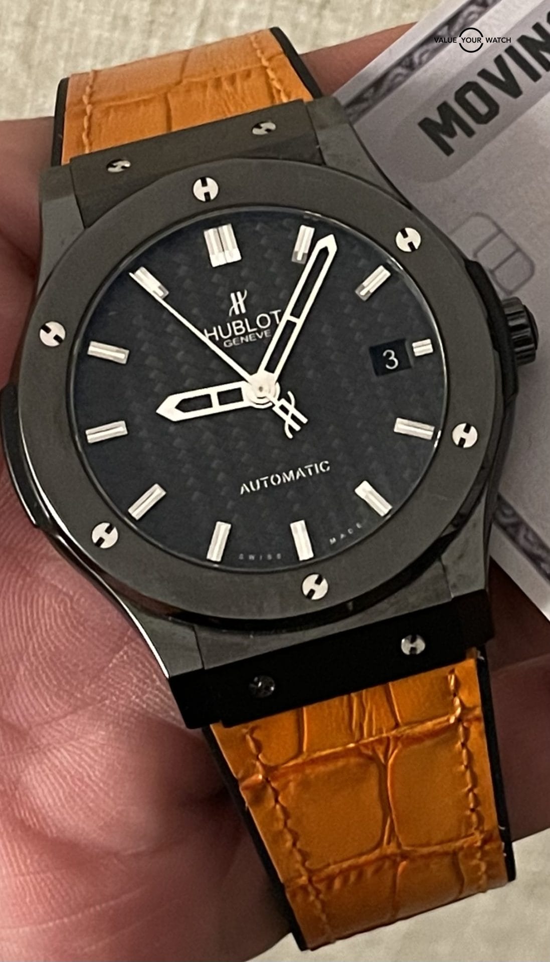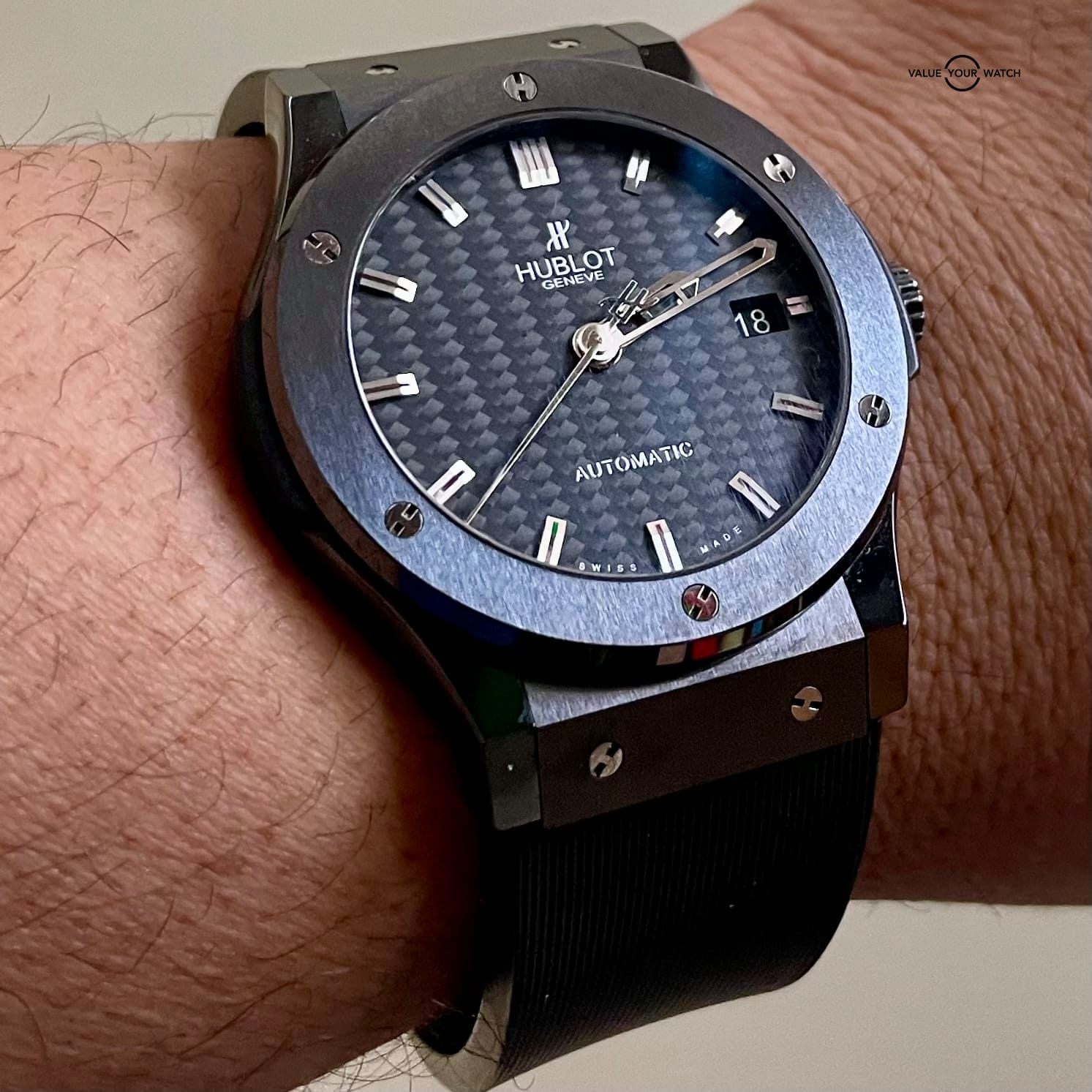 | Up for sale is this Hublot classic fusion black magic 45mm Ceramic Carbon Fiber that has an MSRP of $10,200.