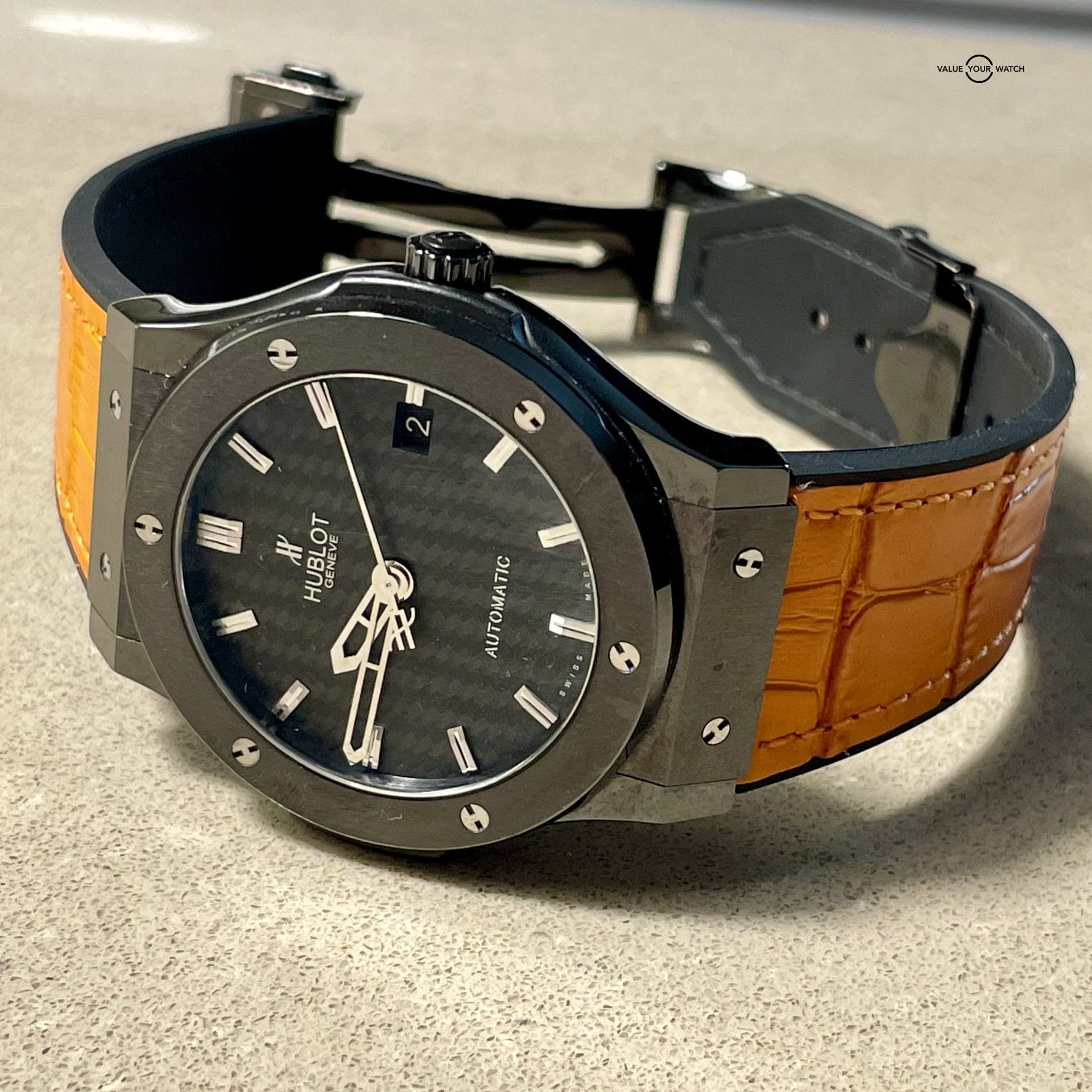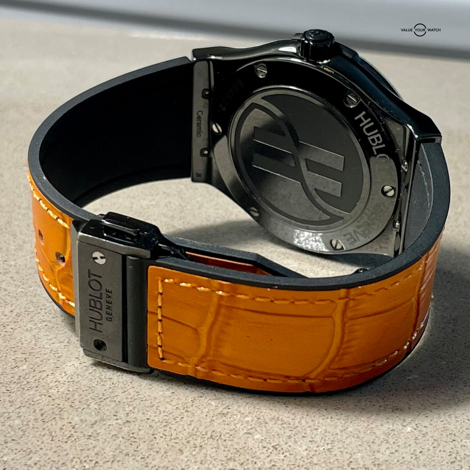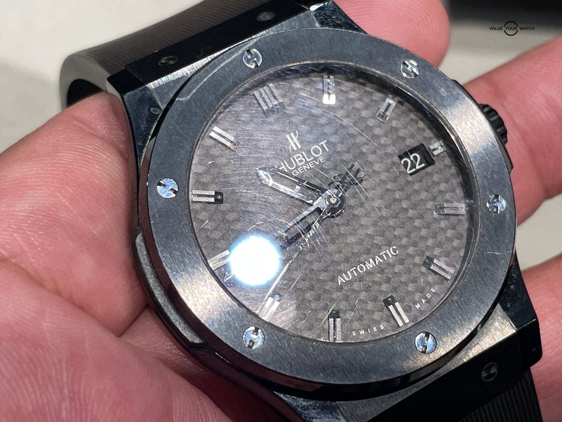 | Up for sale is this Hublot classic fusion black magic 45mm Ceramic Carbon Fiber that has an MSRP of $10,200.