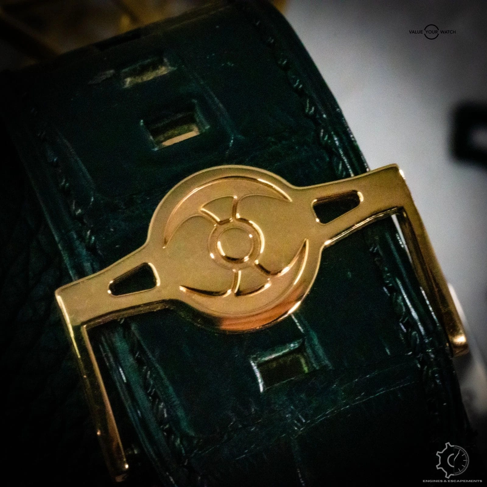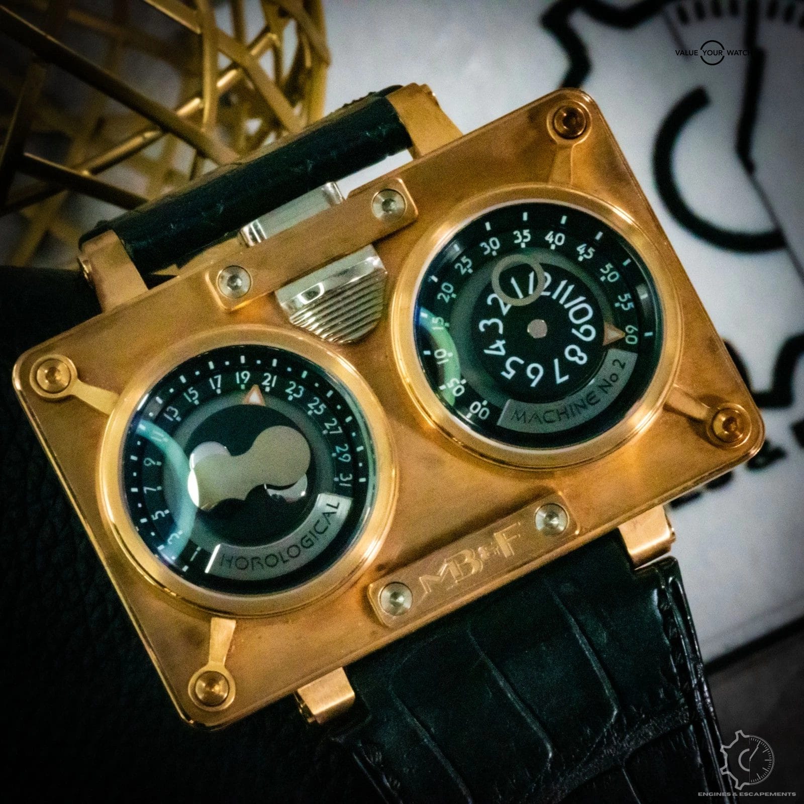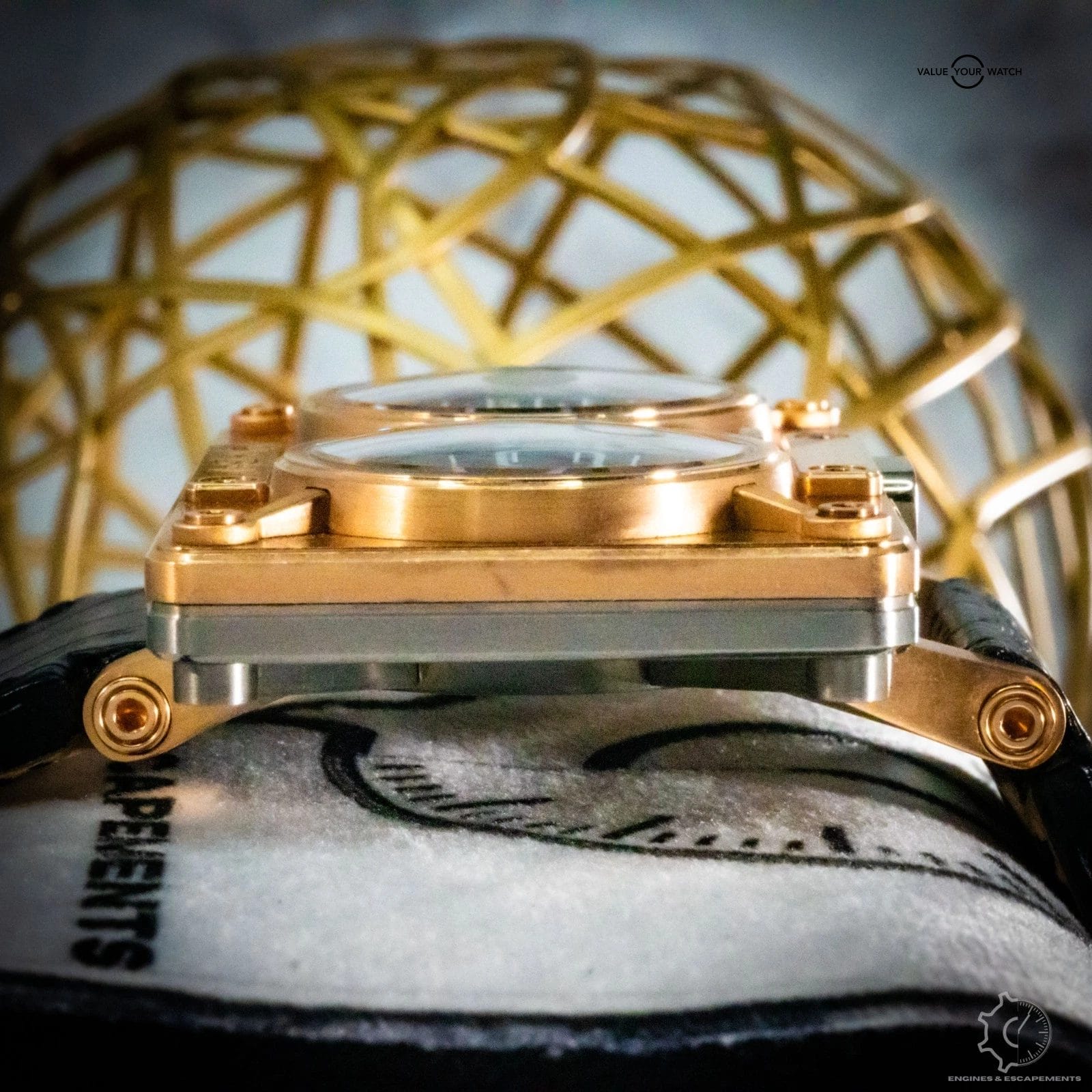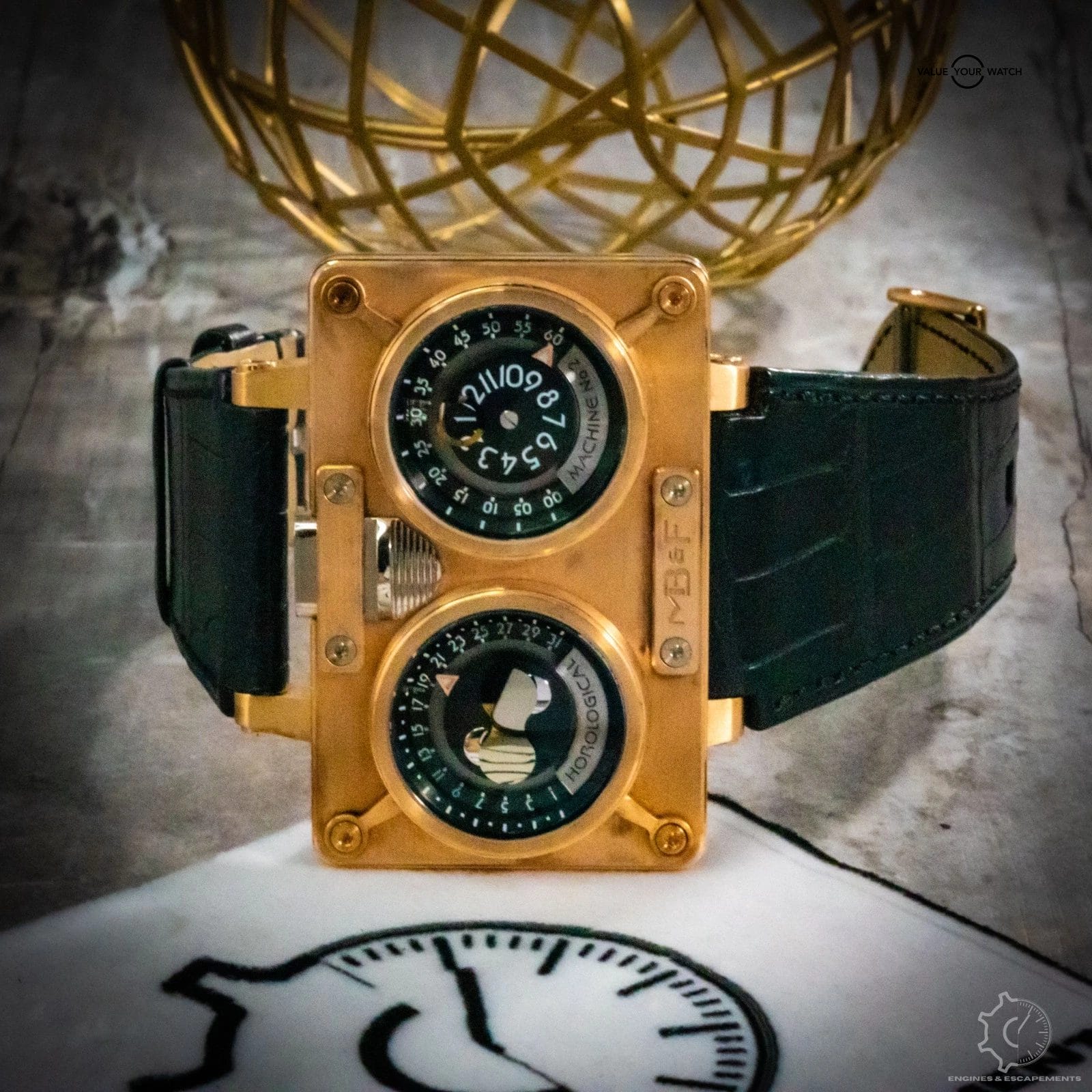 The MB&F Horological Machine No.2 is a watch that defies convention, standing as both mechanical marvel and avant-garde sculpture. Its bold rectangular case houses a display unlike anything else in modern horology, with jumping hours, retrograde minutes, moonphase, and date laid out in a way that feels more like futuristic instrumentation than traditional watchmaking. Every angle of the case, every detail of the sapphire crystal, speaks to MB&F’s philosophy of creating three-dimensional kinetic art for the wrist.