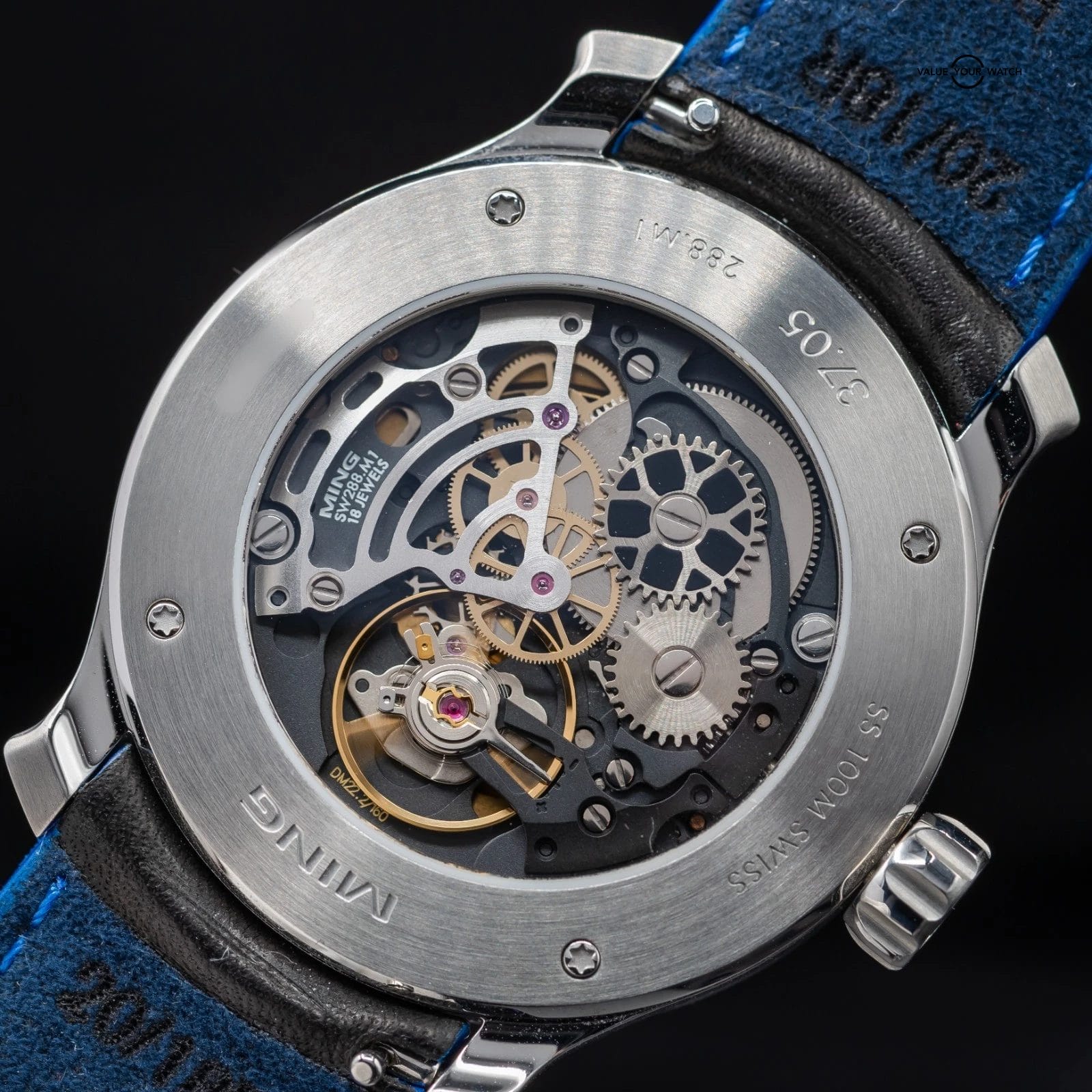Up for sale here is a very cool timepiece by Ming- this Moonphase in the Series 2 has the manual winding SW288-M1 movement, and this is the nicest ones I’ve ever seen- just look at that skeletonization! Fortunately on displace through the exhibition caseback. Ref. 37.05