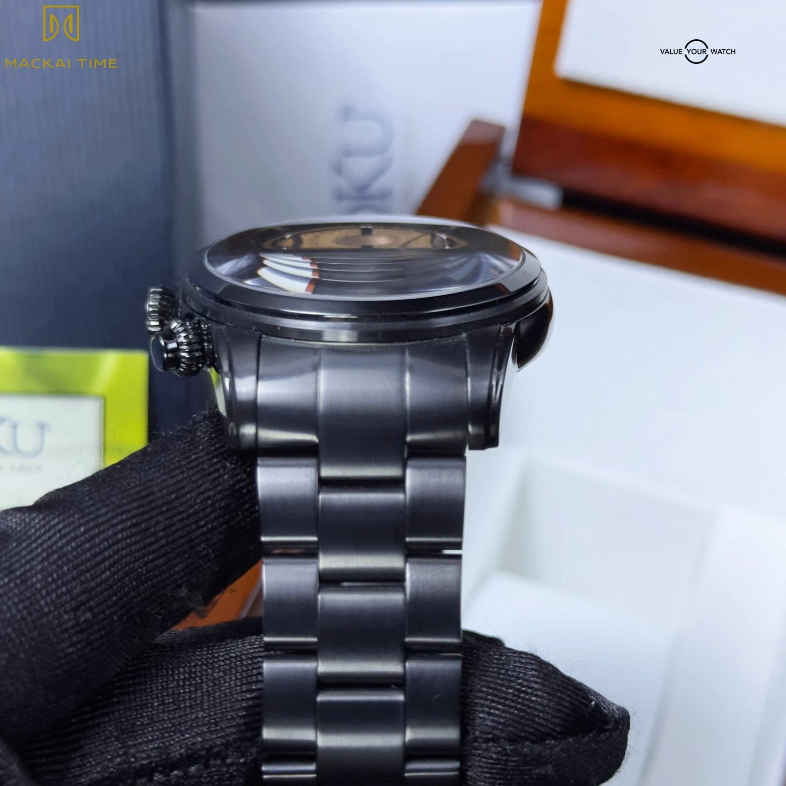 Mahalo, we’re glad you came to see this Hawaiian gem. This here is the Na Hoku Chronograph. The dial is made in part with Hawaiian Koa wood and touches of rose gold giving such an elegant aesthetic. The case and bracelet are black ion-plated stainless steel and it’s water resistant to 100 meters. The crystal is glare-proofed sapphire as well. This watch has a lot to offer, and especially for the price point. Reach out if you’re interested or thinking about trading in/ trading up your watch!