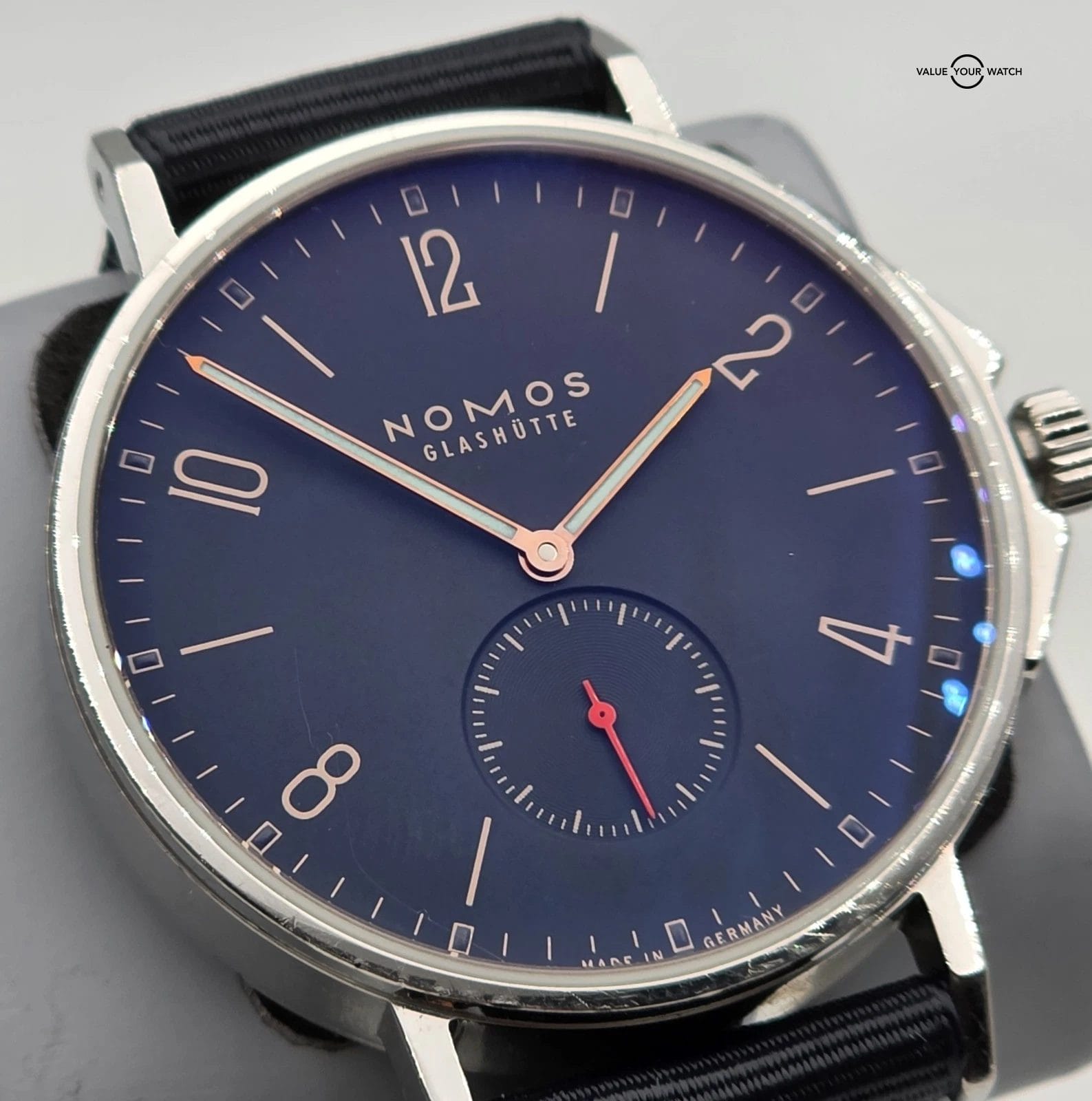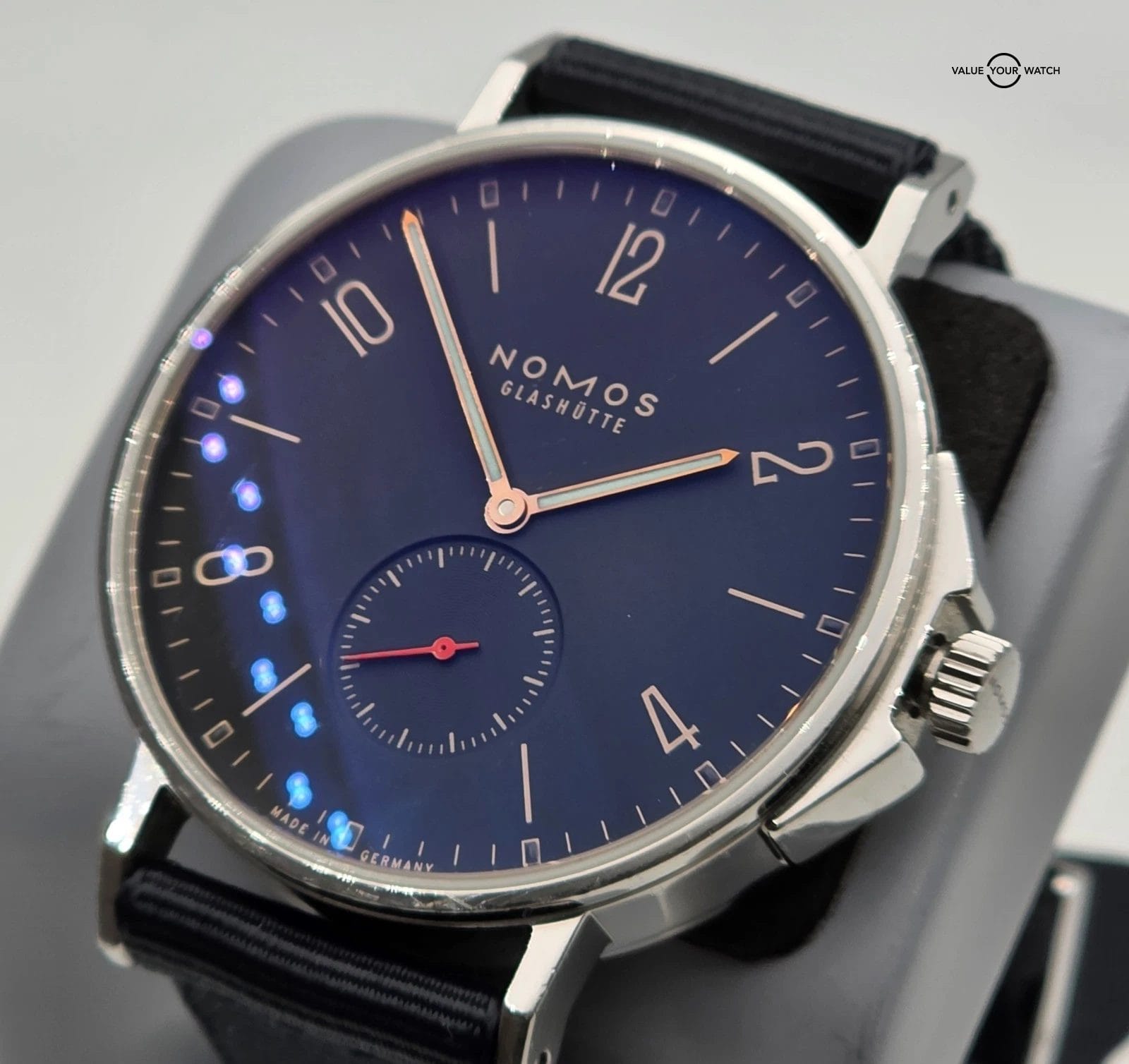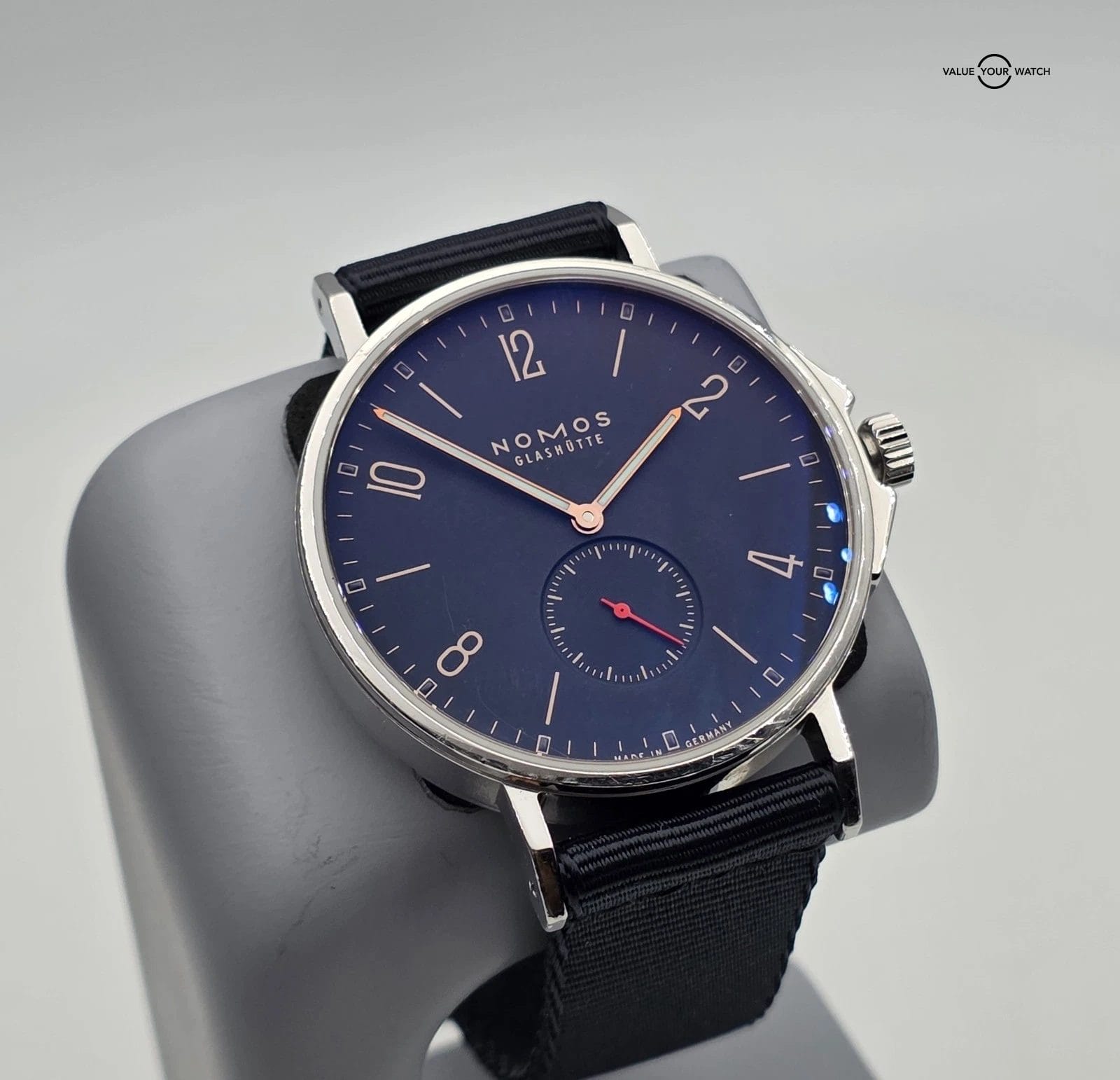 This NOMOS Glashütte Ahoj Atlantik watch is a classic and stylish timepiece for men. It features a black nylon band, a round stainless steel case with a silver finish, and a black dial with a 12-hour dial and small second hand. The watch has an automatic mechanical movement and is water-resistant up to 20 meters (2 ATM). It comes with its original box and packaging.