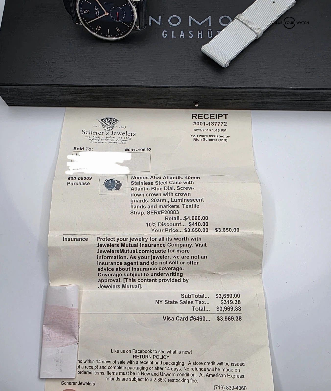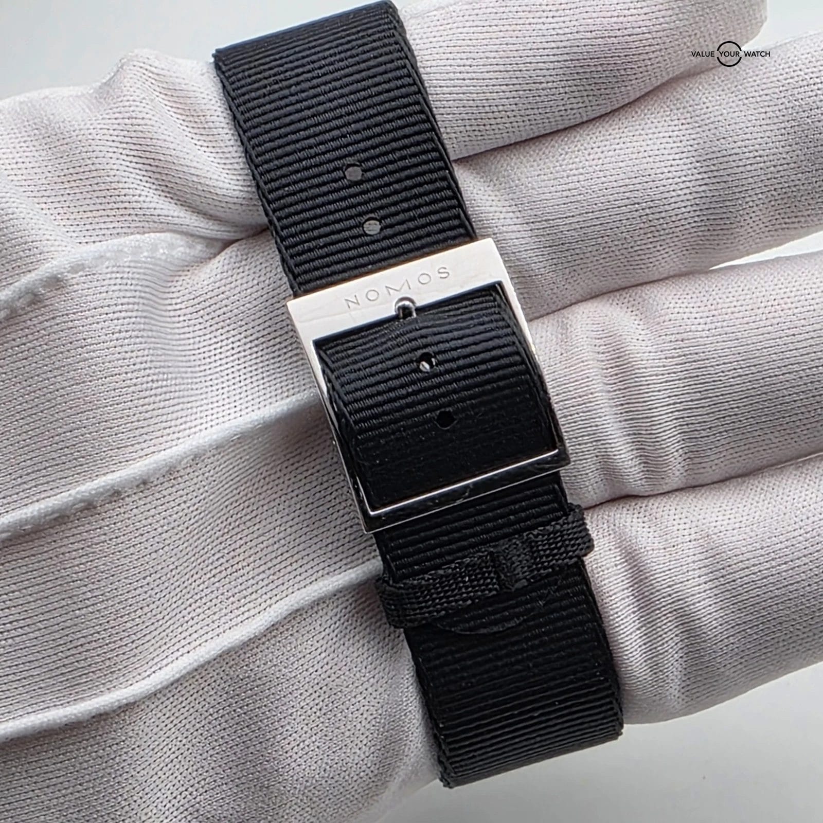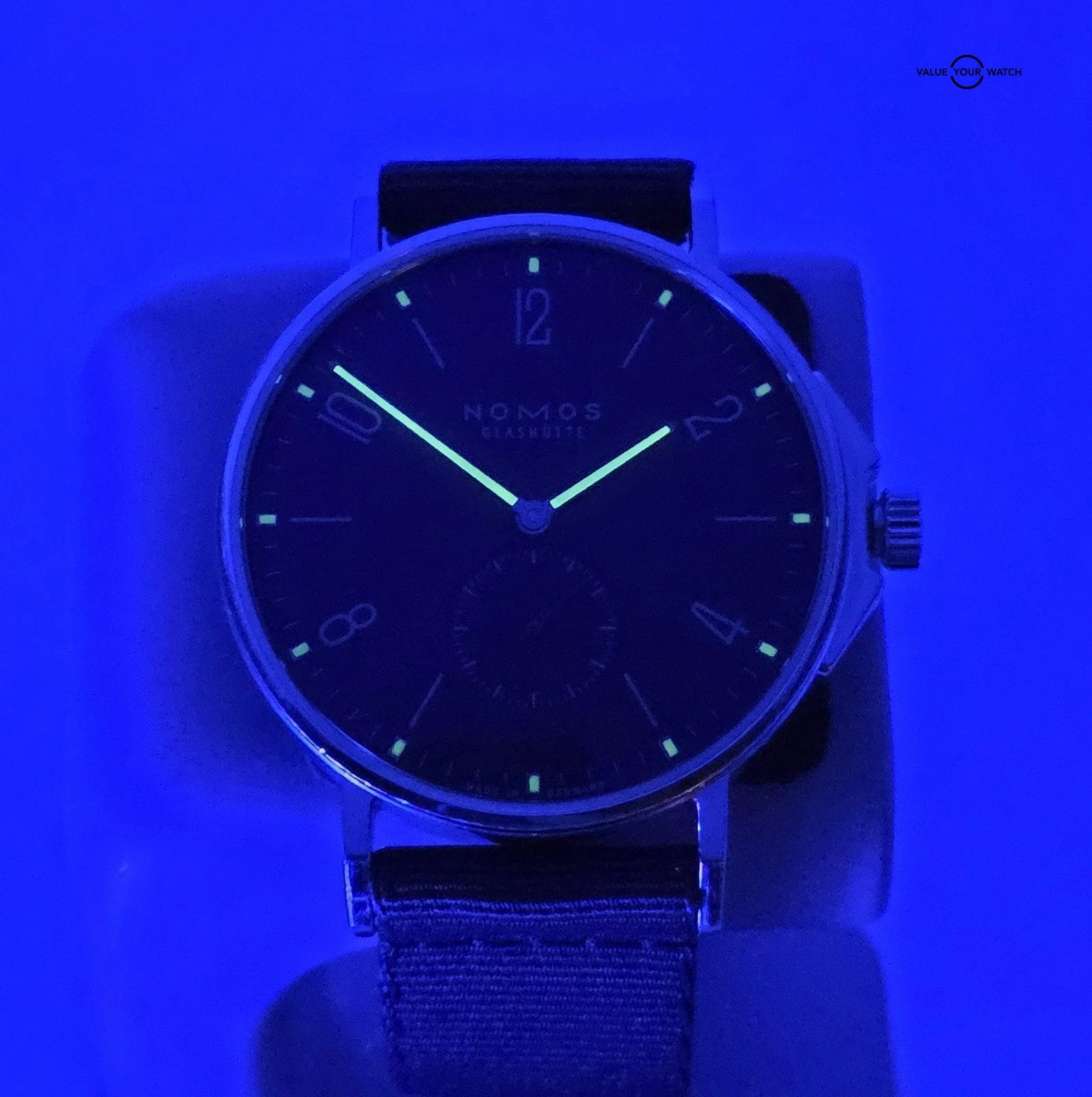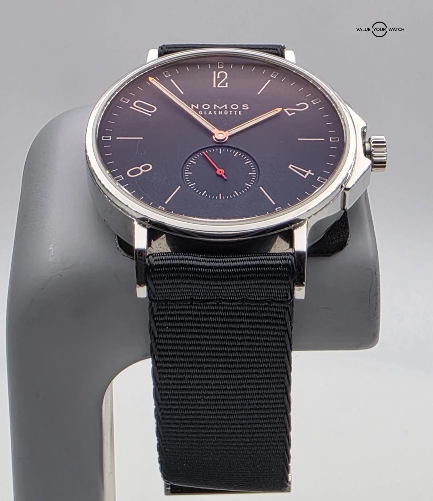 This NOMOS Glashütte Ahoj Atlantik watch is a classic and stylish timepiece for men. It features a black nylon band, a round stainless steel case with a silver finish, and a black dial with a 12-hour dial and small second hand. The watch has an automatic mechanical movement and is water-resistant up to 20 meters (2 ATM). It comes with its original box and packaging.