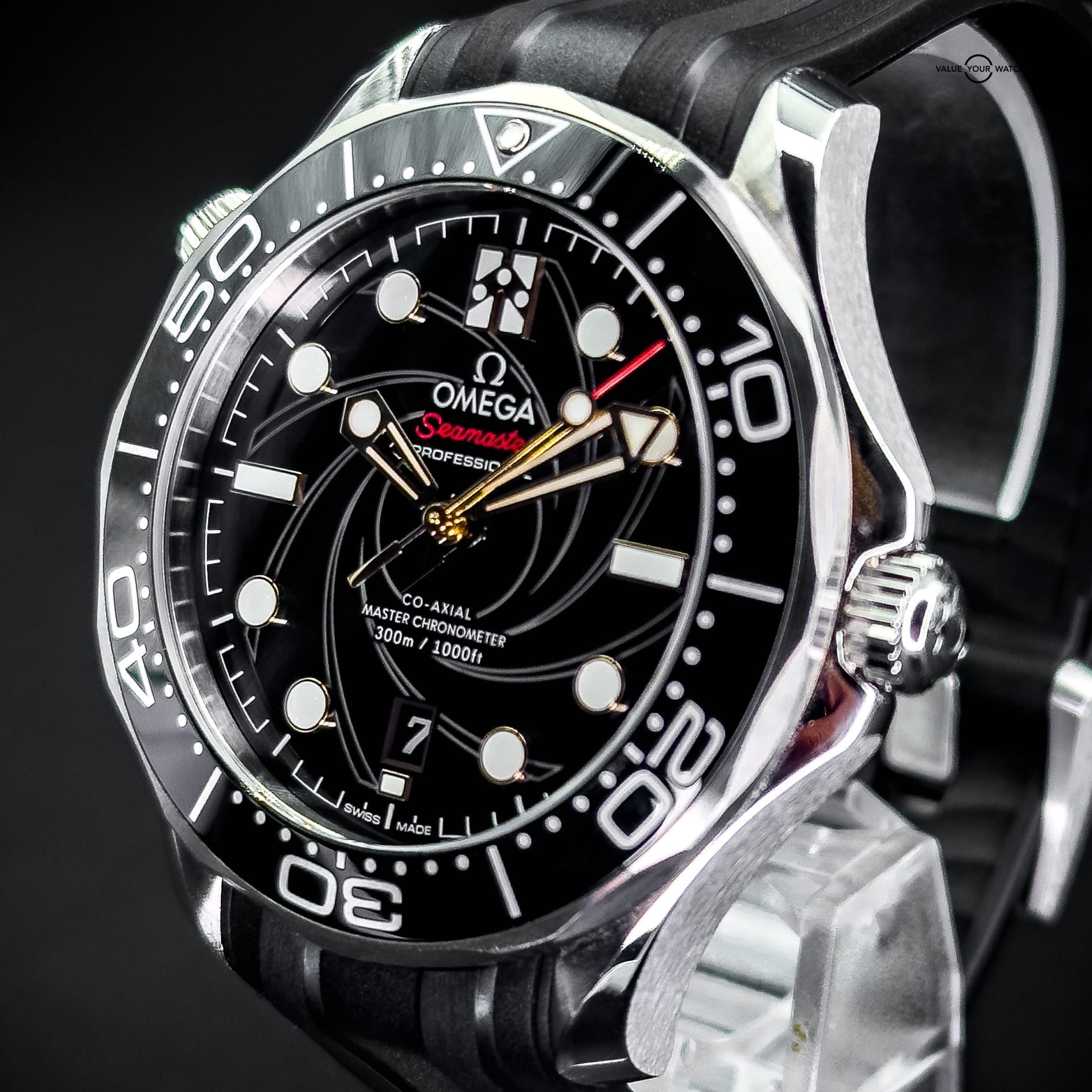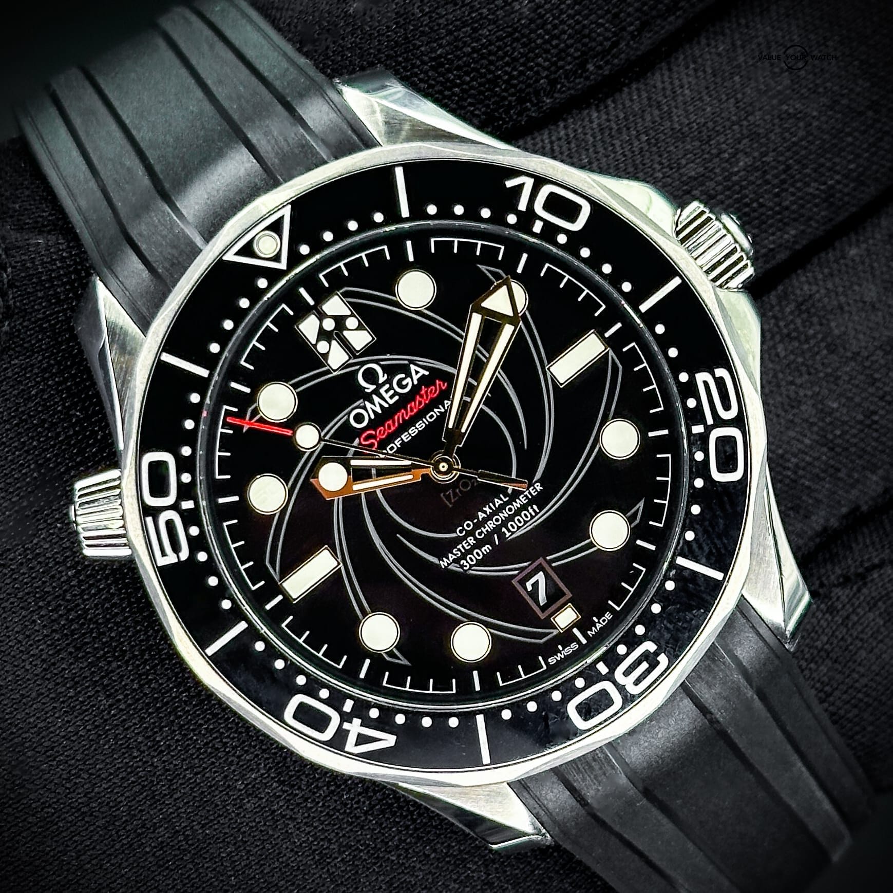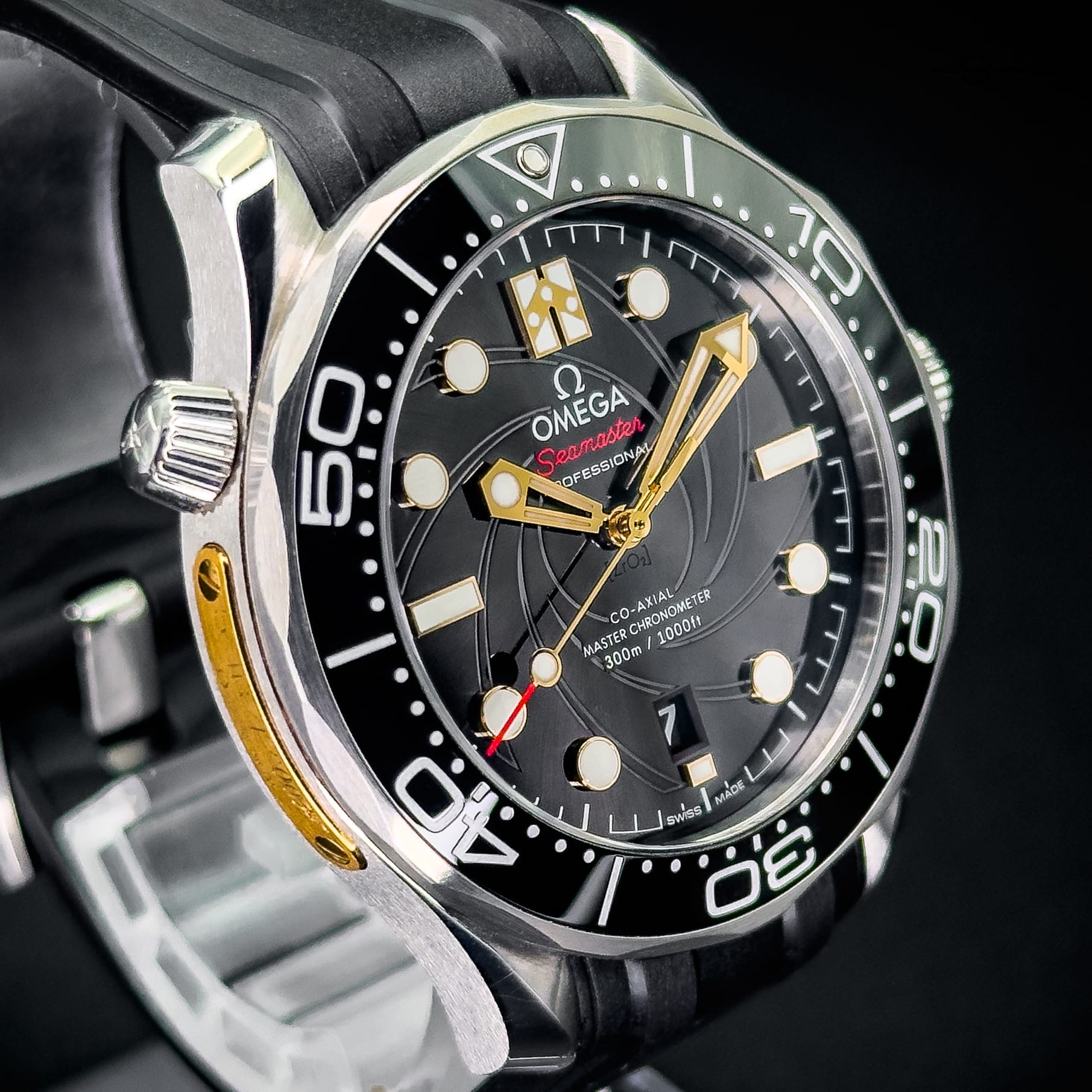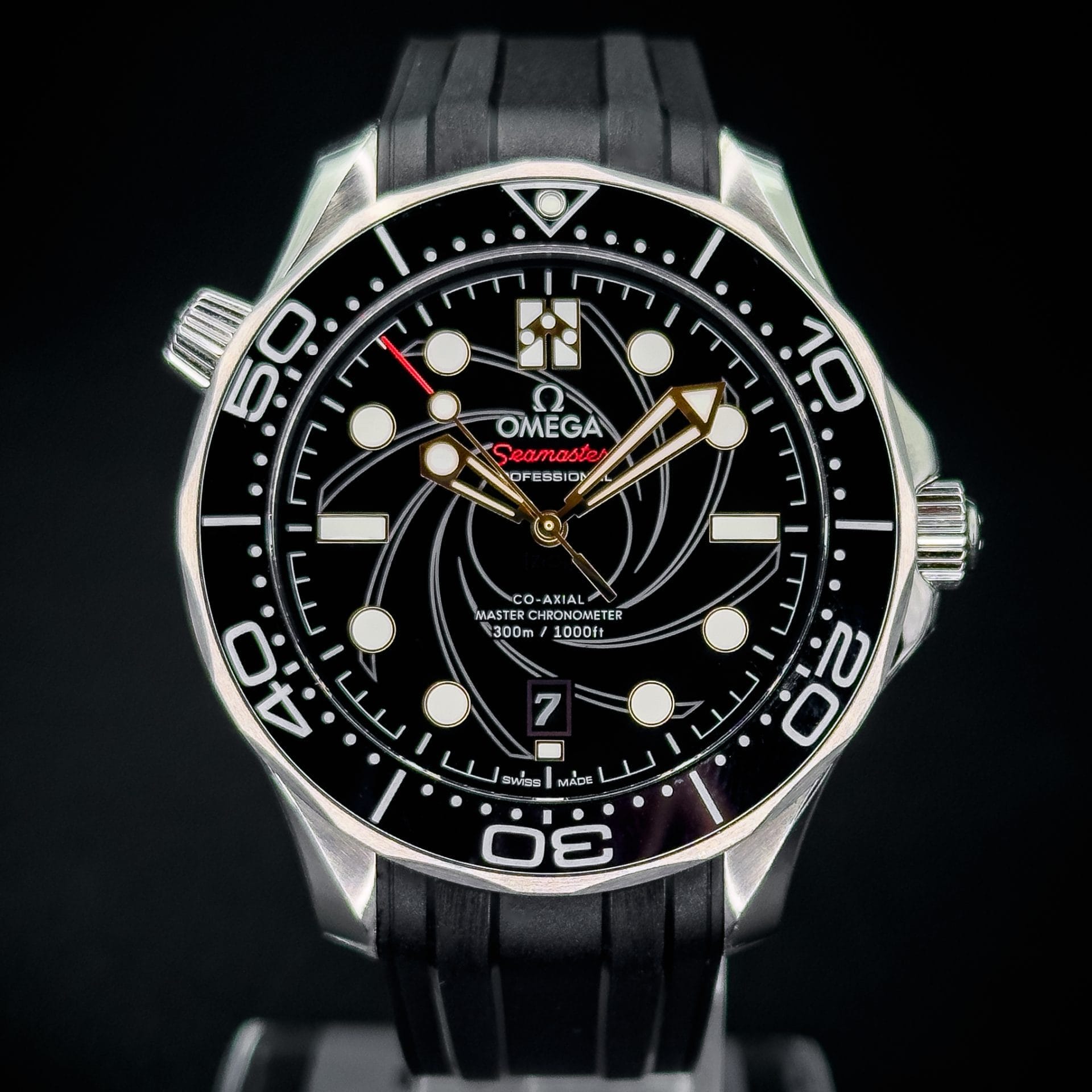 The watch showcases a spiral-brushed black ceramic dial inspired by the iconic gun barrel sequence in James Bond films. A prime feature is the secret “50” at the 10 o’clock position when the lume is active and the number 7 in the date window which appears in the James Bond movie font every 7th day of the month, in homage to Agent 007.