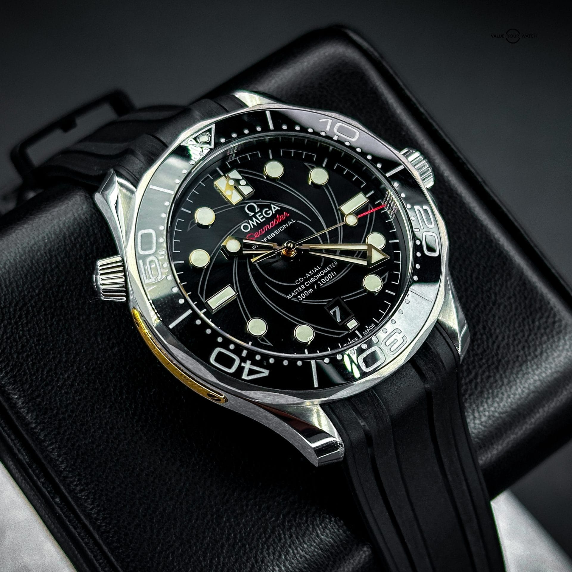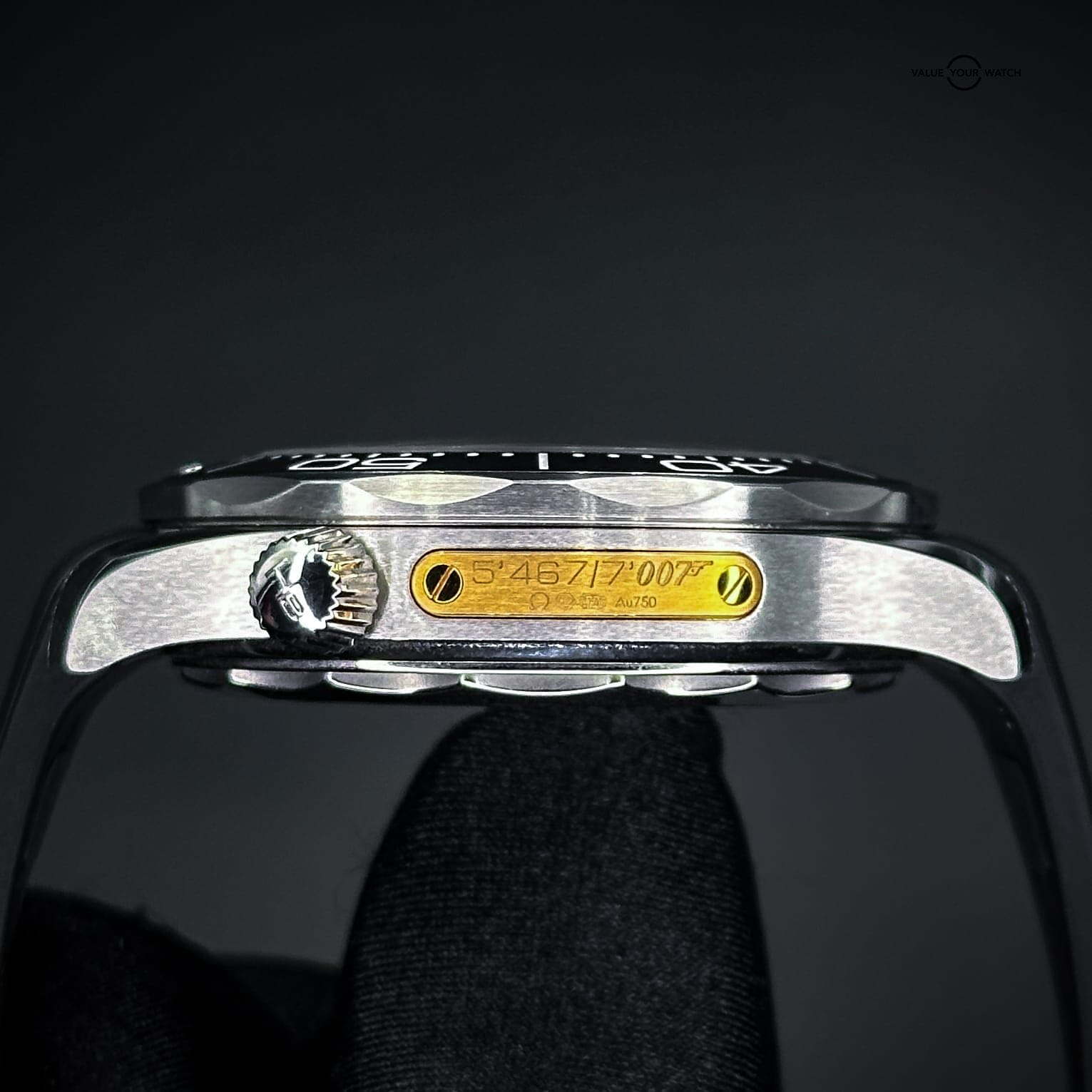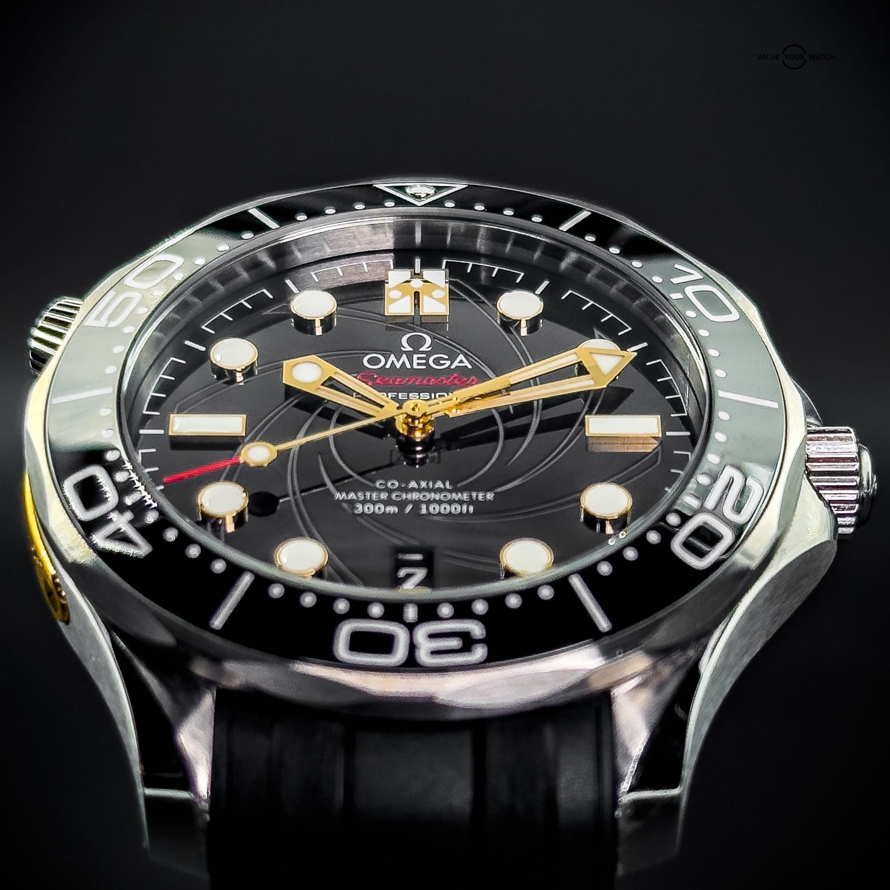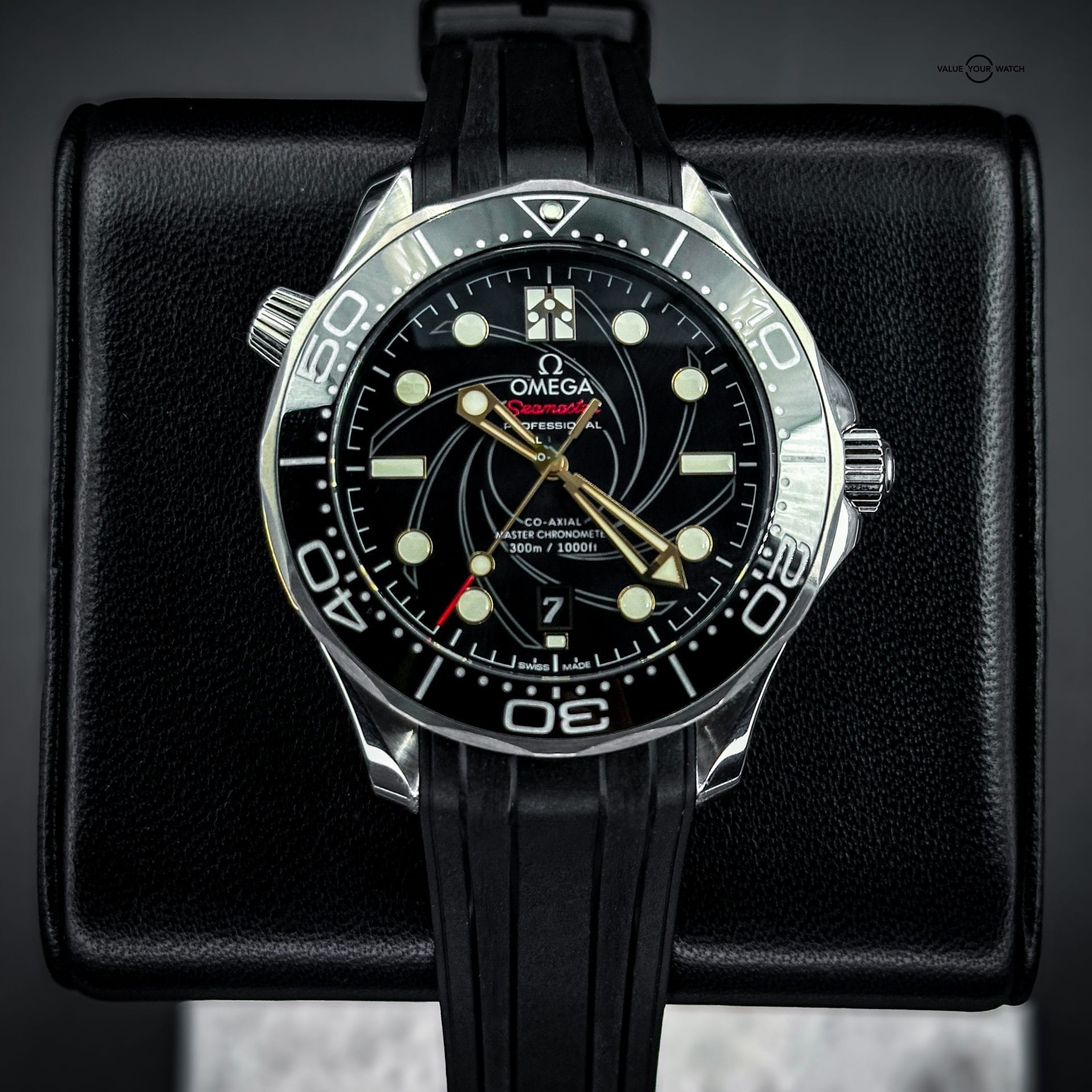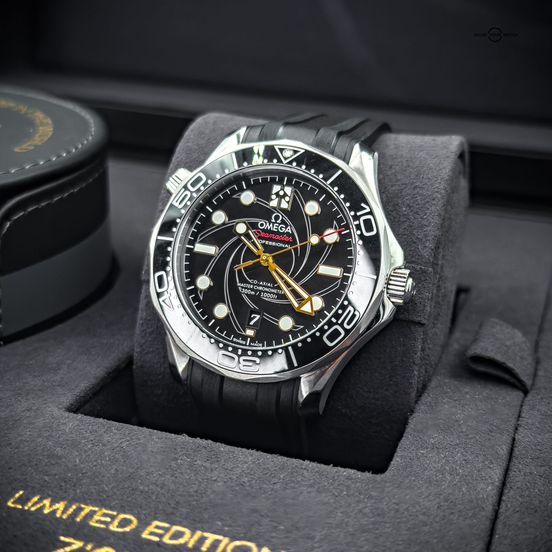 The watch showcases a spiral-brushed black ceramic dial inspired by the iconic gun barrel sequence in James Bond films. A prime feature is the secret “50” at the 10 o’clock position when the lume is active and the number 7 in the date window which appears in the James Bond movie font every 7th day of the month, in homage to Agent 007.