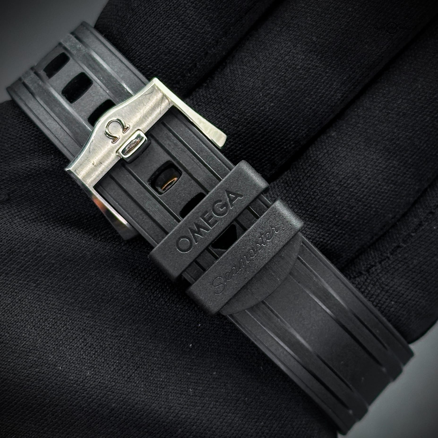 The watch is fitted with a sleek, black rubber strap that integrates a polished and brushed stainless steel buckle, designed for both comfort and style. The strap includes a hidden “007” engraving, adding an exclusive touch for fans and collectors. Additionally, a stainless steel bracelet is included with more “007” signature branding.