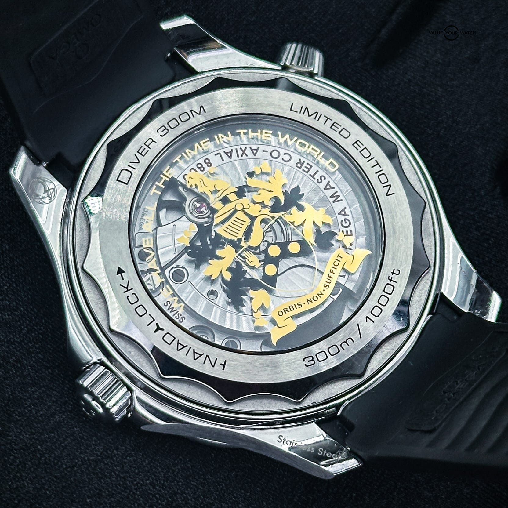 The sapphire crystal case back is adorned with a series of markings significant to James Bond fans. It includes a laser-engraved Bond family coat-of-arms, along with the words “Orbis Non Sufficit” (The World Is Not Enough) and “We Have All the Time in the World,” encapsulating Bond’s heritage and adventures.