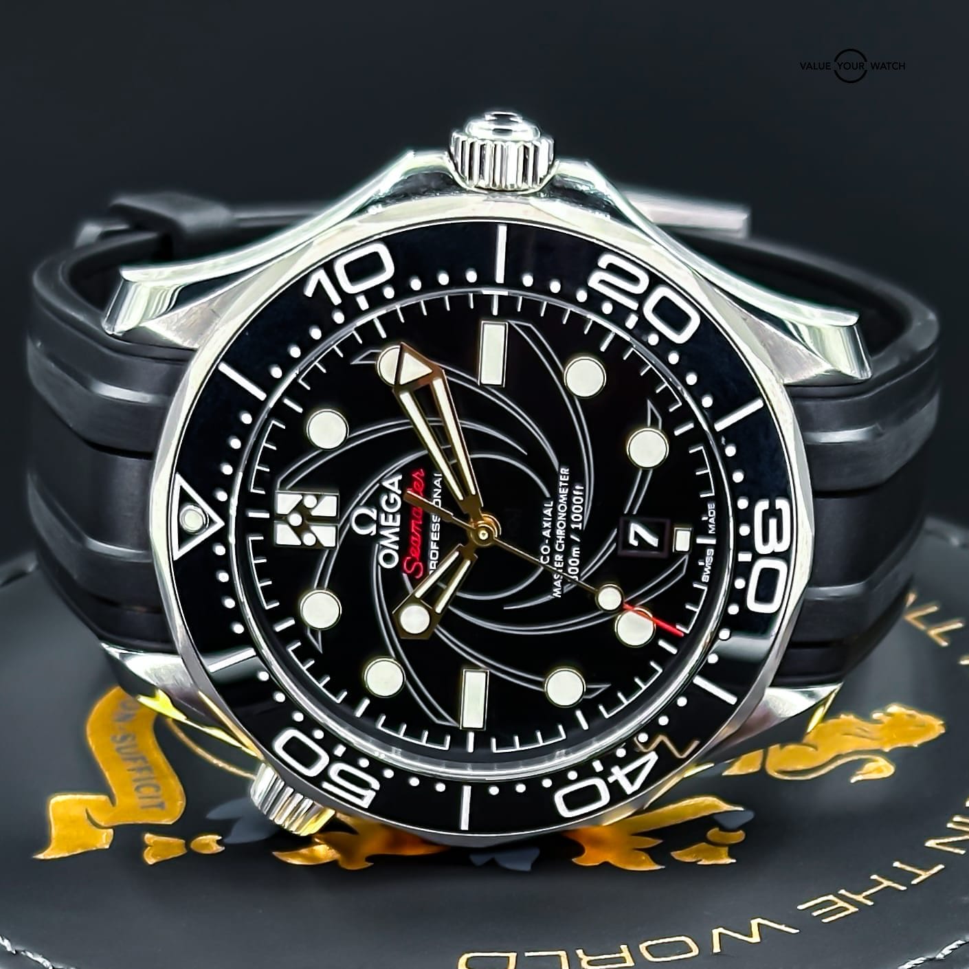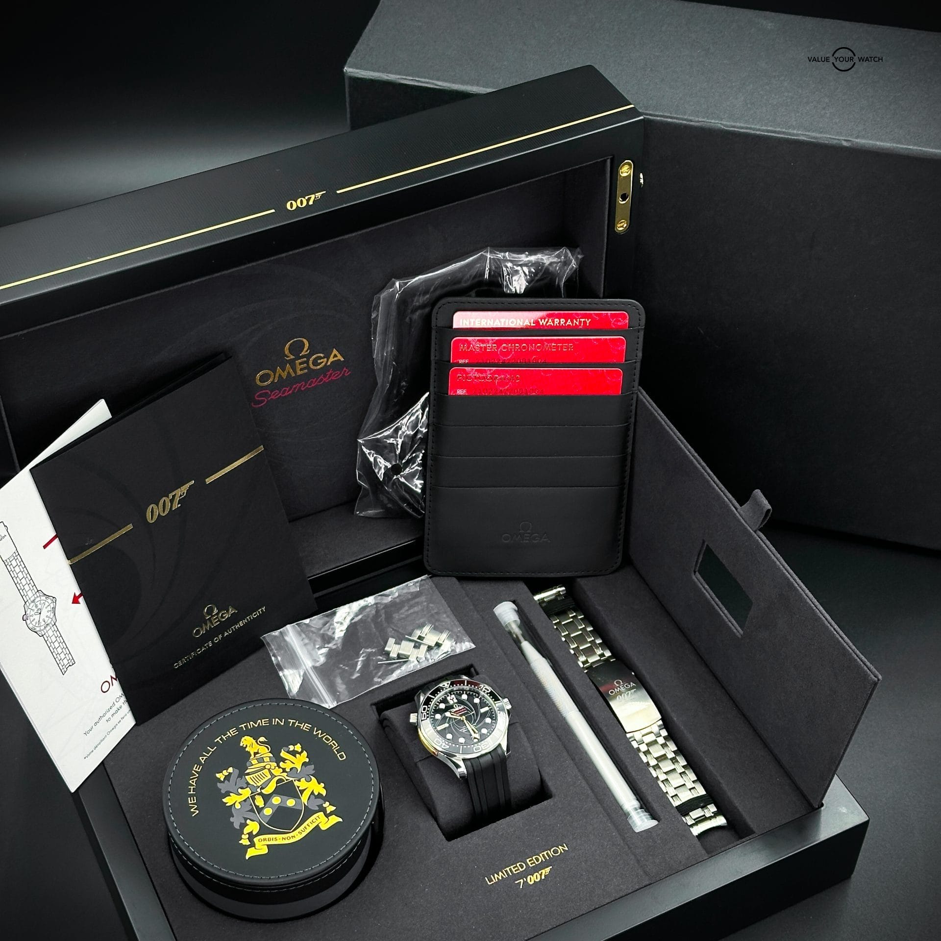 The watch is in excellent, near mint condition with the smallest signs of wear across the case. No dings, dents, chips, or scrapes. Bezel is flawless. The crystal is in excellent shape. Watch is running optimally. Comes as a full set with its outer box, inner presentation box, papers (certificate of authenticity), 007 travel case, cleaning cloth, all three cards, extra links, 007 stainless steel bracelet, and strap changing tool.