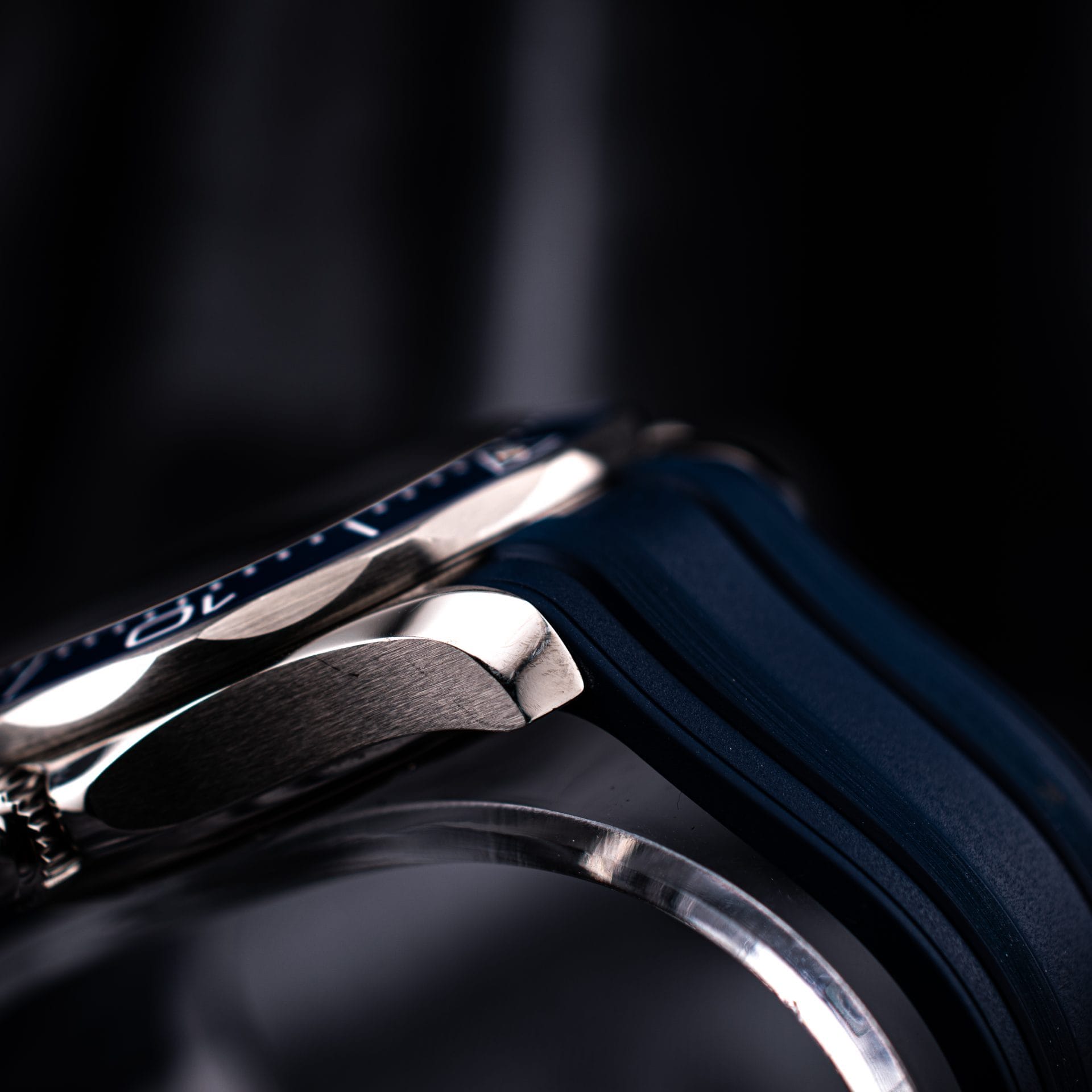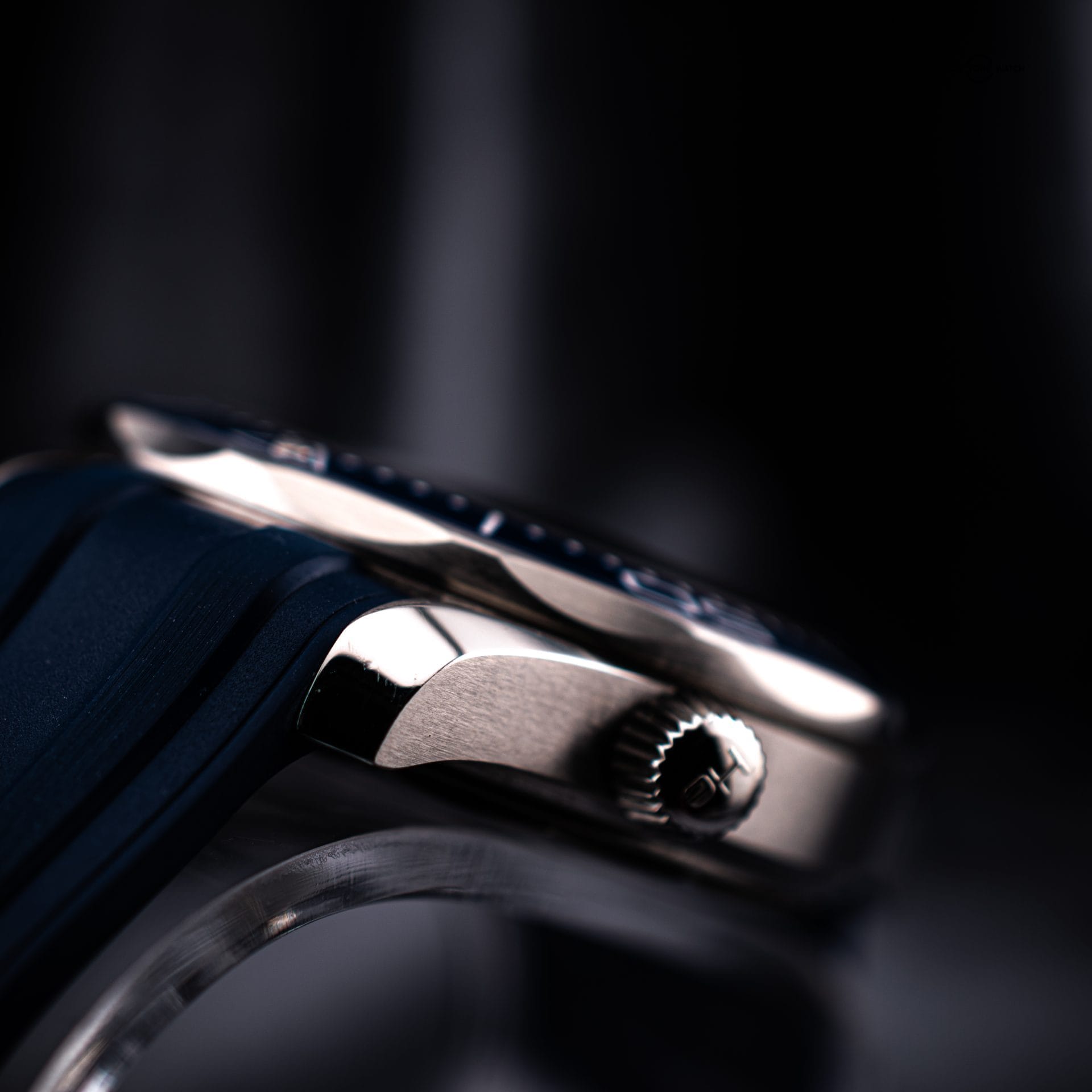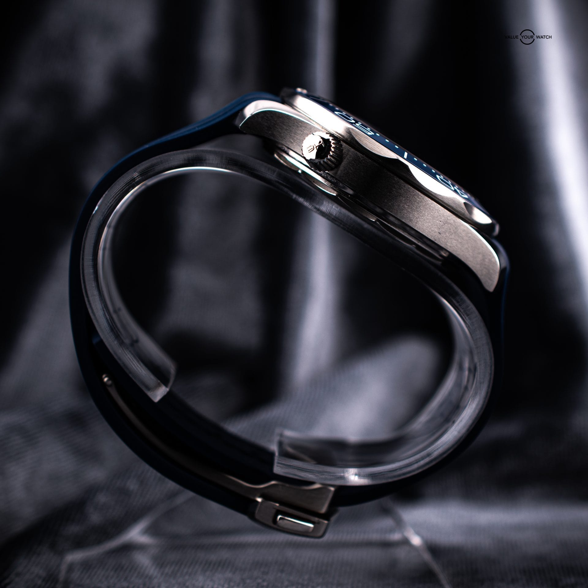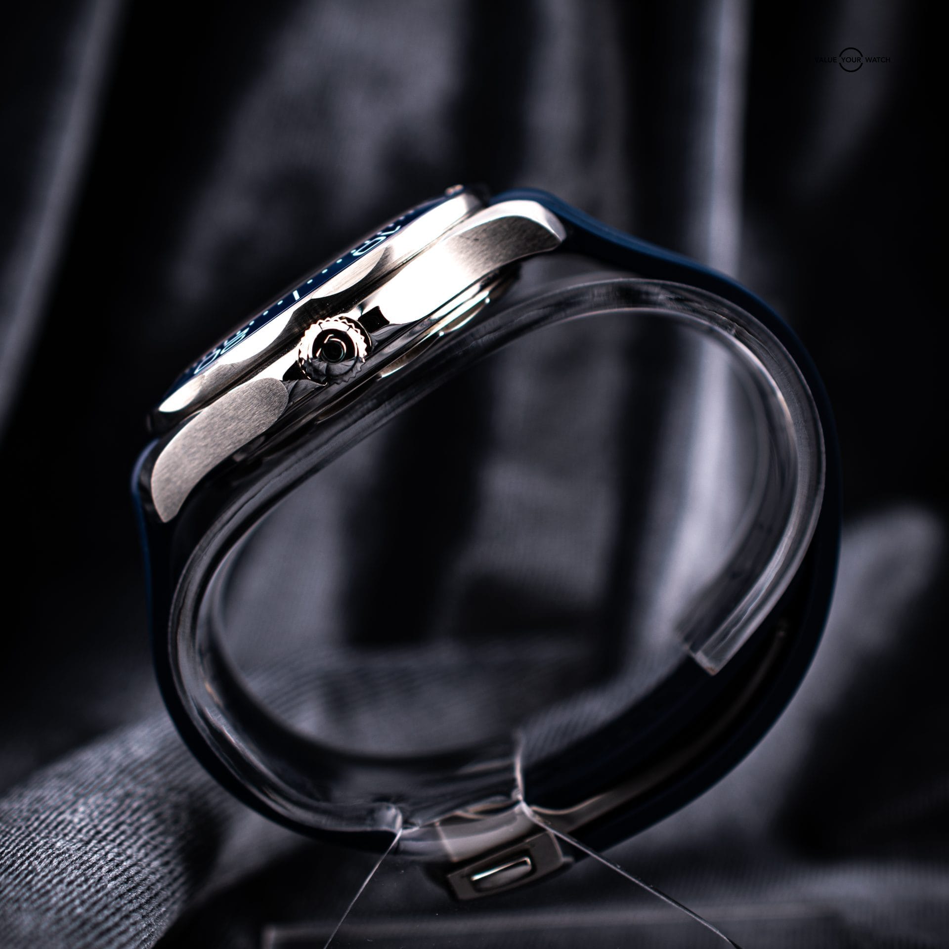 - Ceramic Dial and Bezel: The stunning blue ceramic dial is complemented by a matching blue ceramic bezel with a white enamel diving scale. These high-tech materials are extremely durable and fade-resistant, ensuring that the watch retains its aesthetic appeal over time.