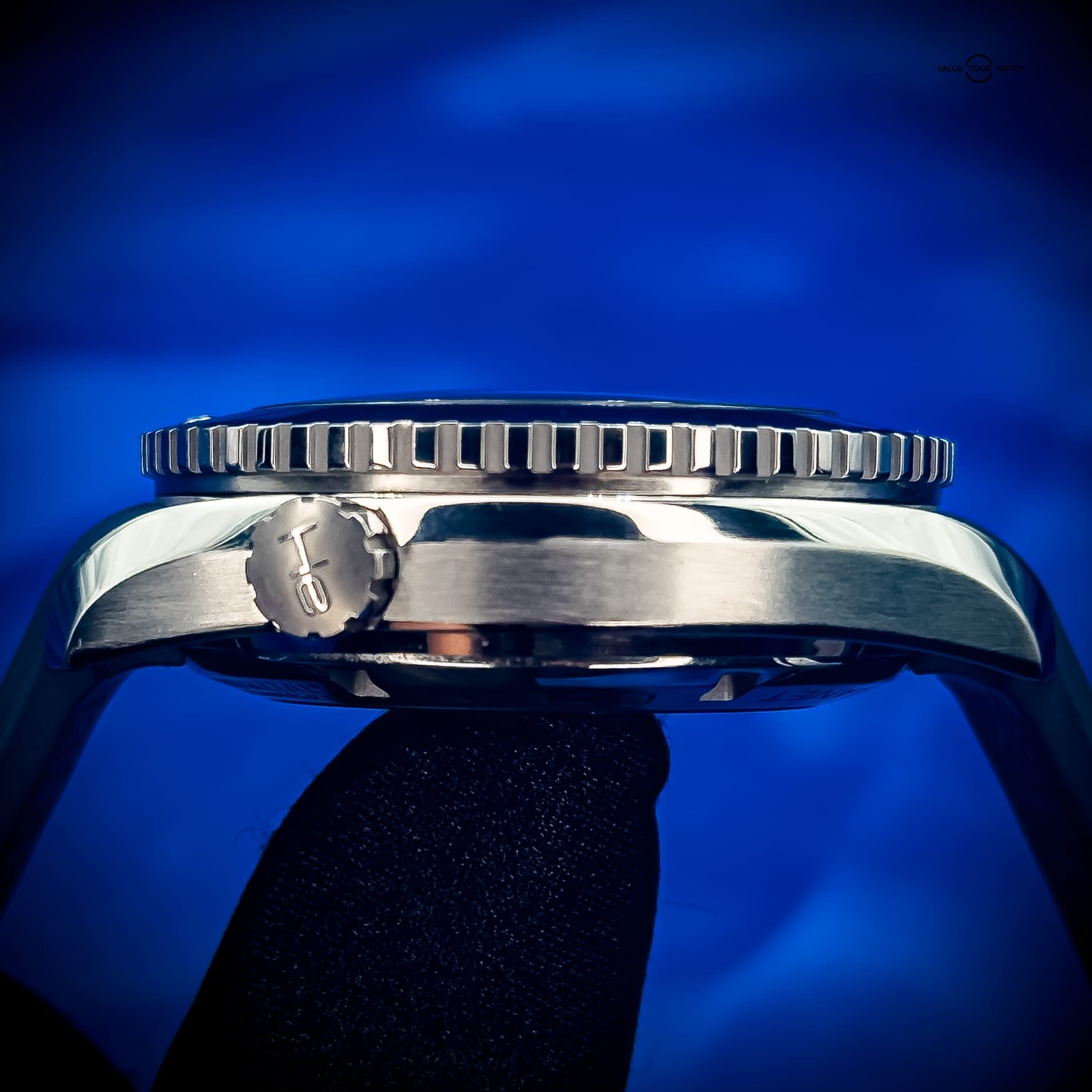 The watch is in very good condition with minimal wear across the case. No major dings or dents. Bezel is clean. The crystal is in excellent shape and the case is overall well kept. Comes complete with its inner and outer box, papers (instruction manual), and all three cards.