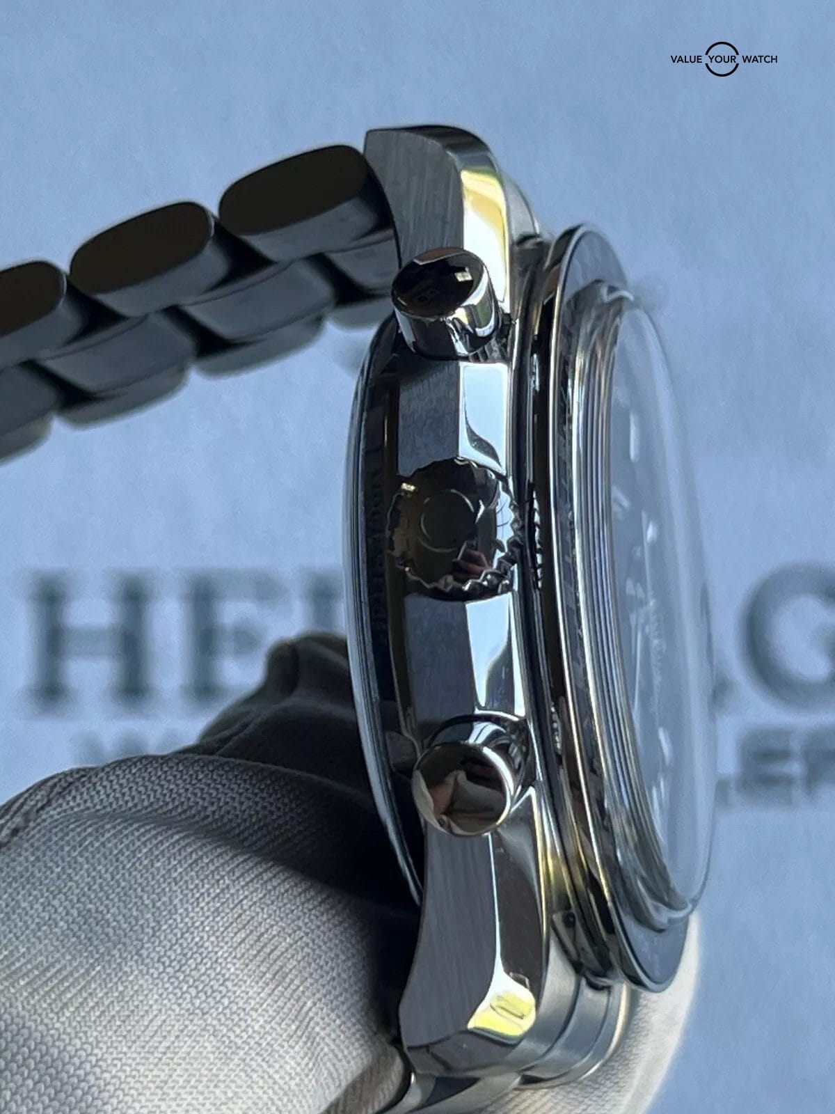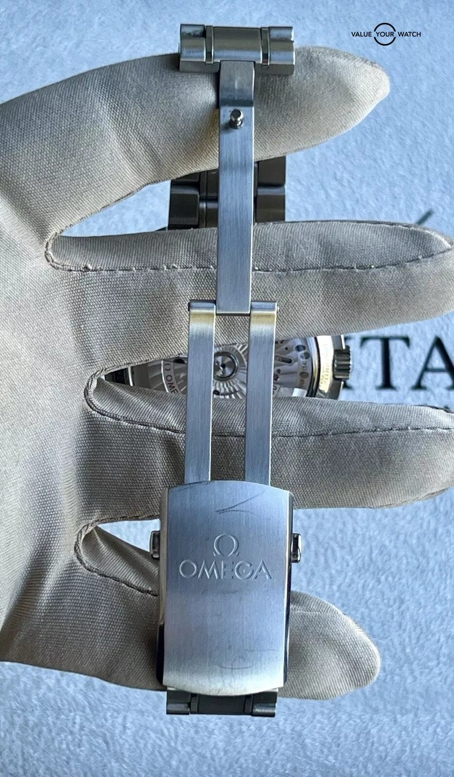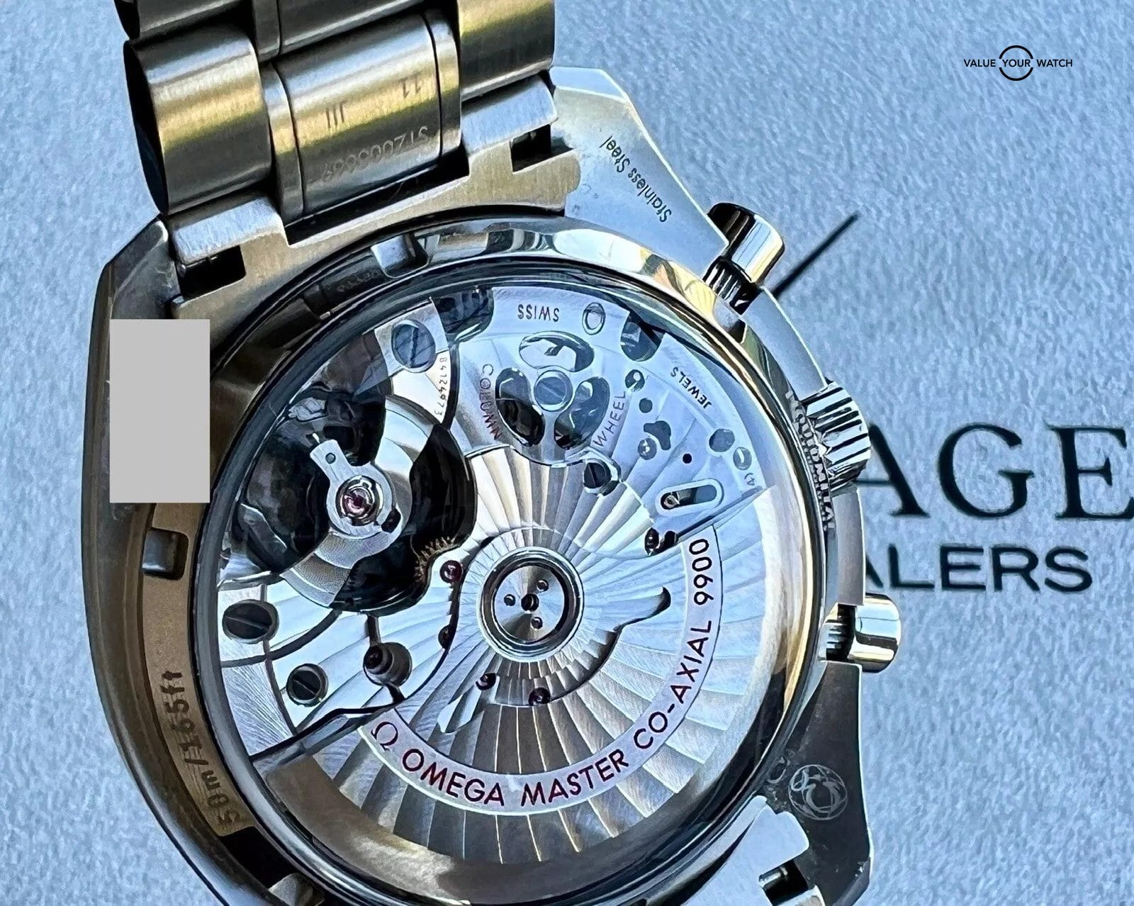 This is a complete set of the OMEGA Speedmaster Racing 2022 wristwatch, featuring a black dial with baton indexes and a silver stainless steel bracelet with a 21 mm lug width. The watch has a round shape with a case size of 44.25 mm and a bezel type of tachymeter. The bezel color is black, and the watch has a unique features like luminous hands, multi-dial, co-axial, chronometer, date indicator, magnetic-resistant, sapphire crystal, and chronograph.