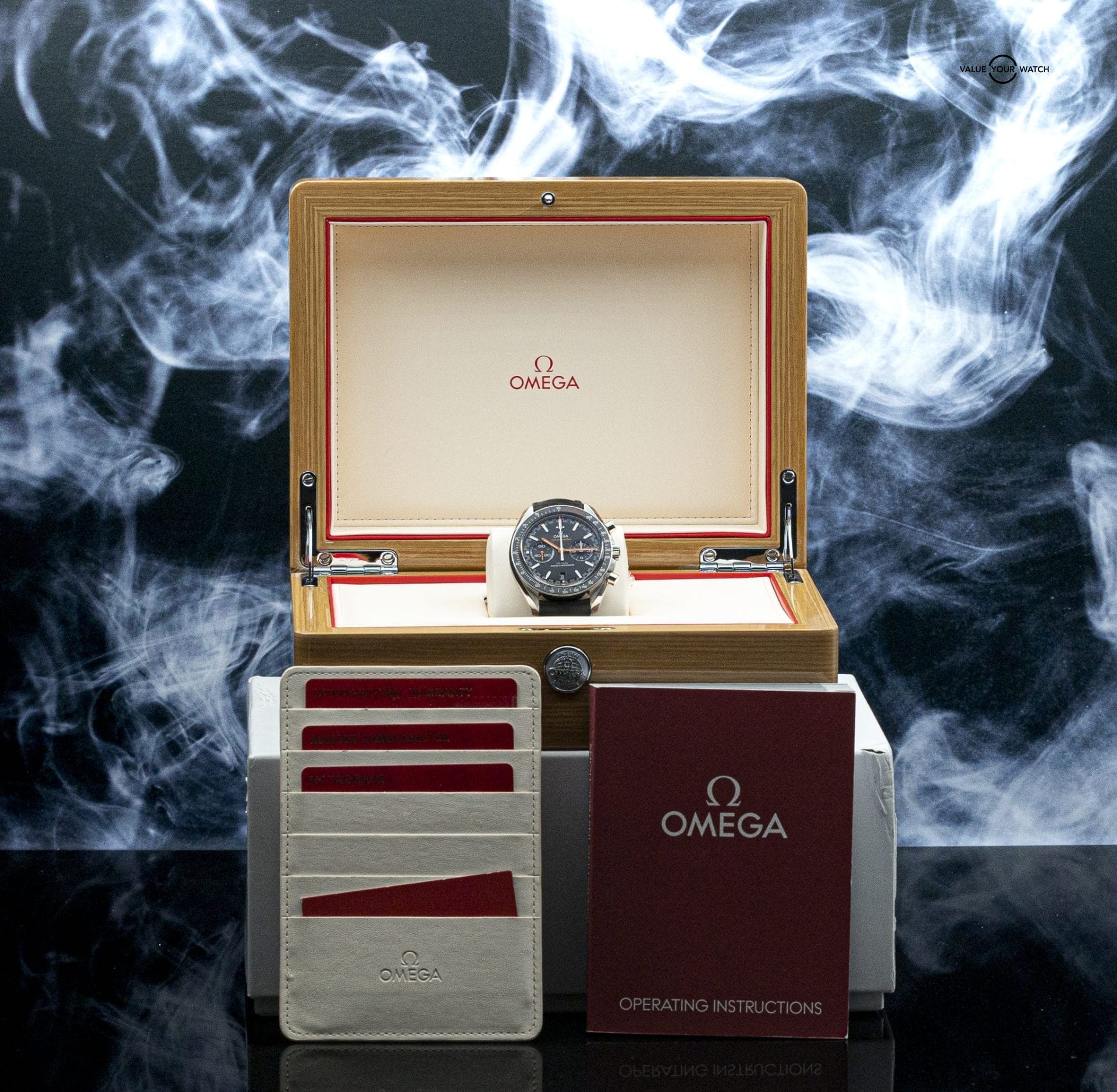design to one of the most respected chronograph platforms in horology. The Co-Axial Master Chronometer Calibre 9900 inside is METAS-certified to resist magnetic fields up to 15,000 gauss while maintaining chronometer accuracy—technology that didn’t exist in older Speedmasters. Black ceramic bezel is scratch-proof and fade-resistant, while the black dial with red accents captures racing heritage without being over-the-top. The black racing strap with red stitching completes the motorsport aesthetic. At 44.25mm this wears with substantial presence while the 60-hour power reserve means you can take it off Friday and put it back on Monday without losing time. This 2019 example shows no signs of wear—looks virtually unworn with complete presentation set.