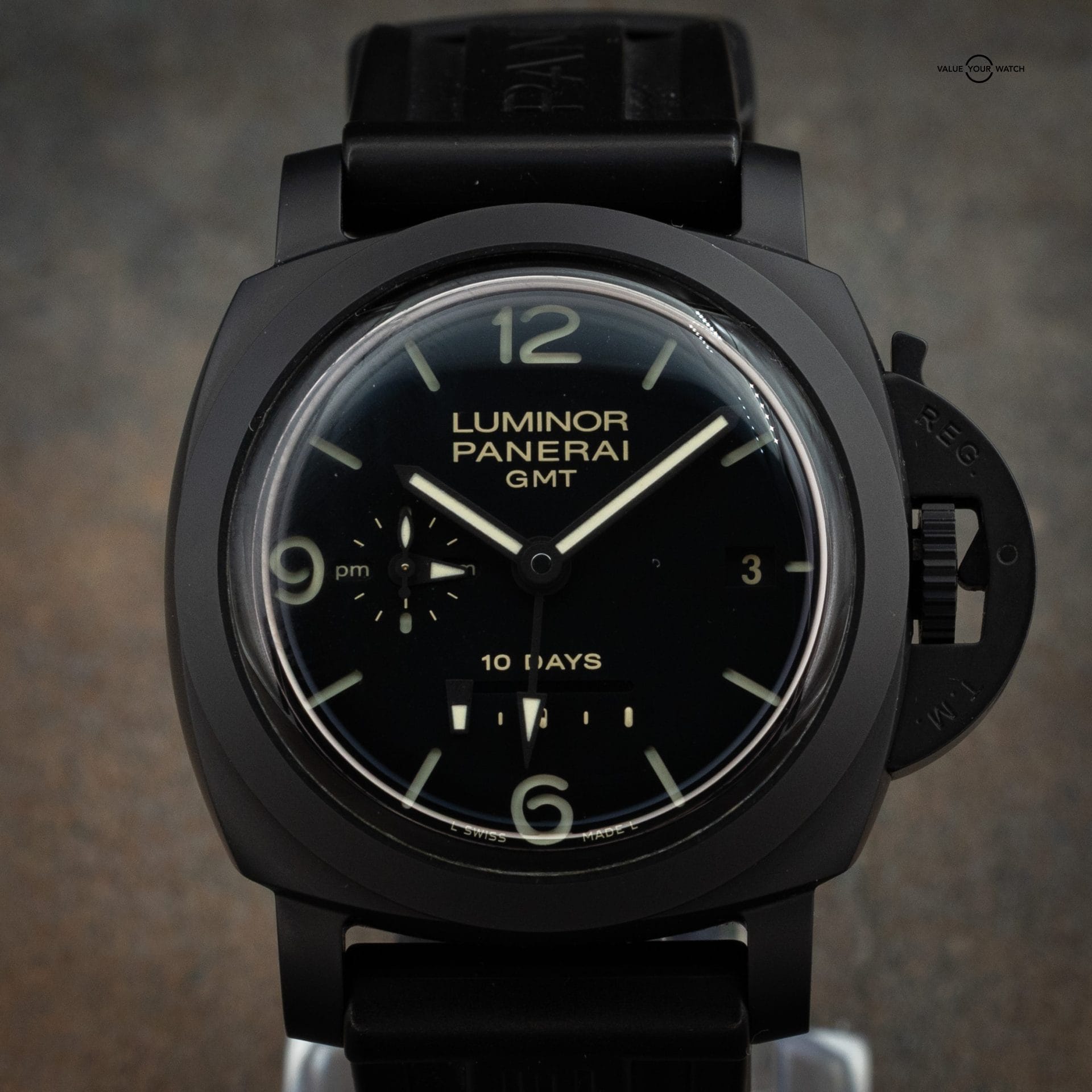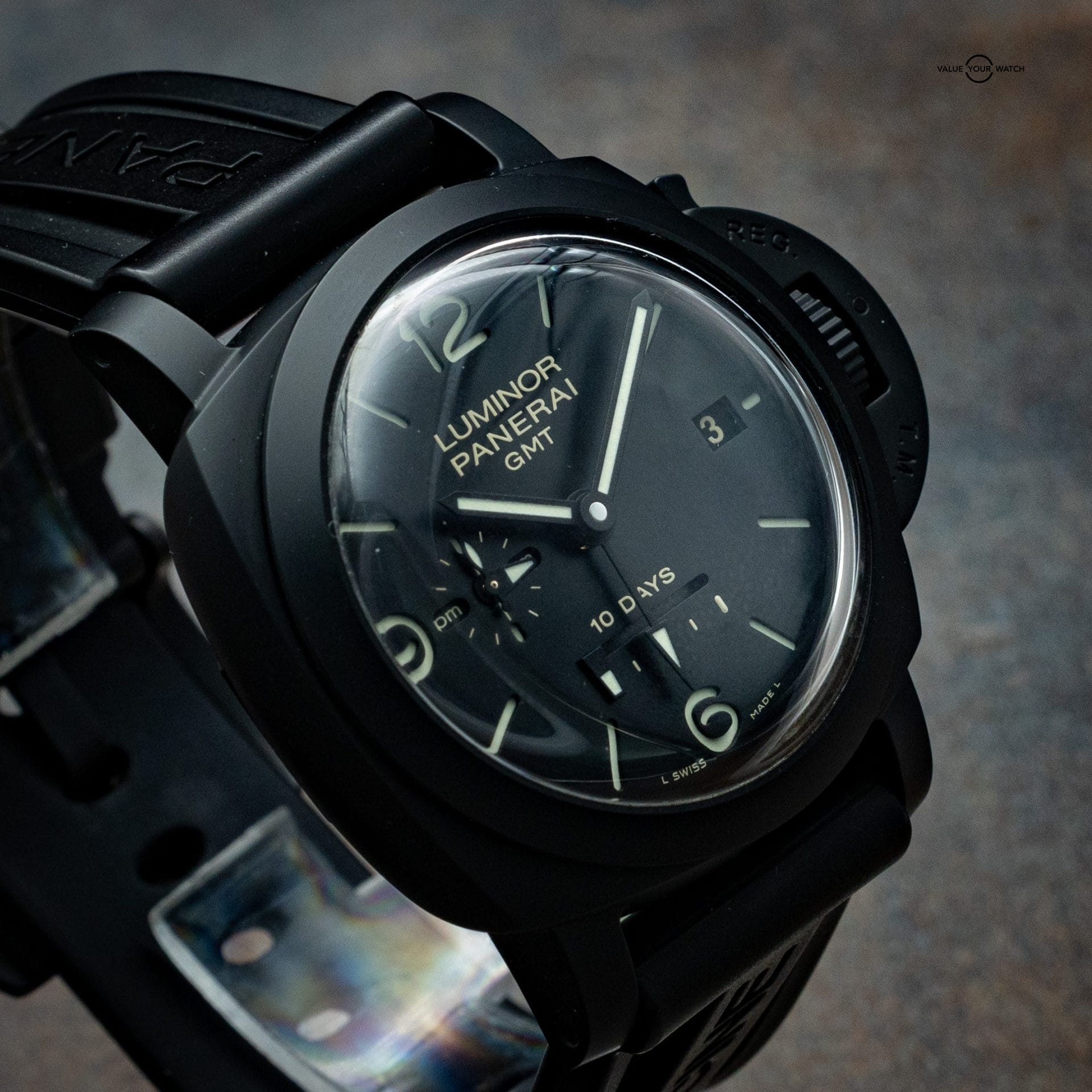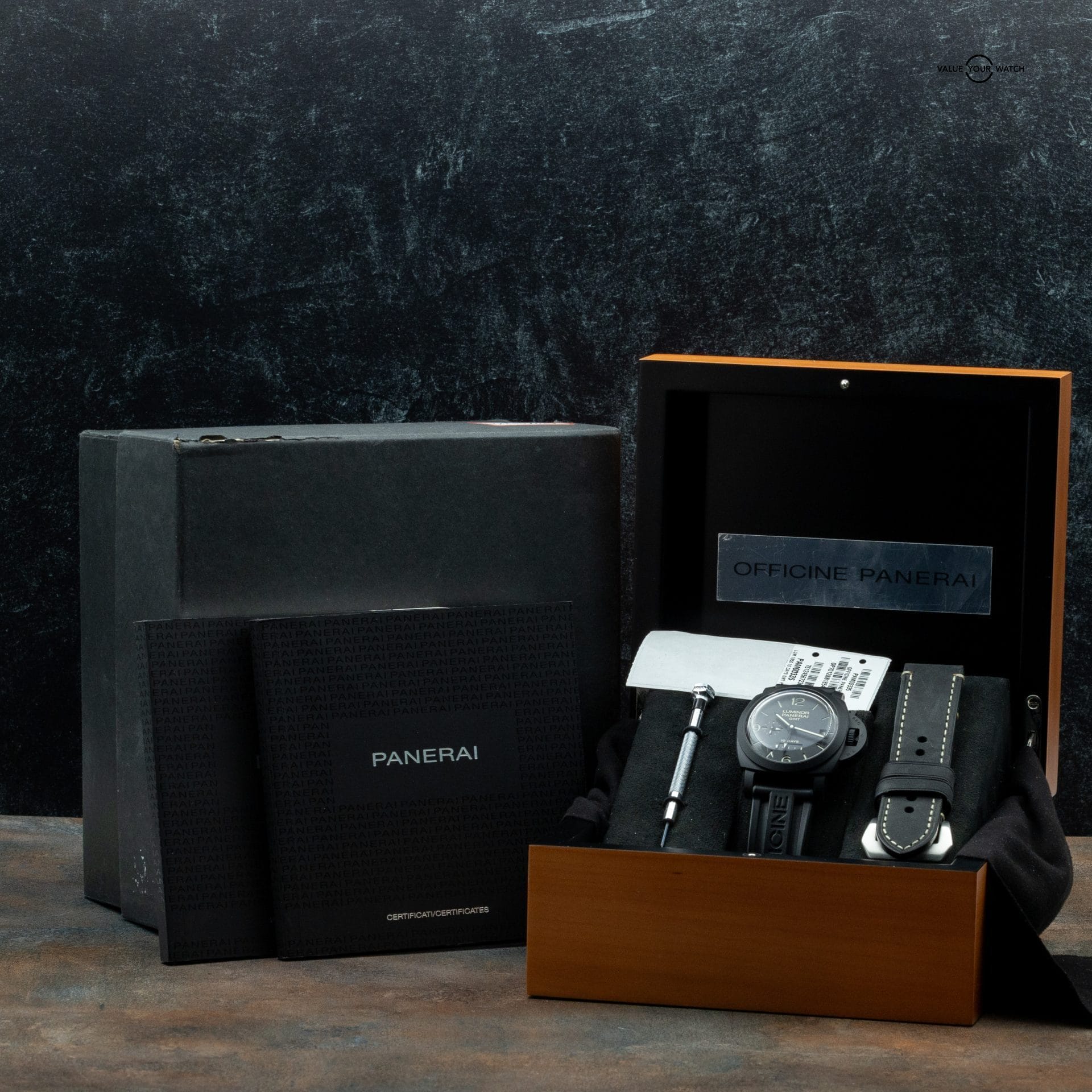 This Panerai PAM00335 is an exceptional timepiece featuring a 44mm ceramic case, 10-day power reserve, and GMT function. The watch is in excellent condition and comes as a full set with double box, booklets, warranty card, and an additional black leather strap, with a purchase date of 2018.