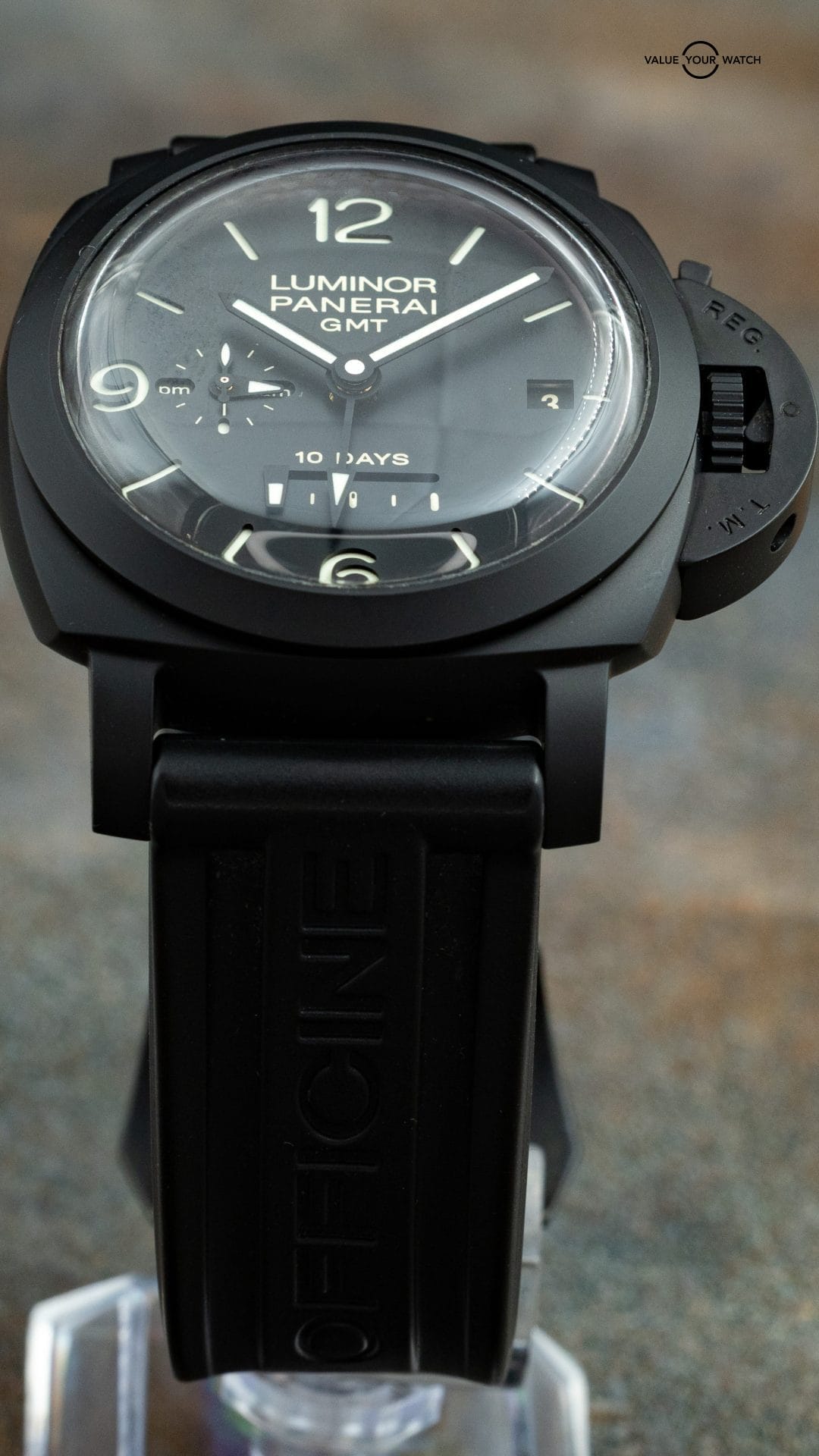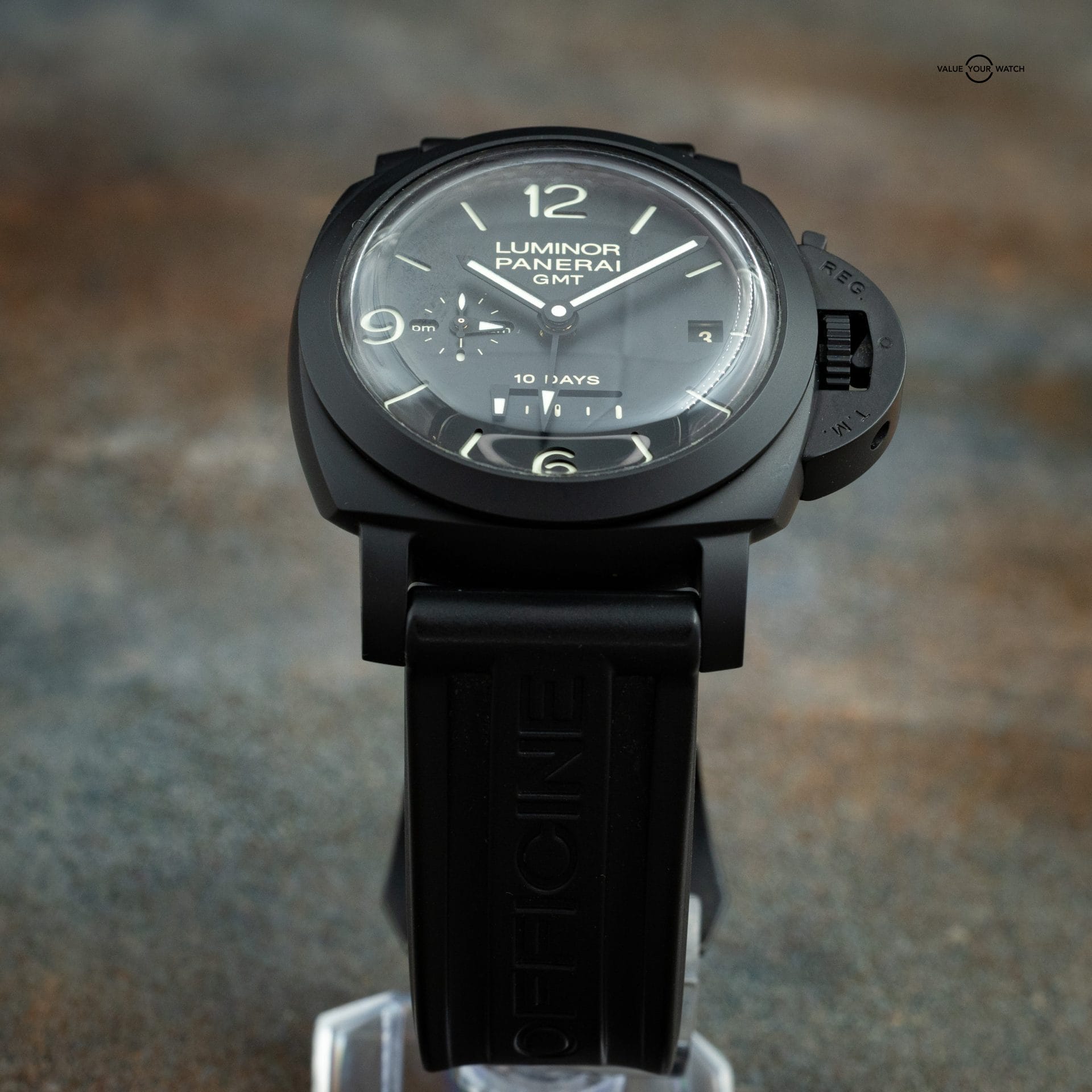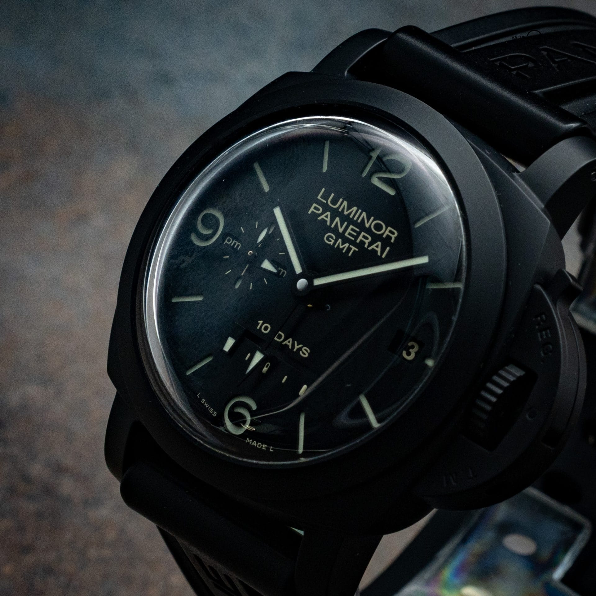This Panerai PAM00335 is an exceptional timepiece featuring a 44mm ceramic case, 10-day power reserve, and GMT function. The watch is in excellent condition and comes as a full set with double box, booklets, warranty card, and an additional black leather strap, with a purchase date of 2018.