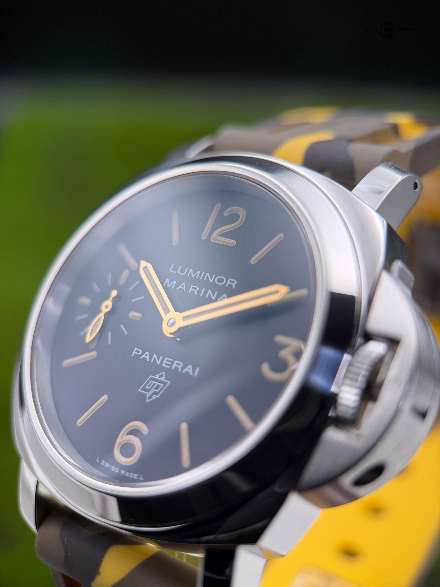 This PAM00632 is in very good pre-owned condition, consistent with careful use. The case shows light surface wear appropriate for its age. The watch is fitted with a new aftermarket camo rubber strap, and the original Panerai leather strap is included, showing light wear and natural patina.