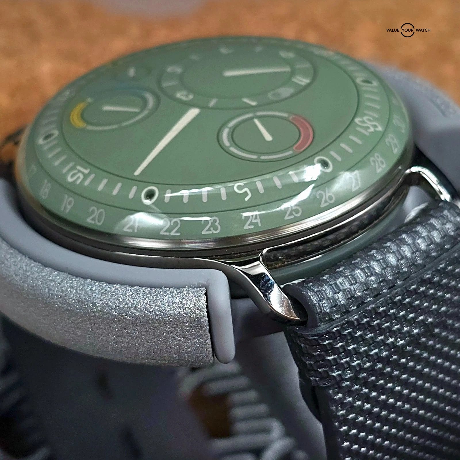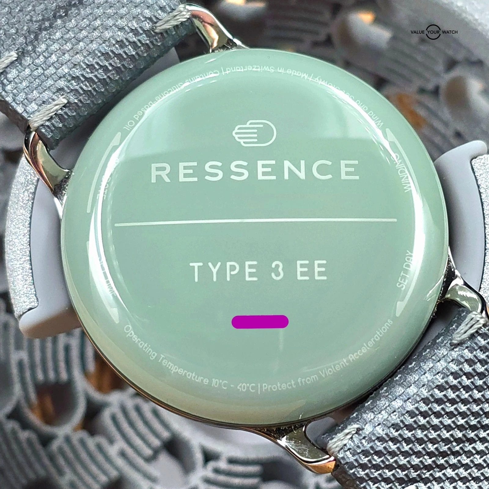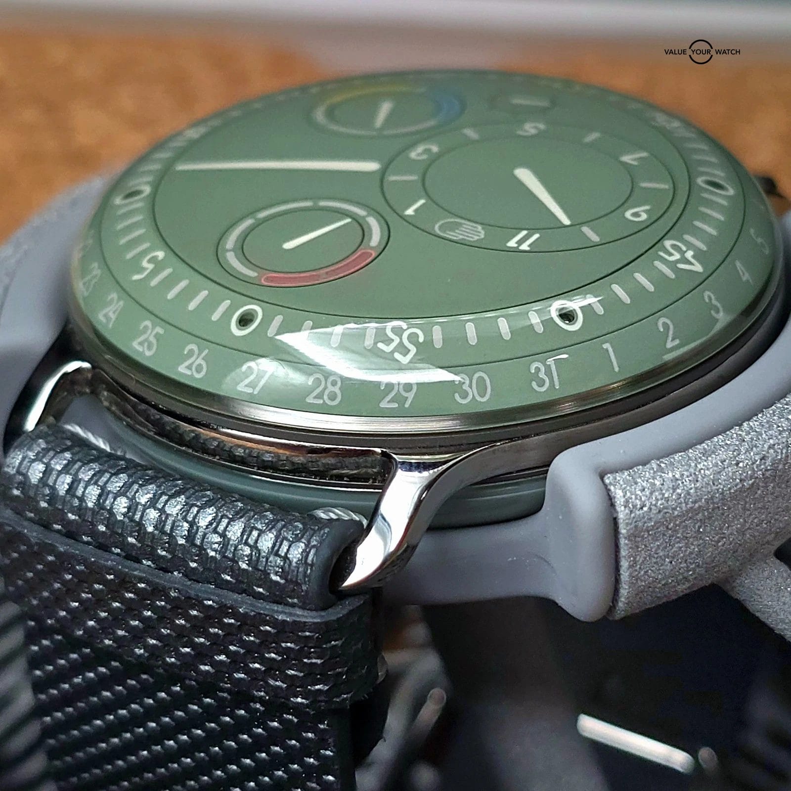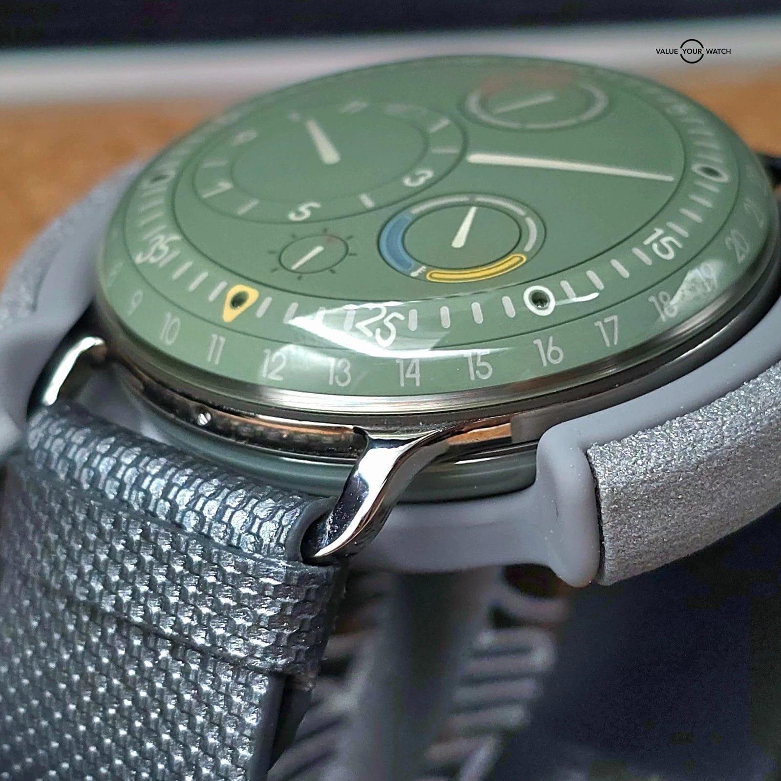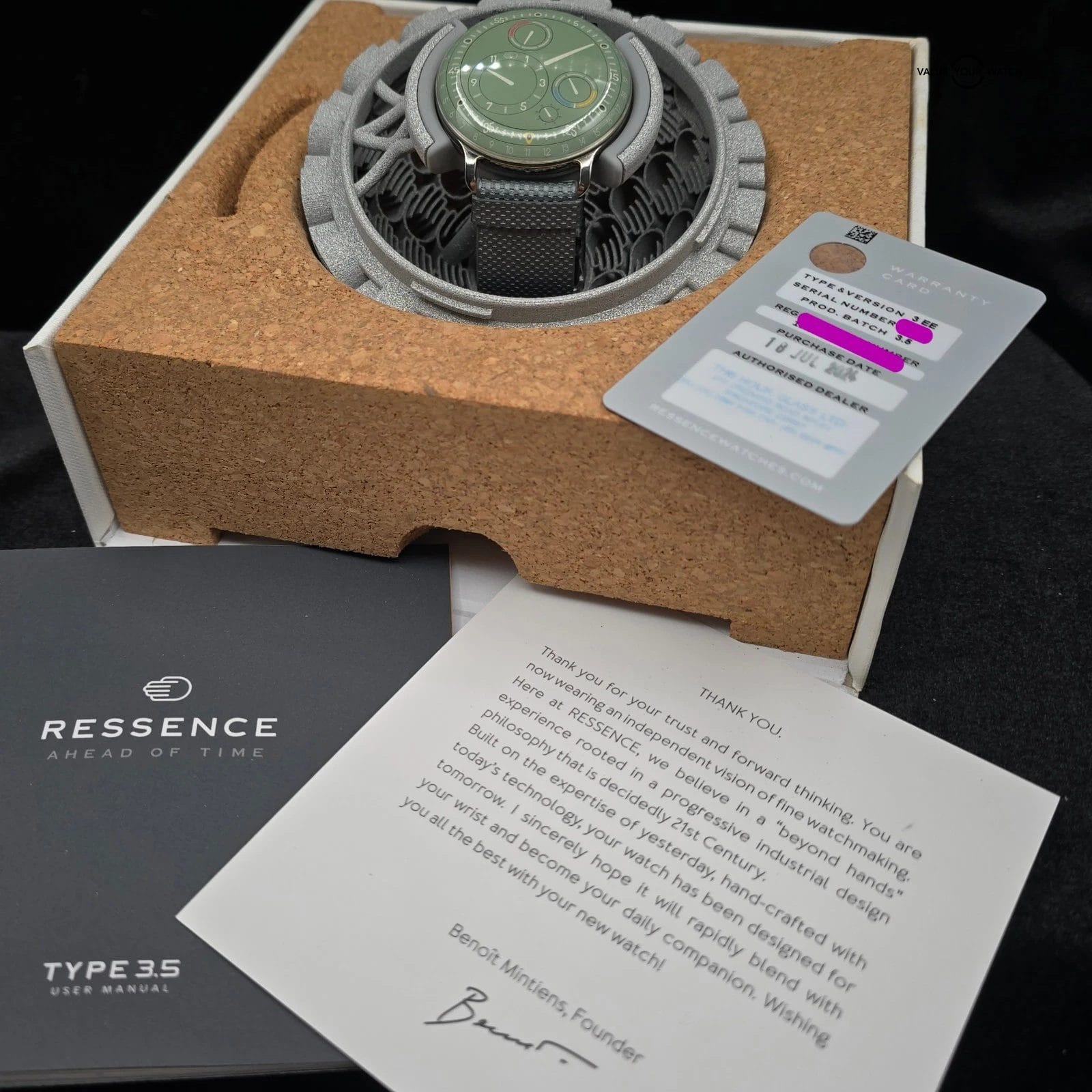 Up for sale here is a very nice example of one of the more colorful watches in the Ressence Type 3 lineup, with an amazing natural green color- called the Eucalyptus. Arguably the best color of the lineup, and not easy to come by. Ref. 3.5EE.