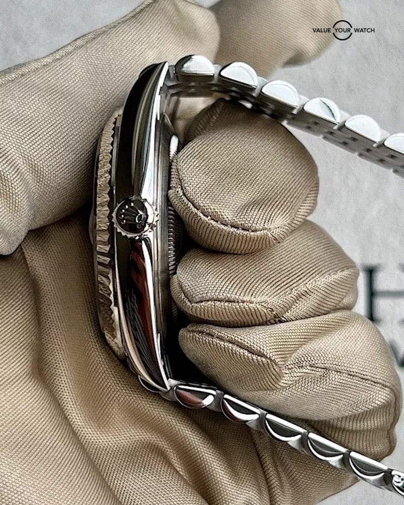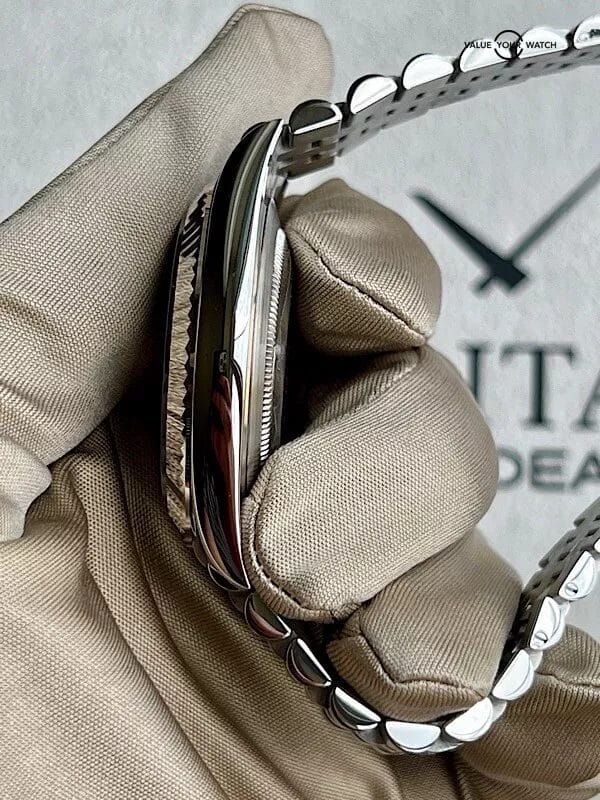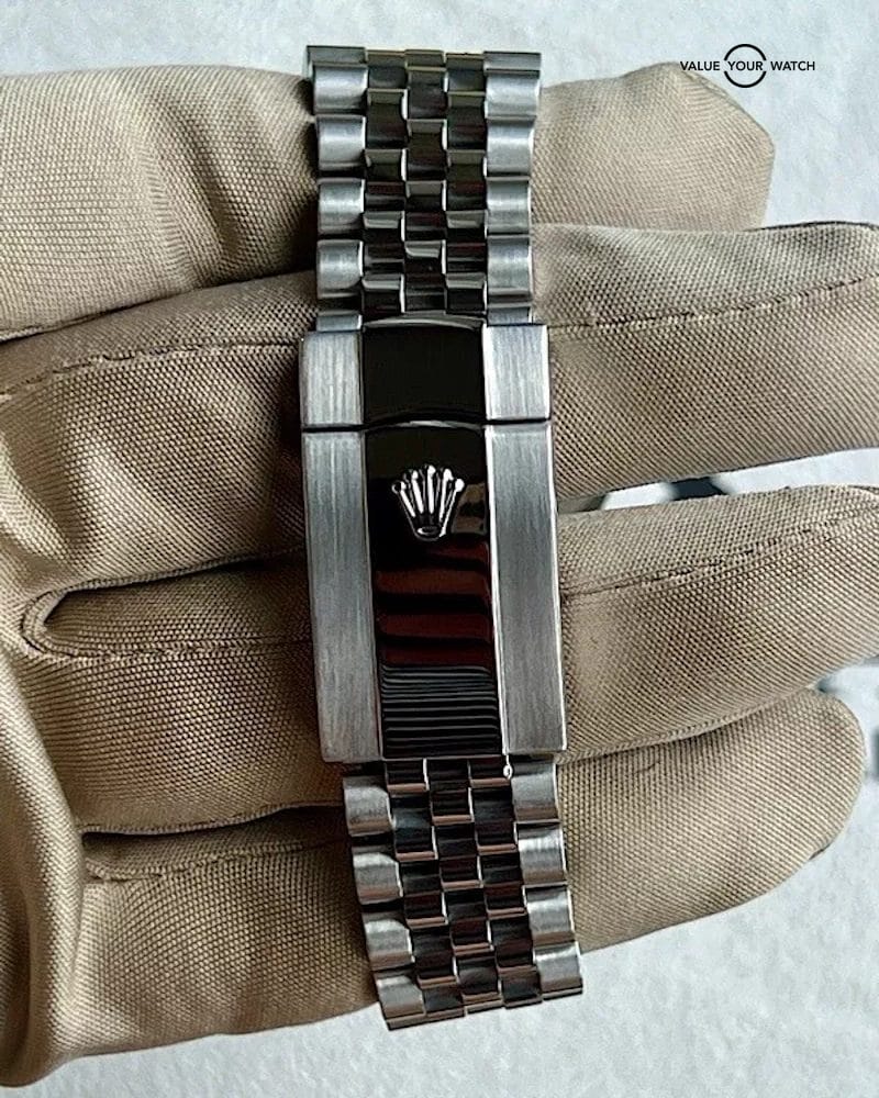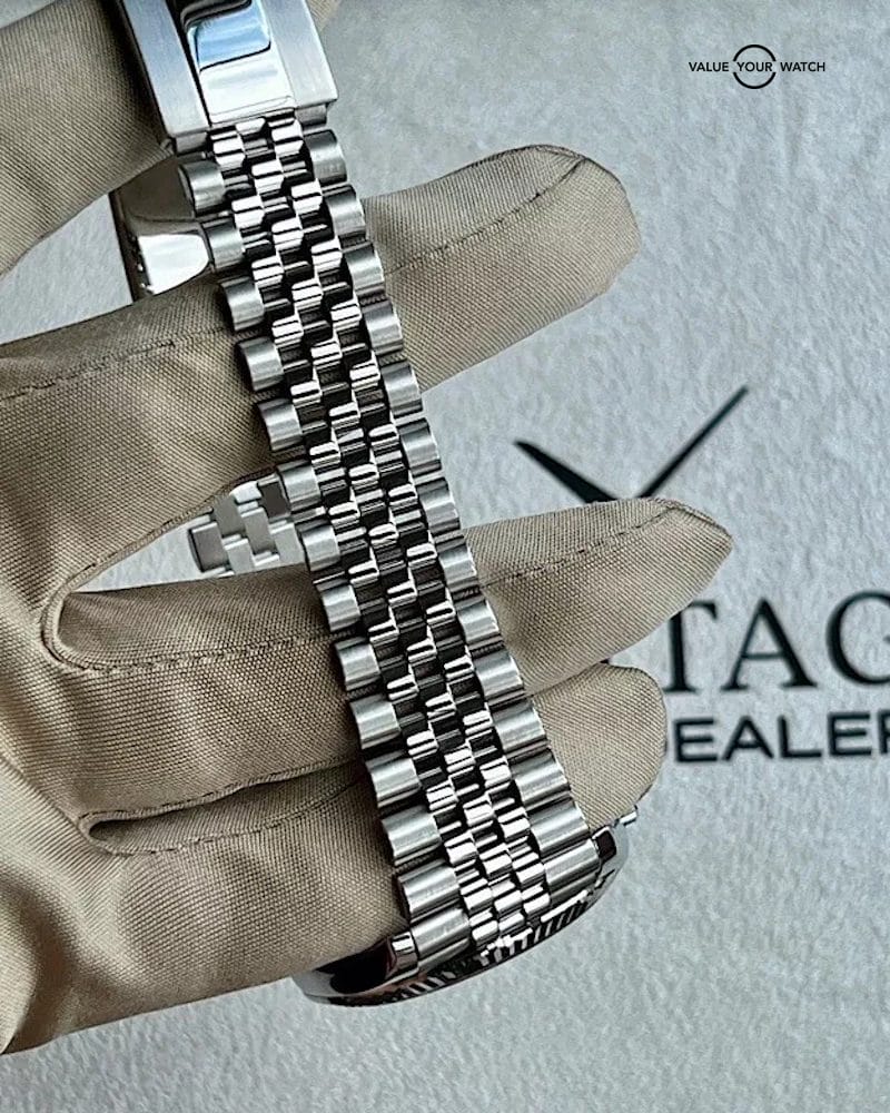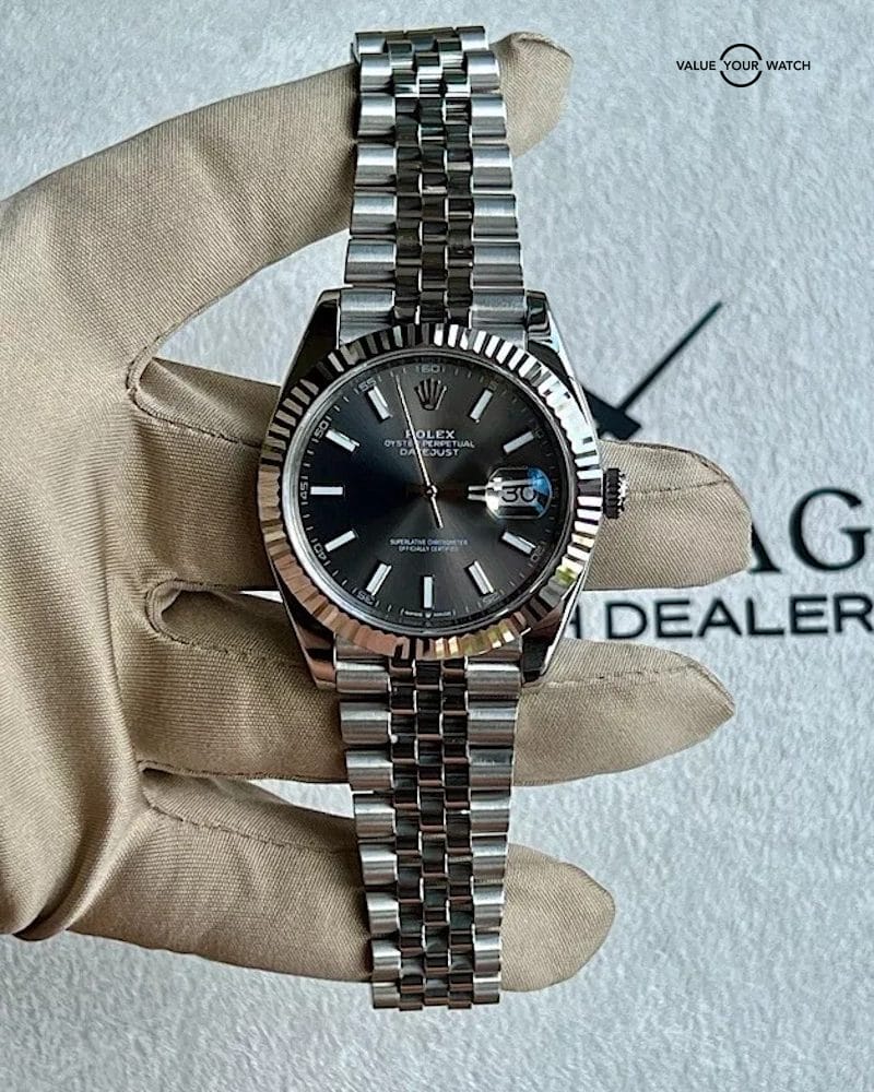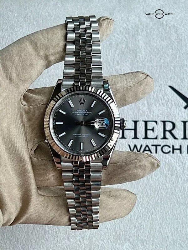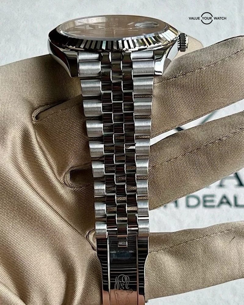 This stunning Rolex Datejust wristwatch is a luxurious accessory suitable for any occasion. With a 41mm stainless steel case and slate jubilee bracelet, this watch exudes classic elegance. The fluted bezel adds a touch of sophistication, while the luminous indexes and hands provide easy readability.