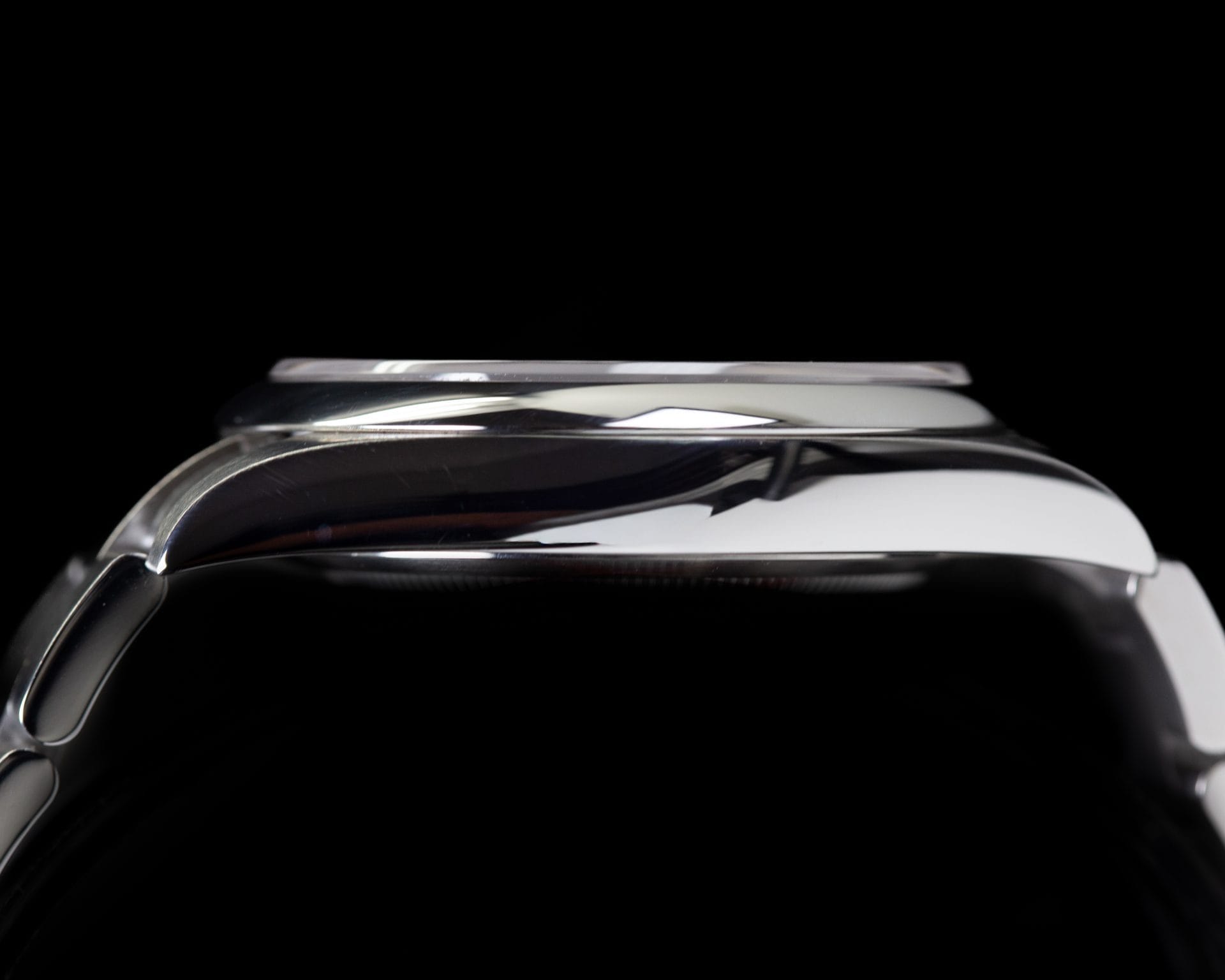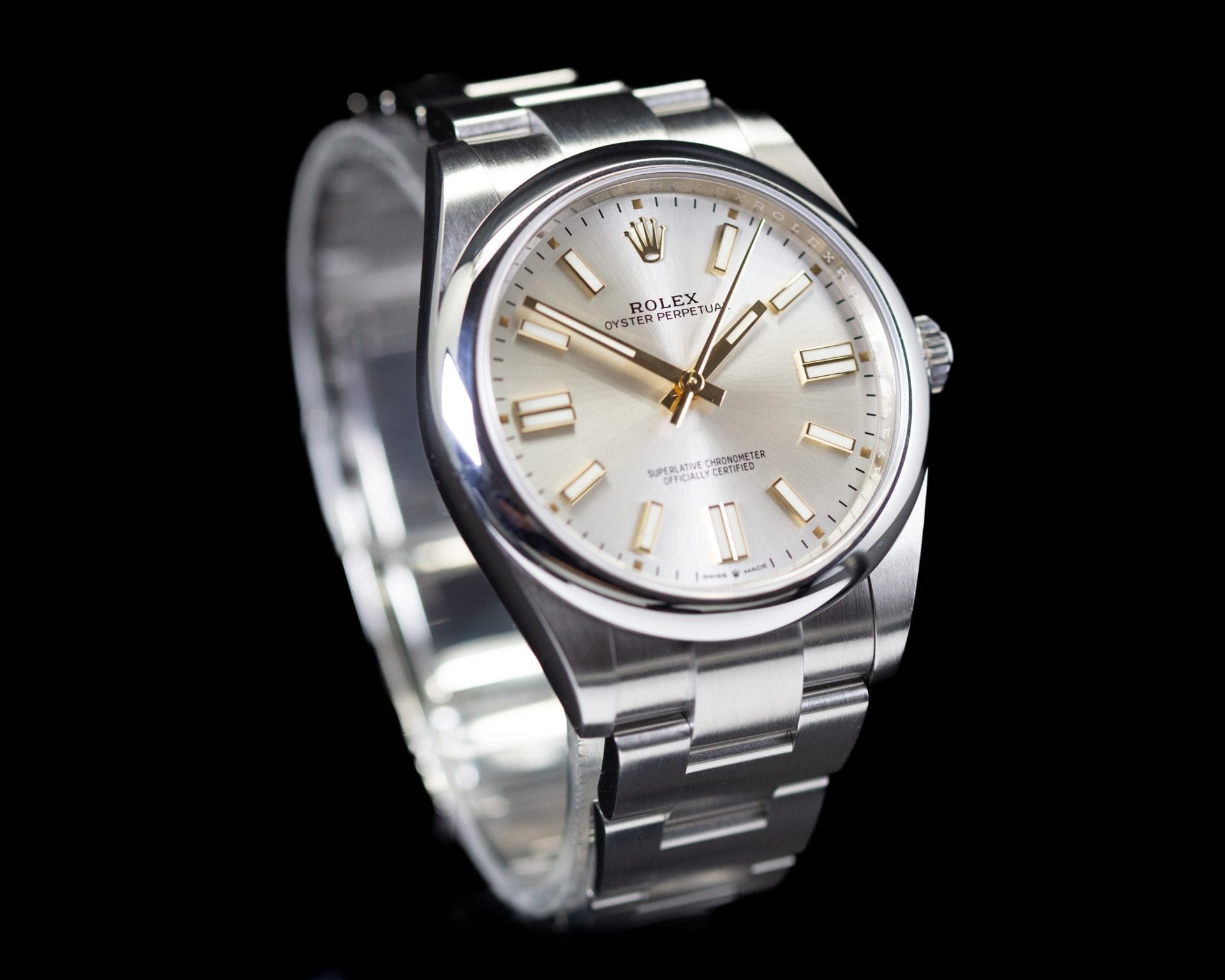 This model features a 41mm stainless steel case with a smooth polished bezel, paired with a refined silver dial that offers a minimalist and elegant look. The dial’s simplicity, free of a date window, enhances symmetry and legibility, making it an ideal everyday timepiece.