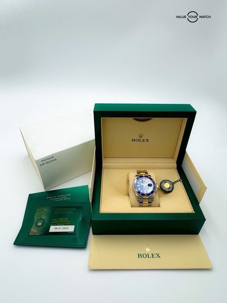 Guide to Buying and Selling Rolex Submariner Bluesy Two Tone Gold 126613LB 41mm Complete Set Mint 2022 Card Online