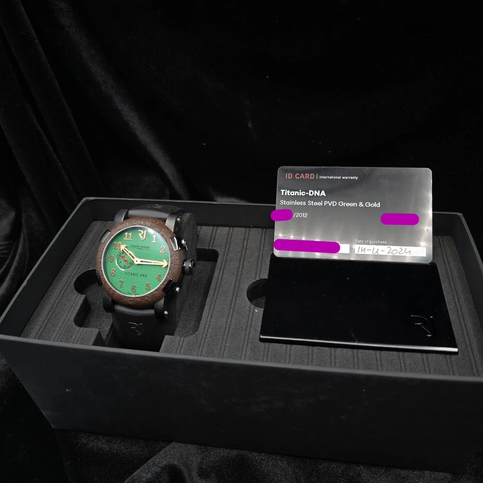 Specification: Romain Jerome Titanic DNA, 46mm Black PVD steel w textured Green dial. Full set!