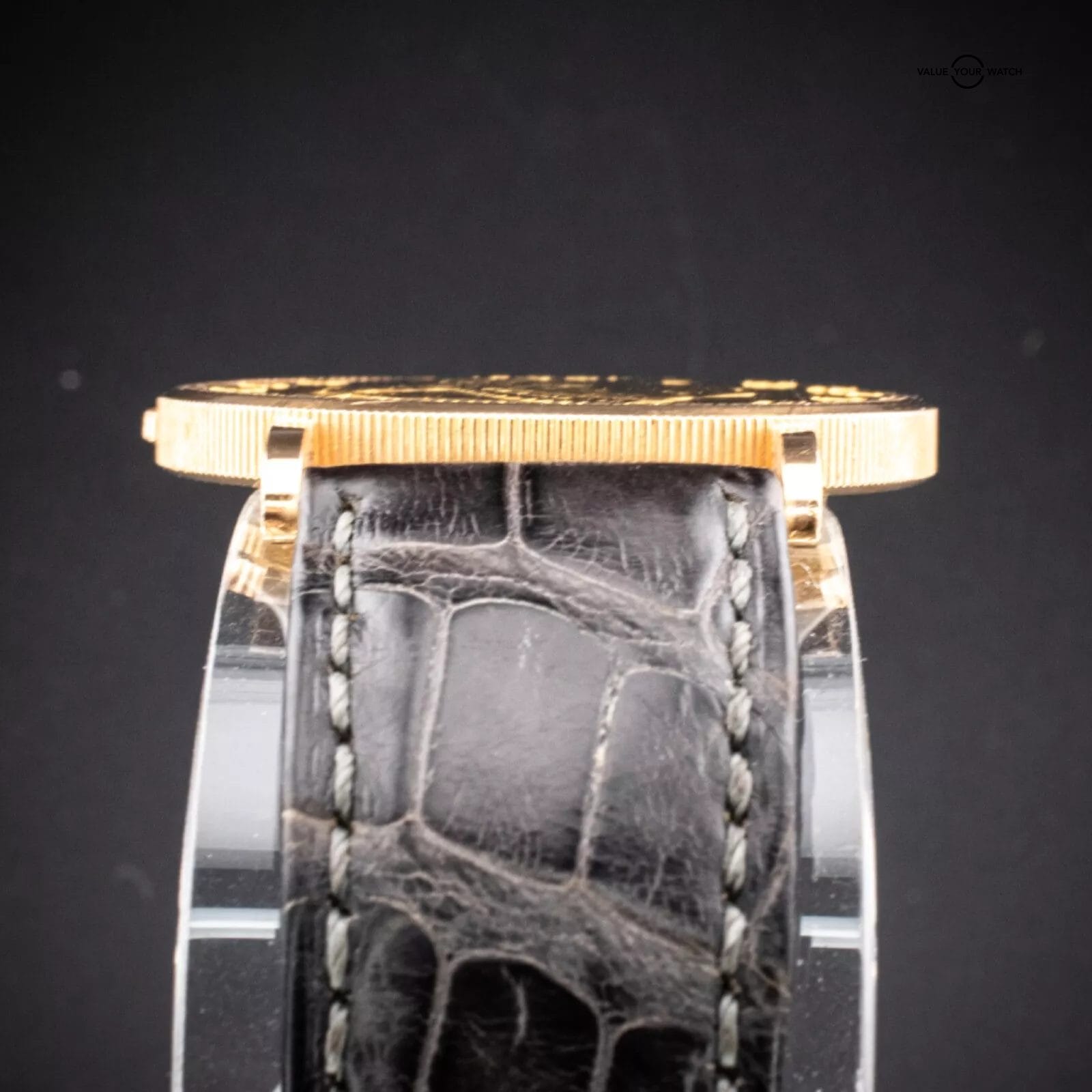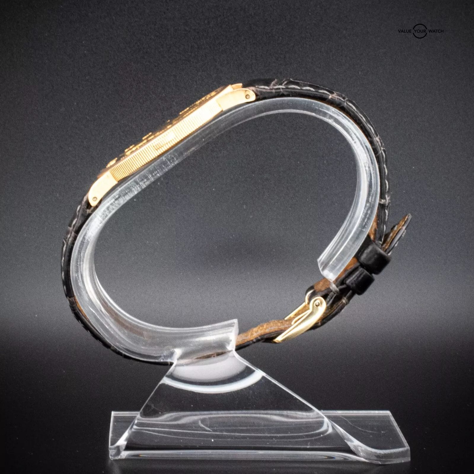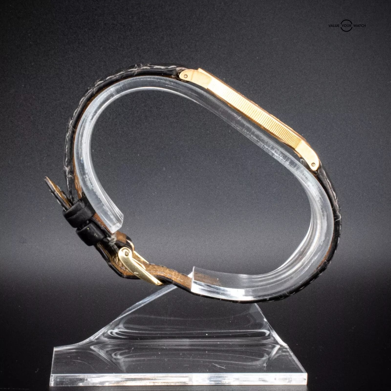 Strap: Black leather strap, aftermarket with gold-tone buckle