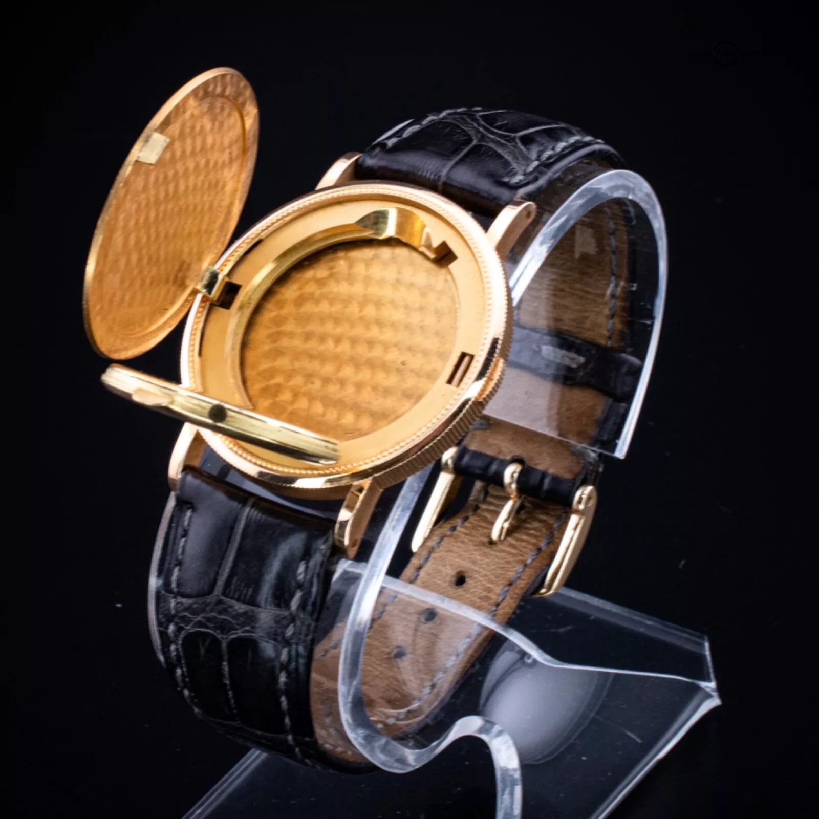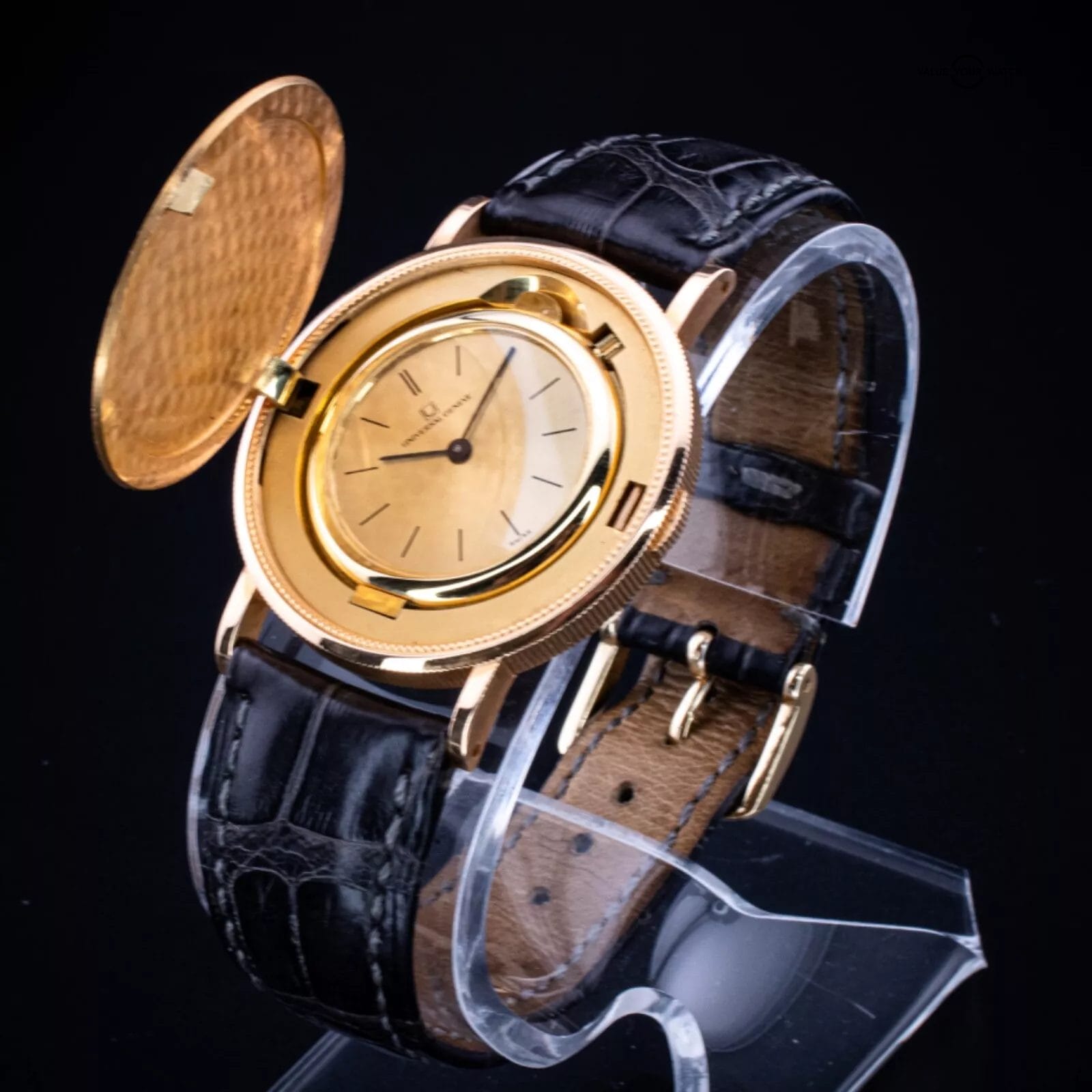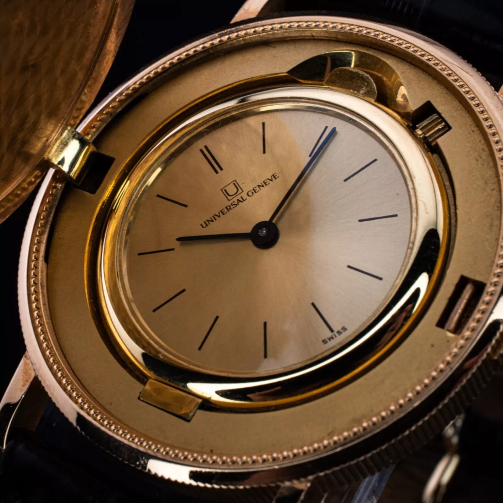 Dial: Hidden under the hinged case, minimalist gold dial with simple hands