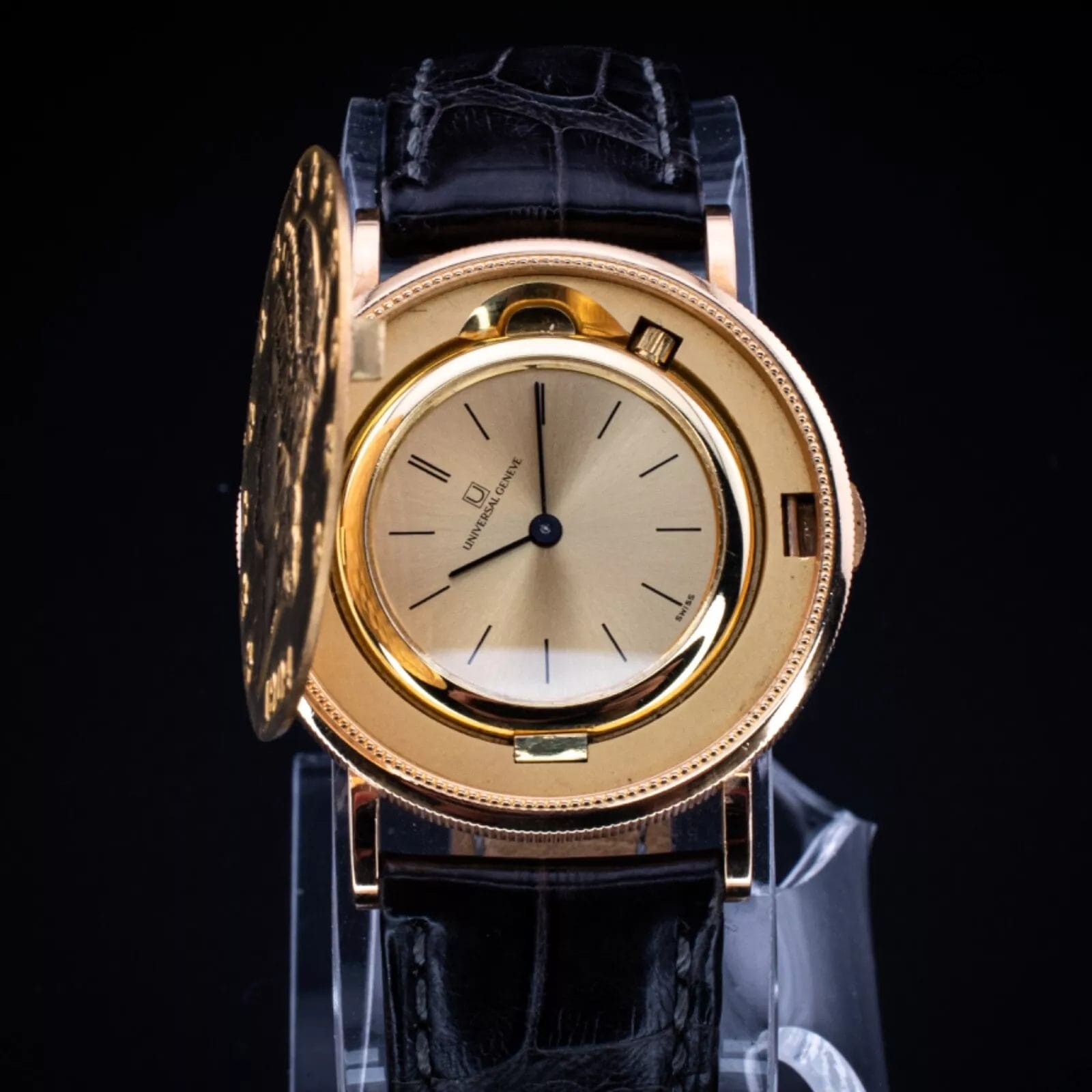 This Universal Genève $20 Gold Coin Watch is a rare masterpiece that combines the elegance of fine watchmaking with the allure of a historic U.S. $20 gold coin. The ingenious design integrates the watch movement within an authentic gold coin, creating a truly unique and collectible timepiece.