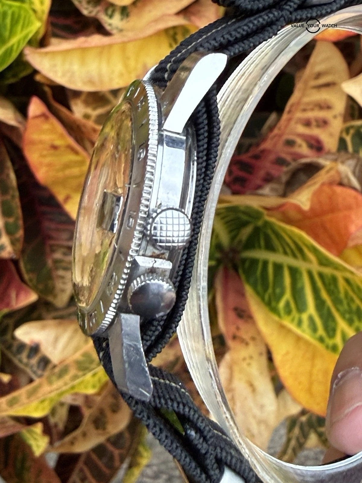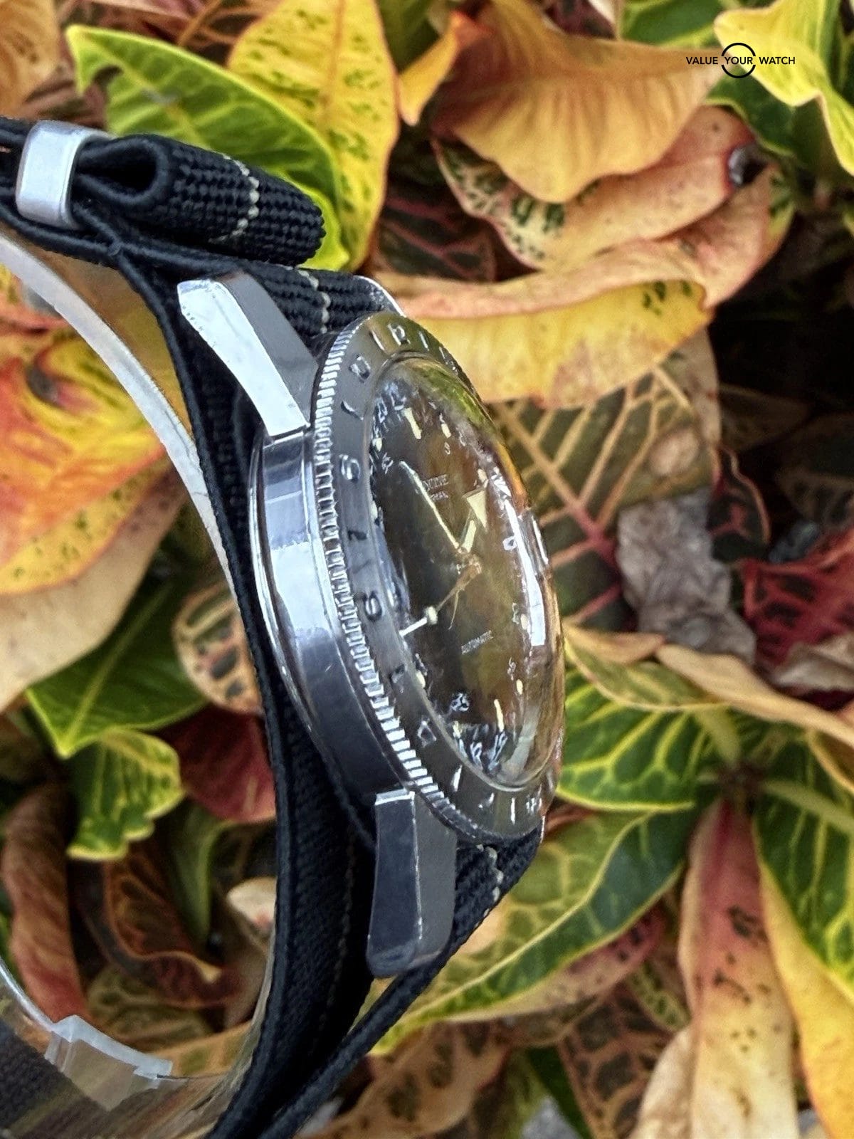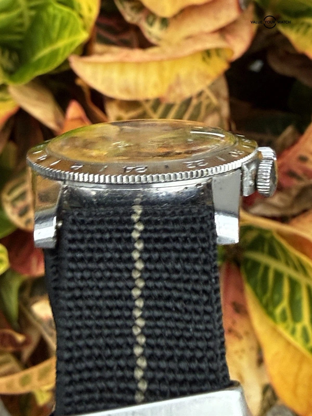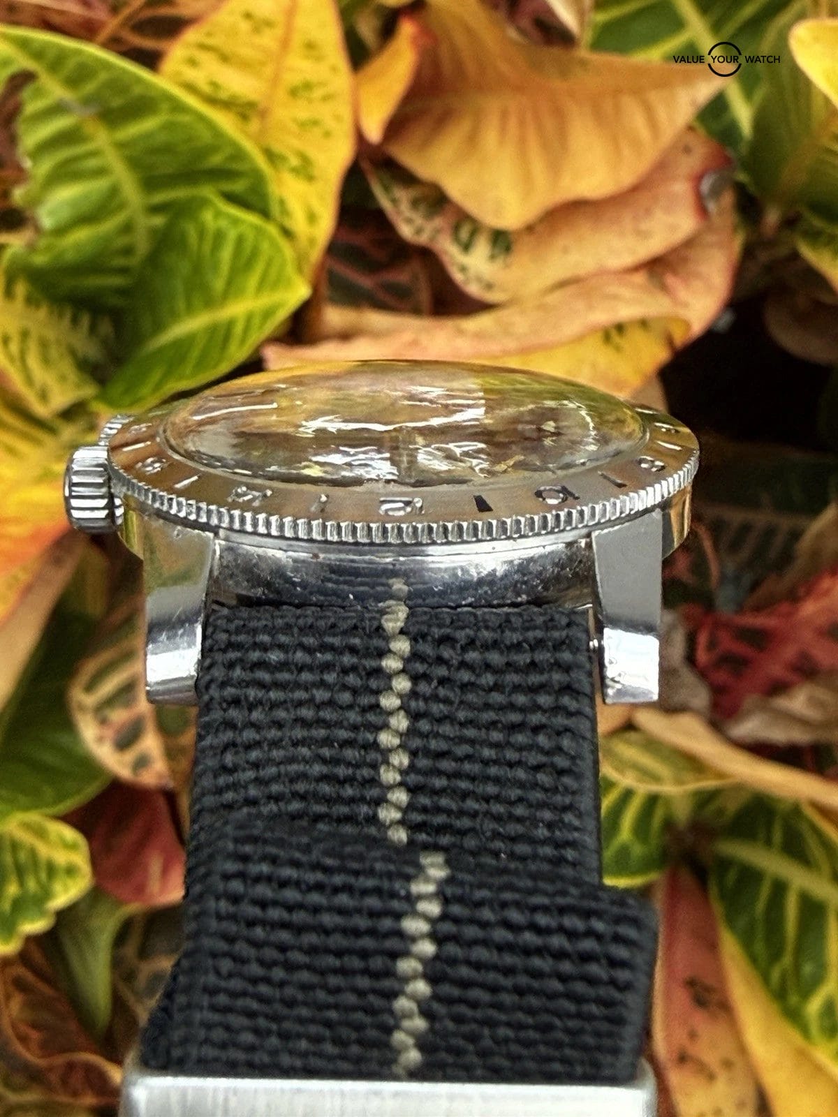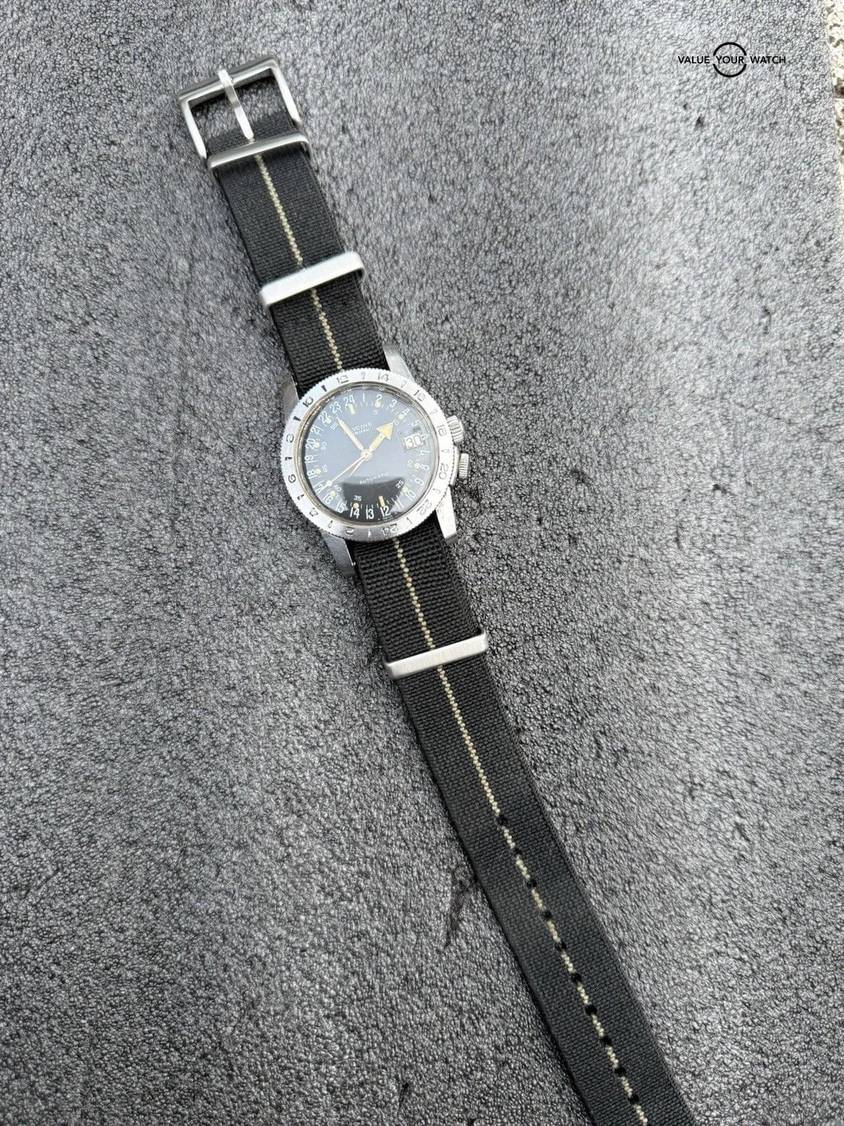 Stretchy NATO strap is used and shows signs of wear. Not original to the watch.