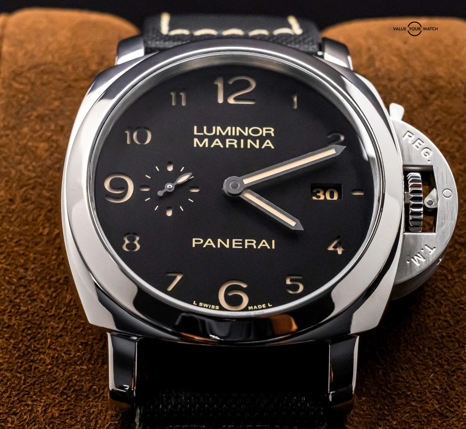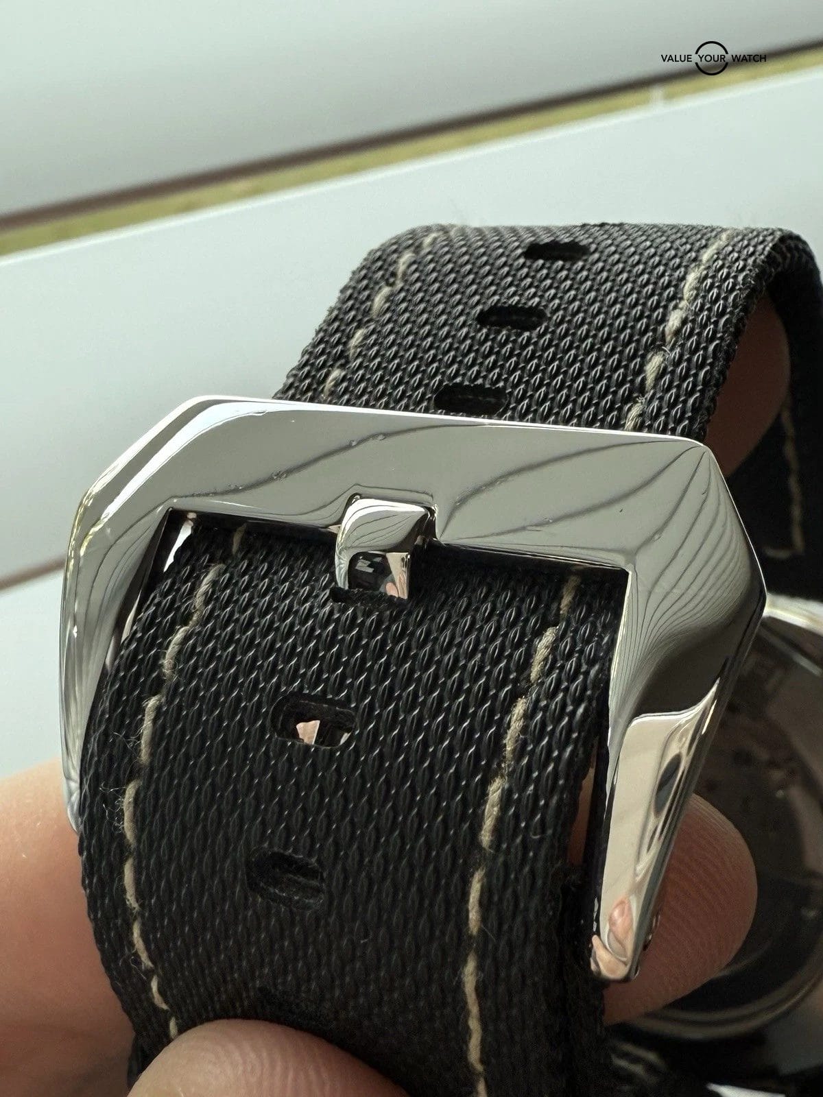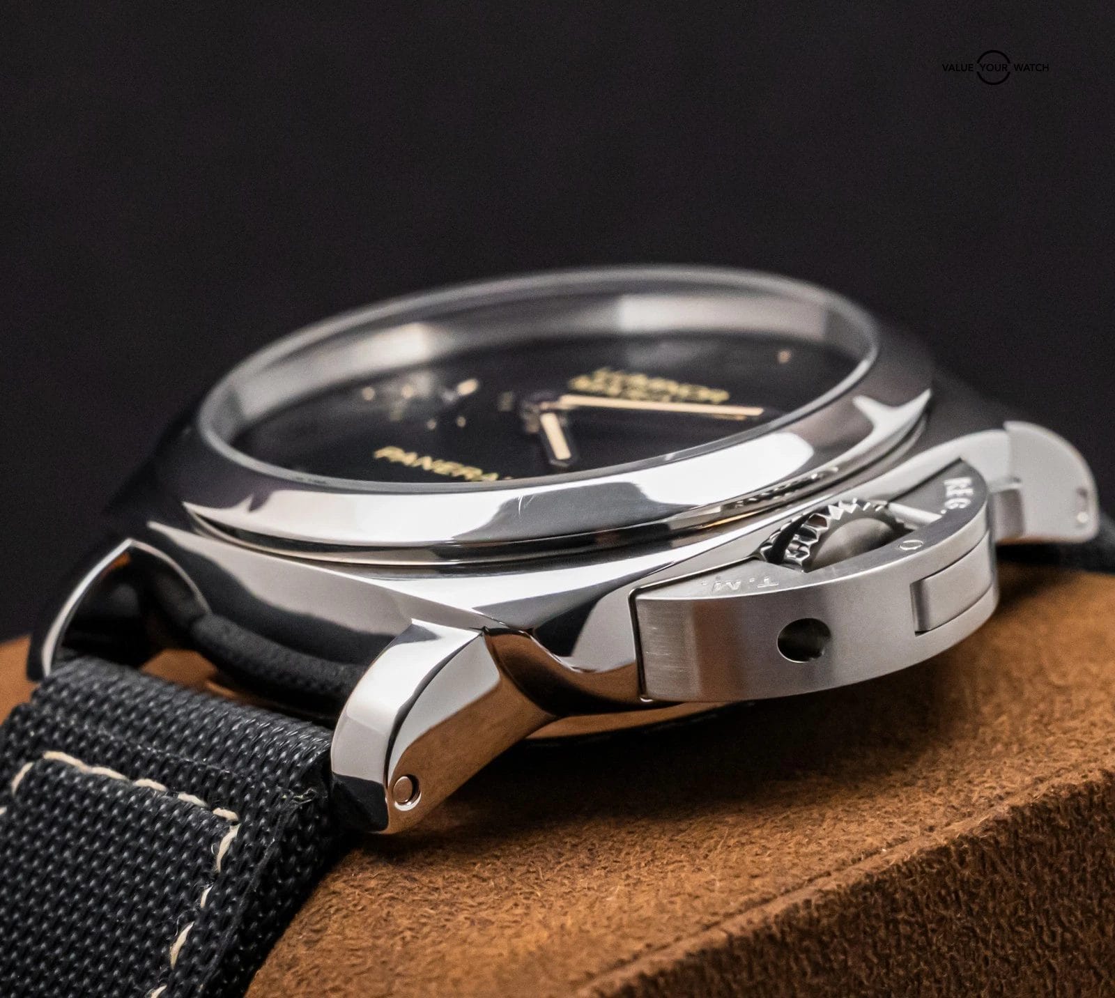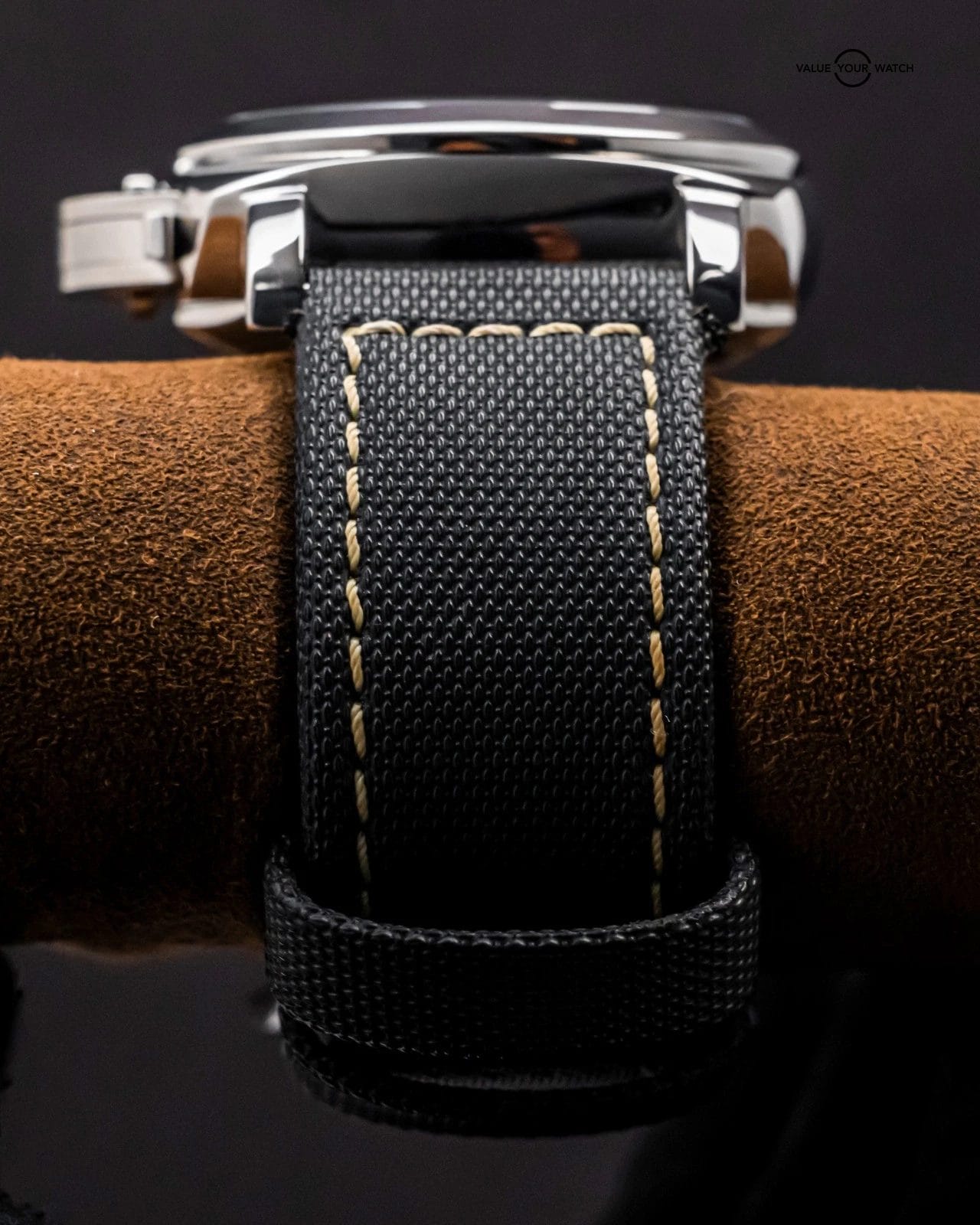 STUNNING Panerai 359 Luminor Marina 1950 3 Days Automatic 44 mm in Stainless Steel with Black Dial on Aftermarket Black Canvas Leather Strap & Clasp! Arrives as watch only and with a “M” Serial, denoting 2010 production at Panerai. The 359 is an iconic model at a killer price point!