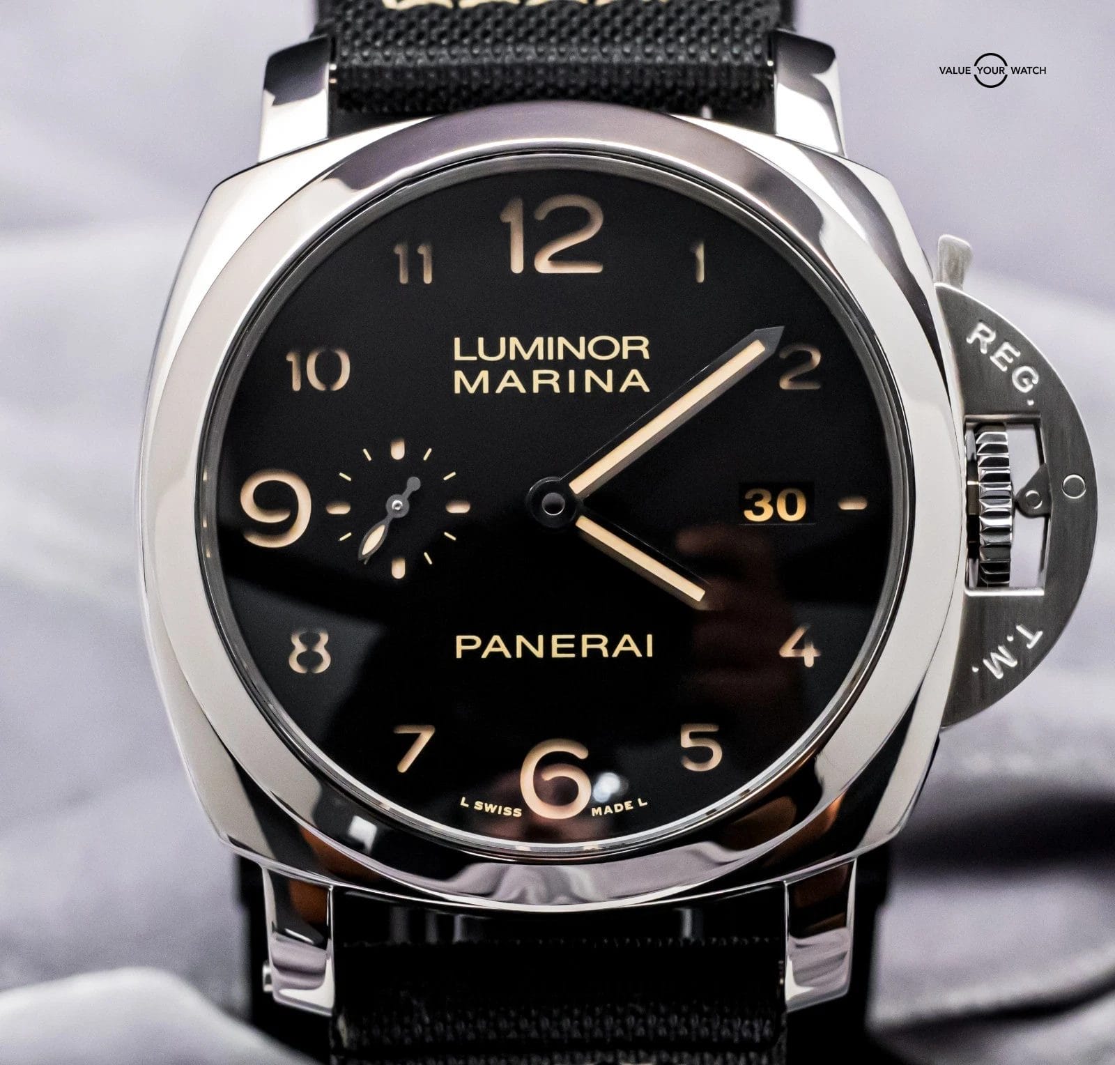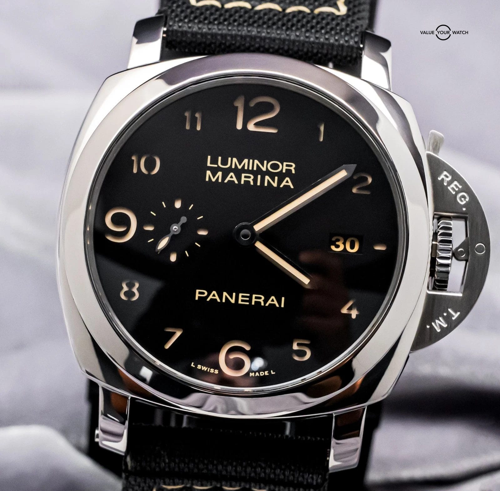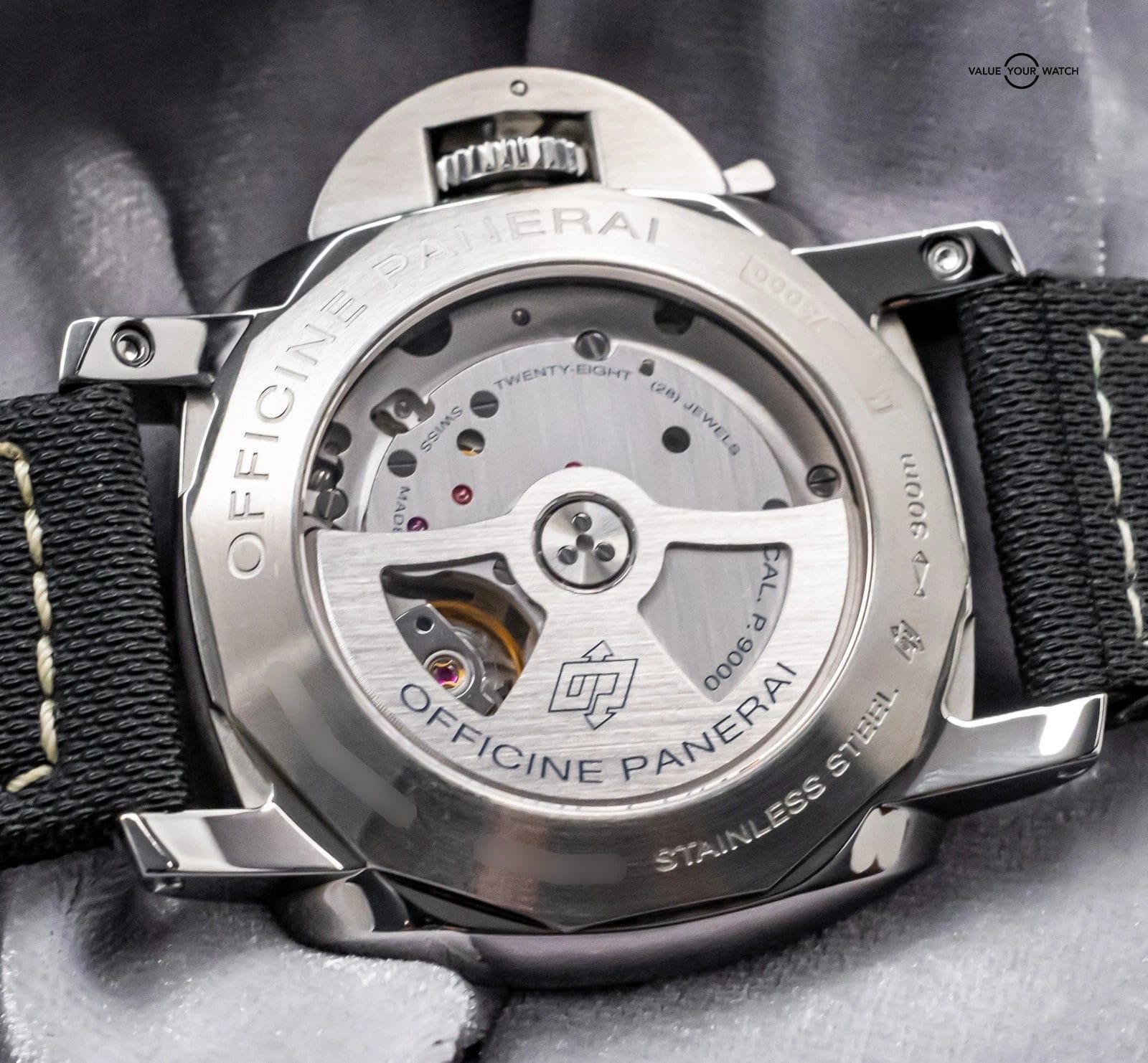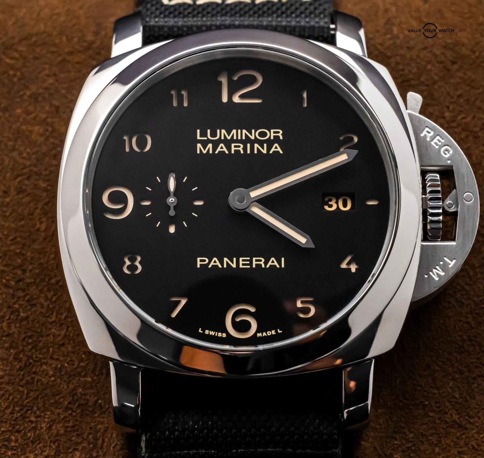 STUNNING Panerai 359 Luminor Marina 1950 3 Days Automatic 44 mm in Stainless Steel with Black Dial on Aftermarket Black Canvas Leather Strap & Clasp! Arrives as watch only and with a “M” Serial, denoting 2010 production at Panerai. The 359 is an iconic model at a killer price point!