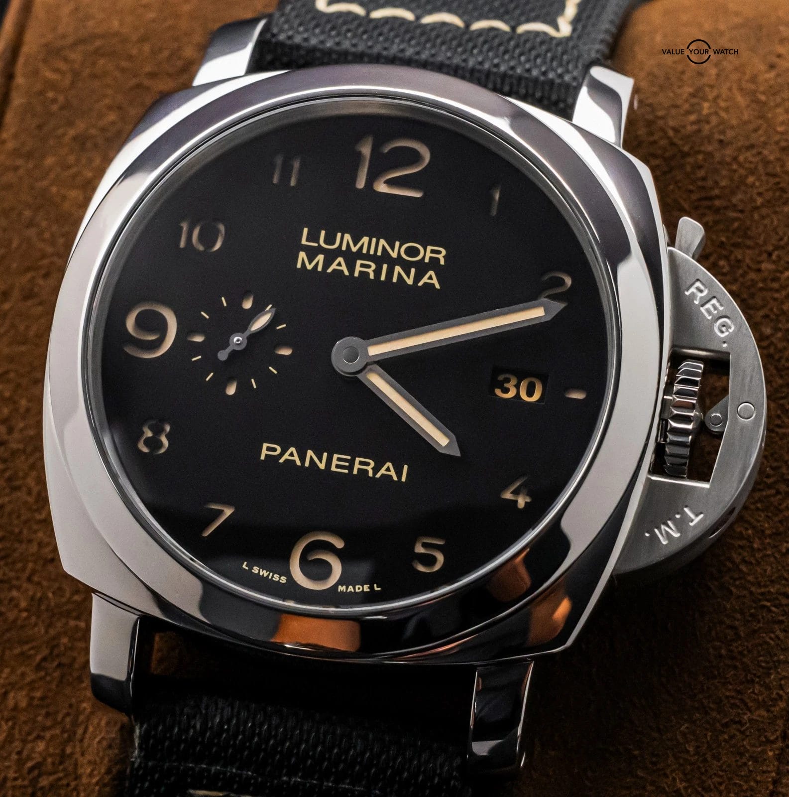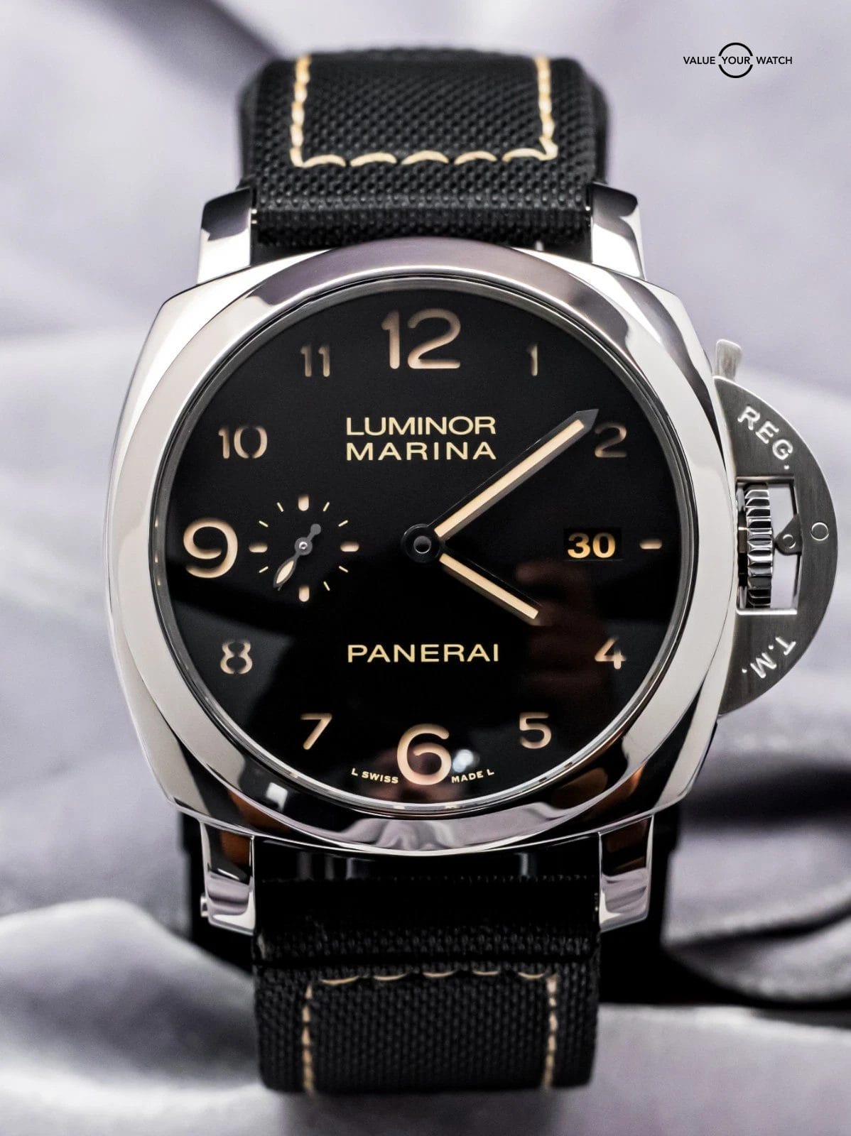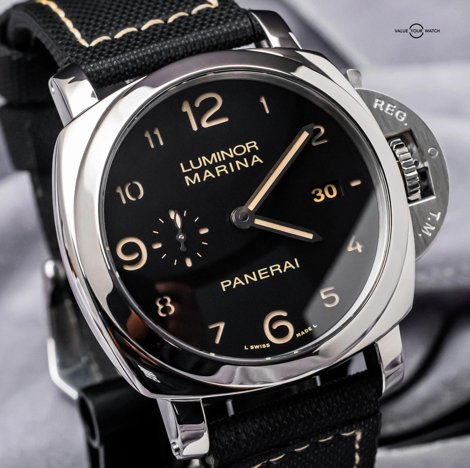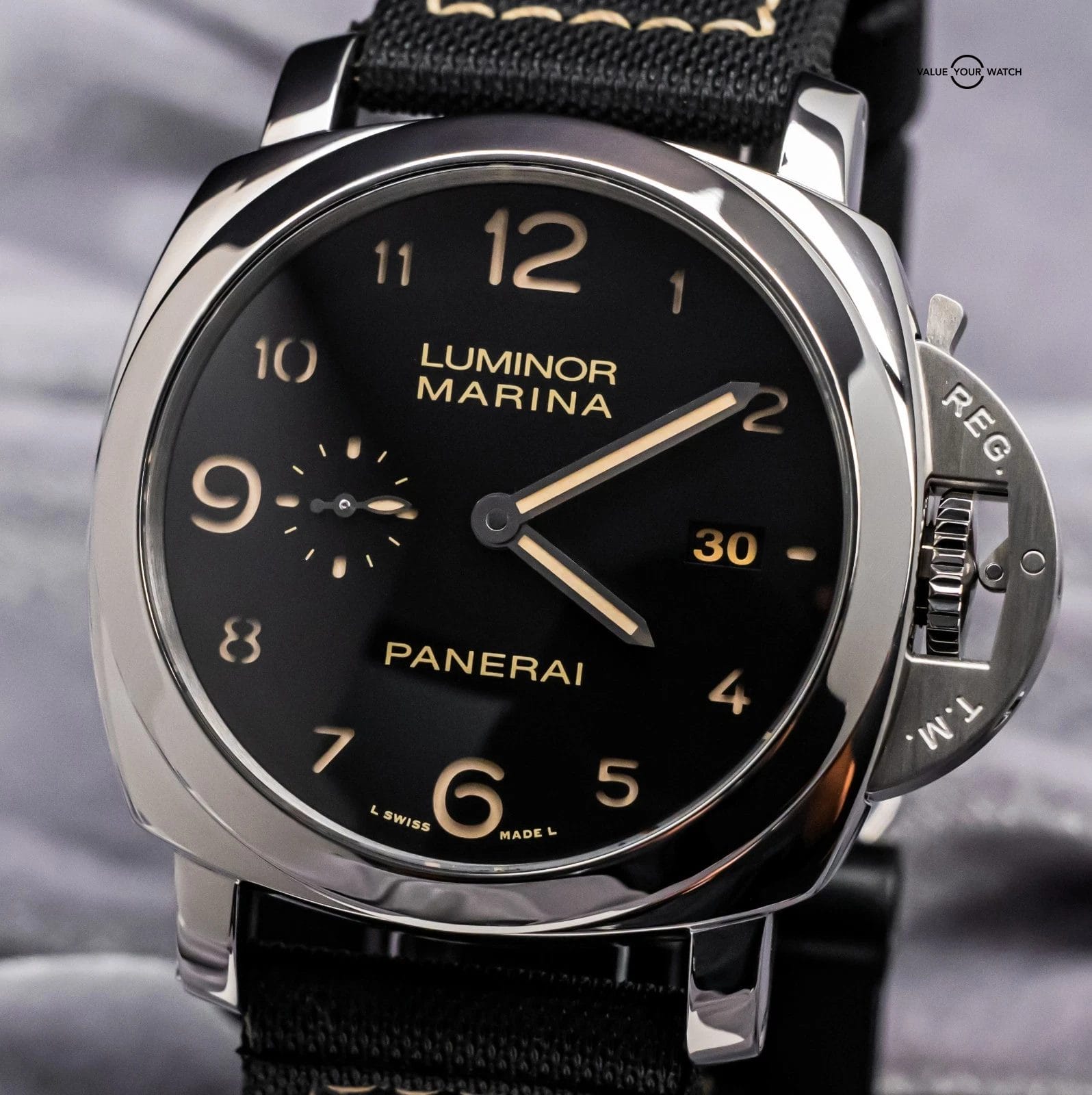 STUNNING Panerai 359 Luminor Marina 1950 3 Days Automatic 44 mm in Stainless Steel with Black Dial on Aftermarket Black Canvas Leather Strap & Clasp! Arrives as watch only and with a “M” Serial, denoting 2010 production at Panerai. The 359 is an iconic model at a killer price point!