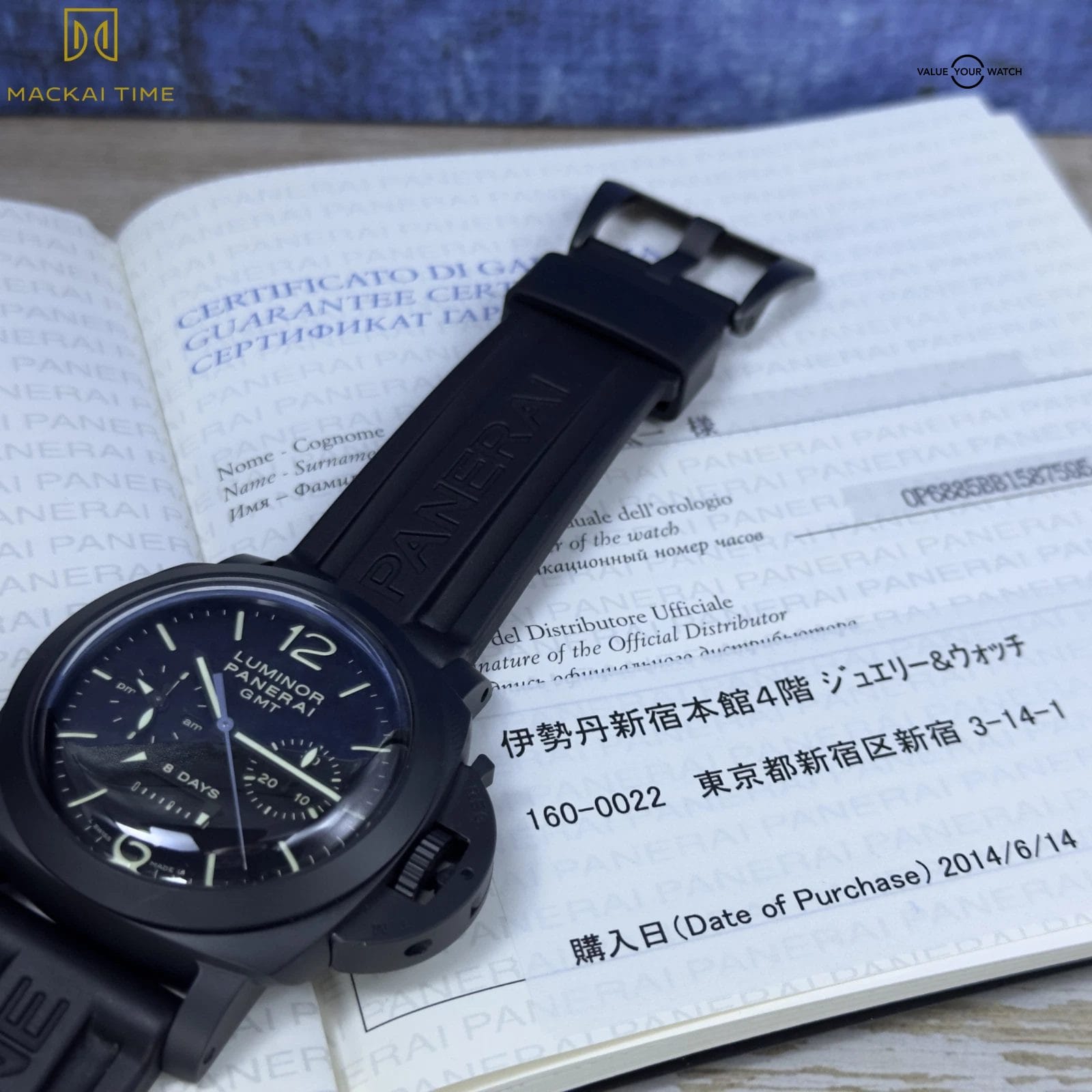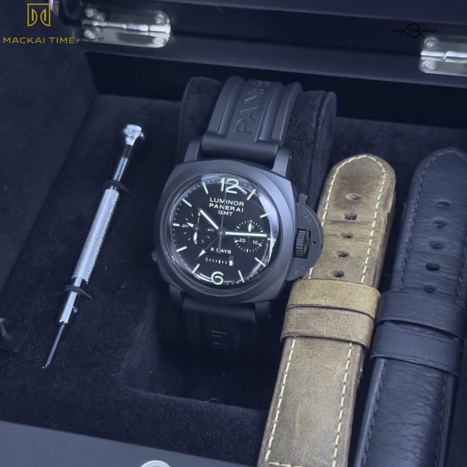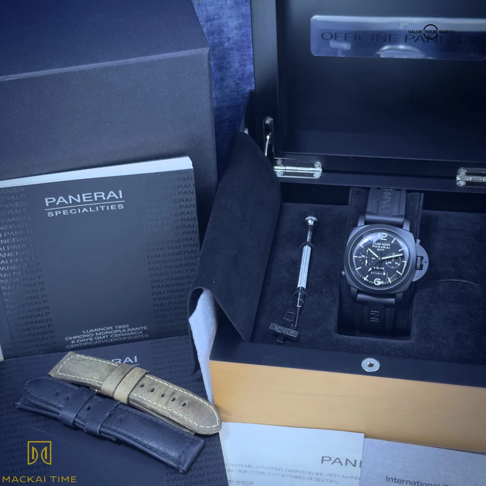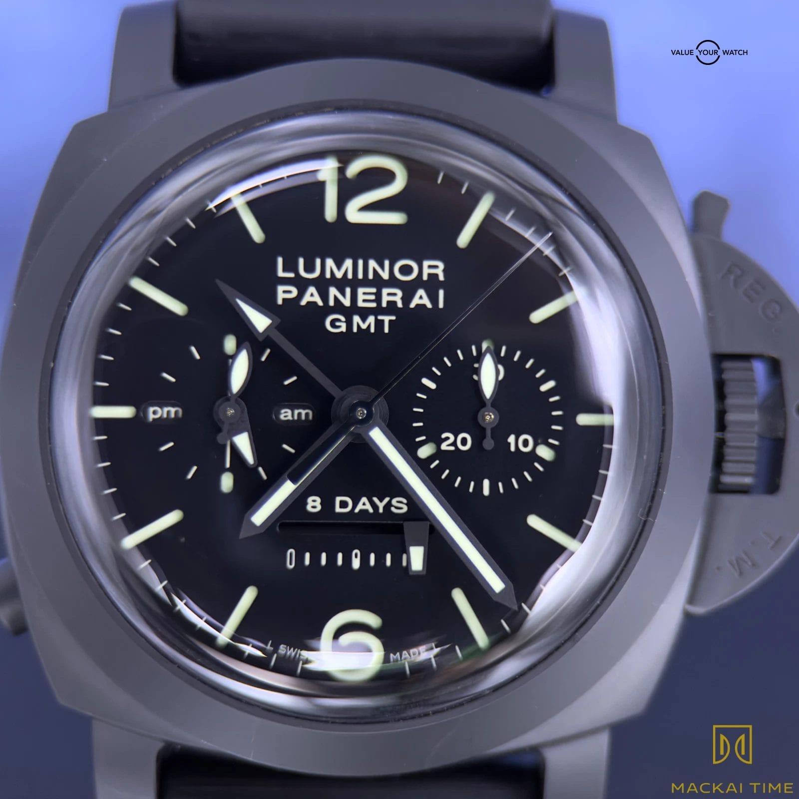 This is the Panerai Luminor 1950 8 Days Monopulsante GMT PAM 00317 Ceramica. A bold and technically advanced timepiece that embodies the essence of Panerai innovation. Crafted from matte black ceramic, it’s durable, stealthy, and elegant. The signature 44mm Luminor 1950 case and sandwich dial delivers unmistakable presence on the wrist.